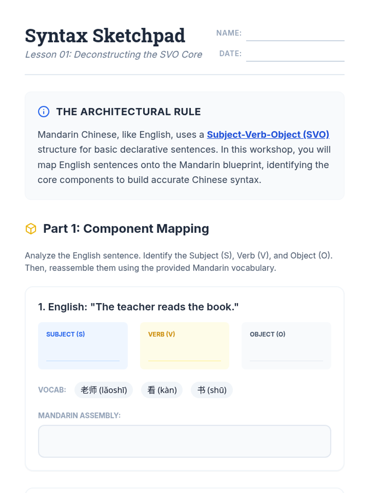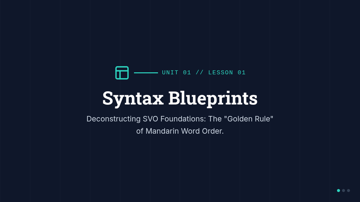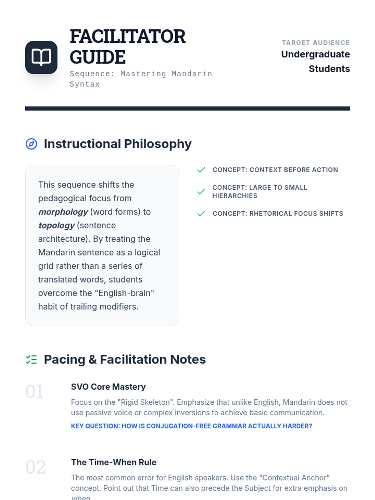 A rigorous analysis of Mandarin sentence structure, moving students from SVO assumptions to the Time-Location-Action hierarchy (STPVA). Students master word order rules, learn the Topic-Comment structure, and develop editing skills to eliminate 'Chinglish' syntactic errors.