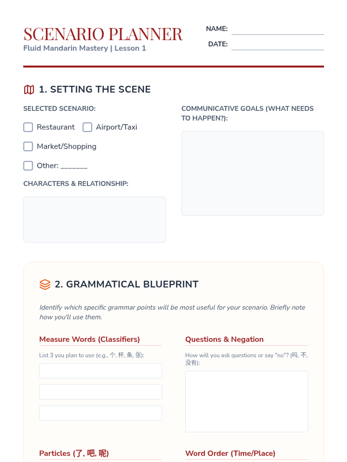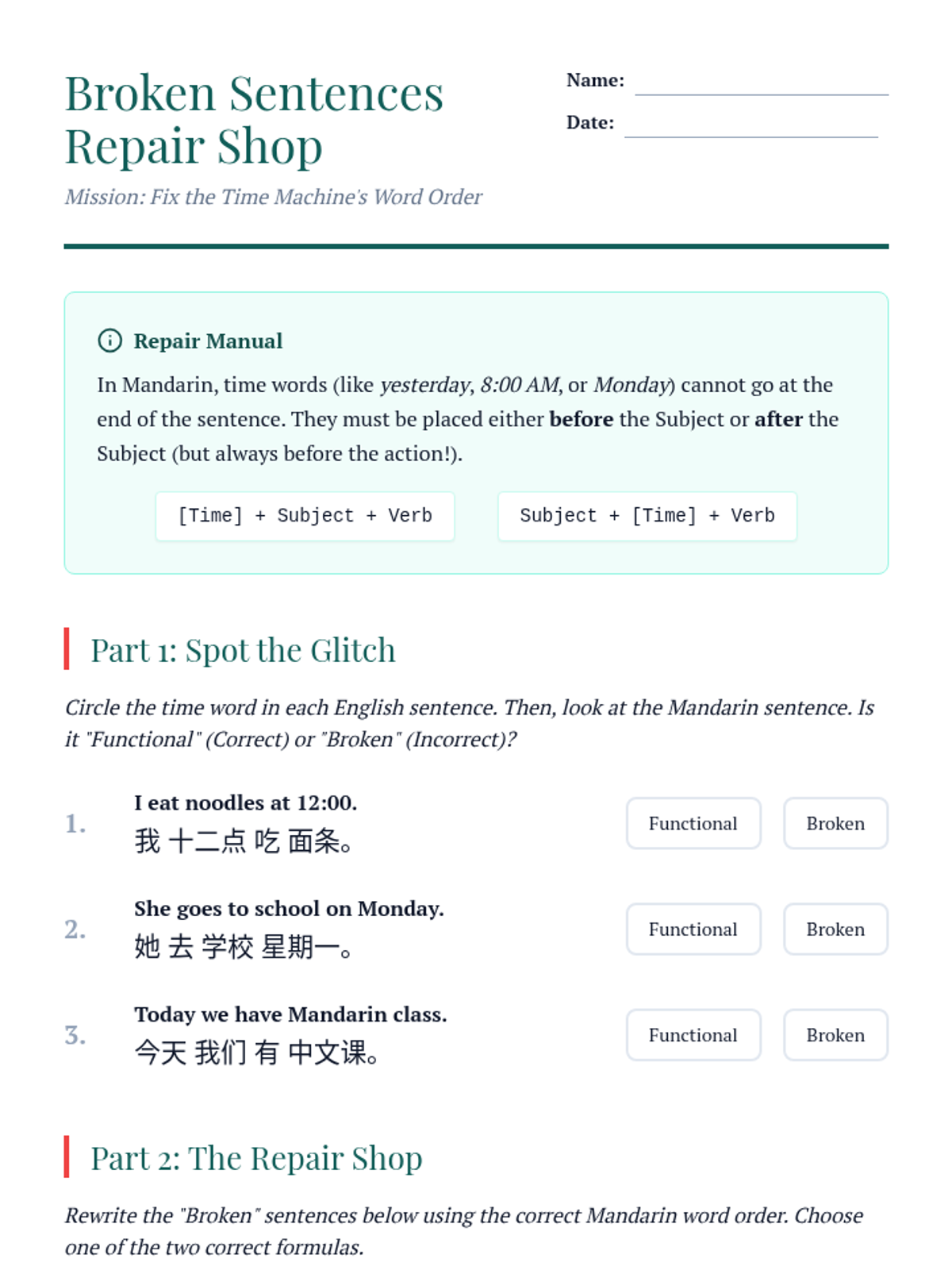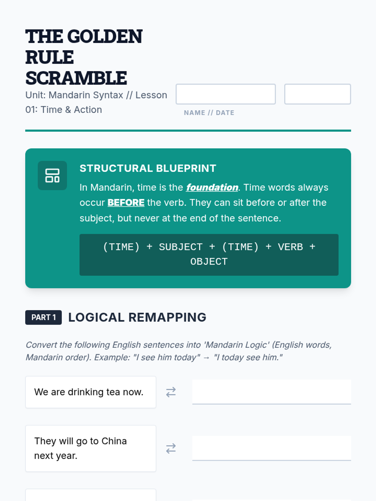 A rigorous analysis of Mandarin sentence structure, moving students from SVO assumptions to the Time-Location-Action hierarchy (STPVA). Students master word order rules, learn the Topic-Comment structure, and develop editing skills to eliminate 'Chinglish' syntactic errors.