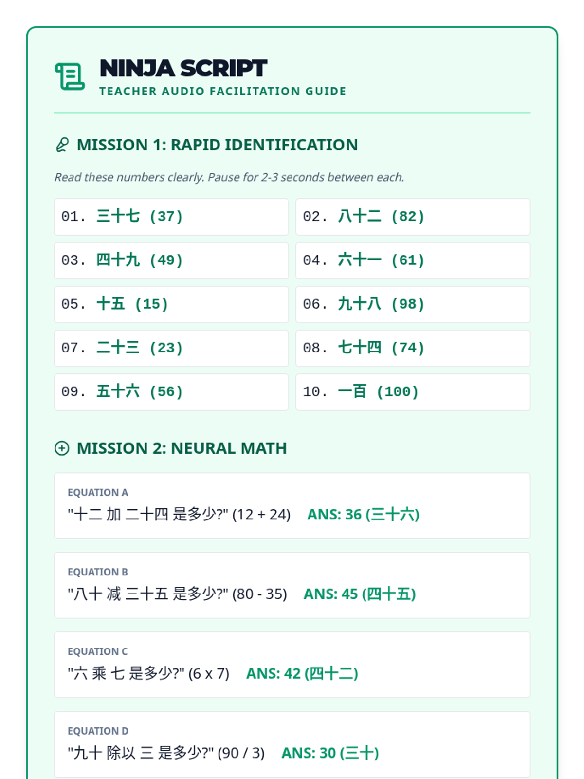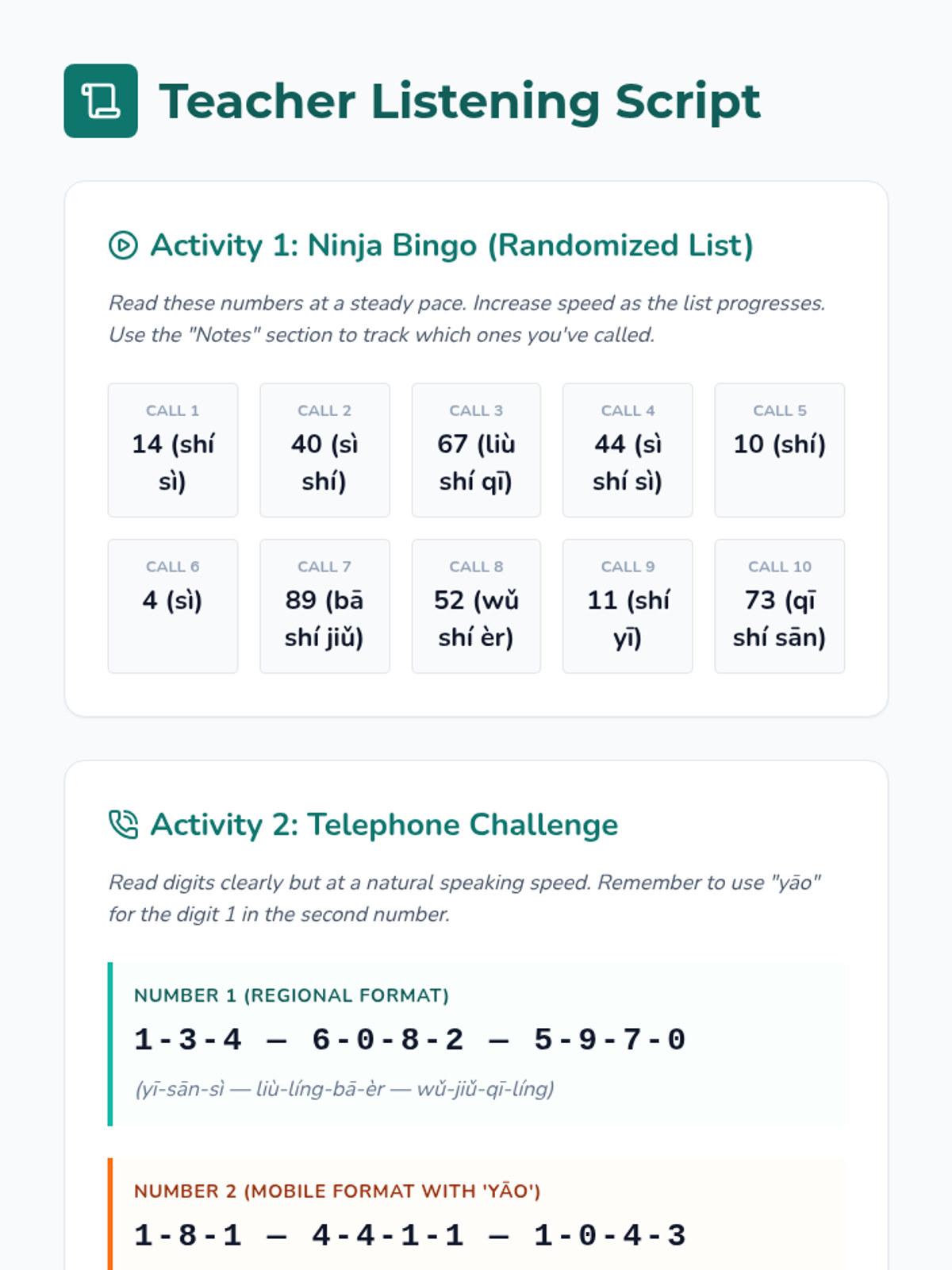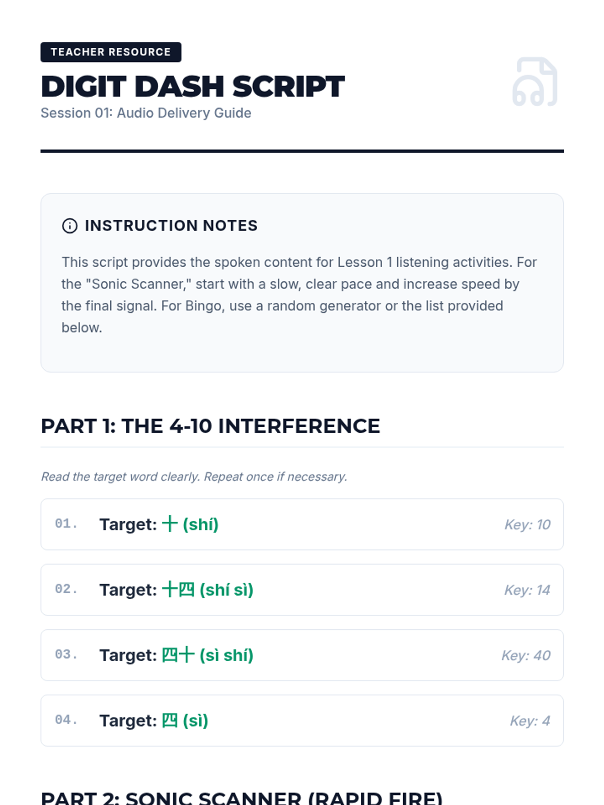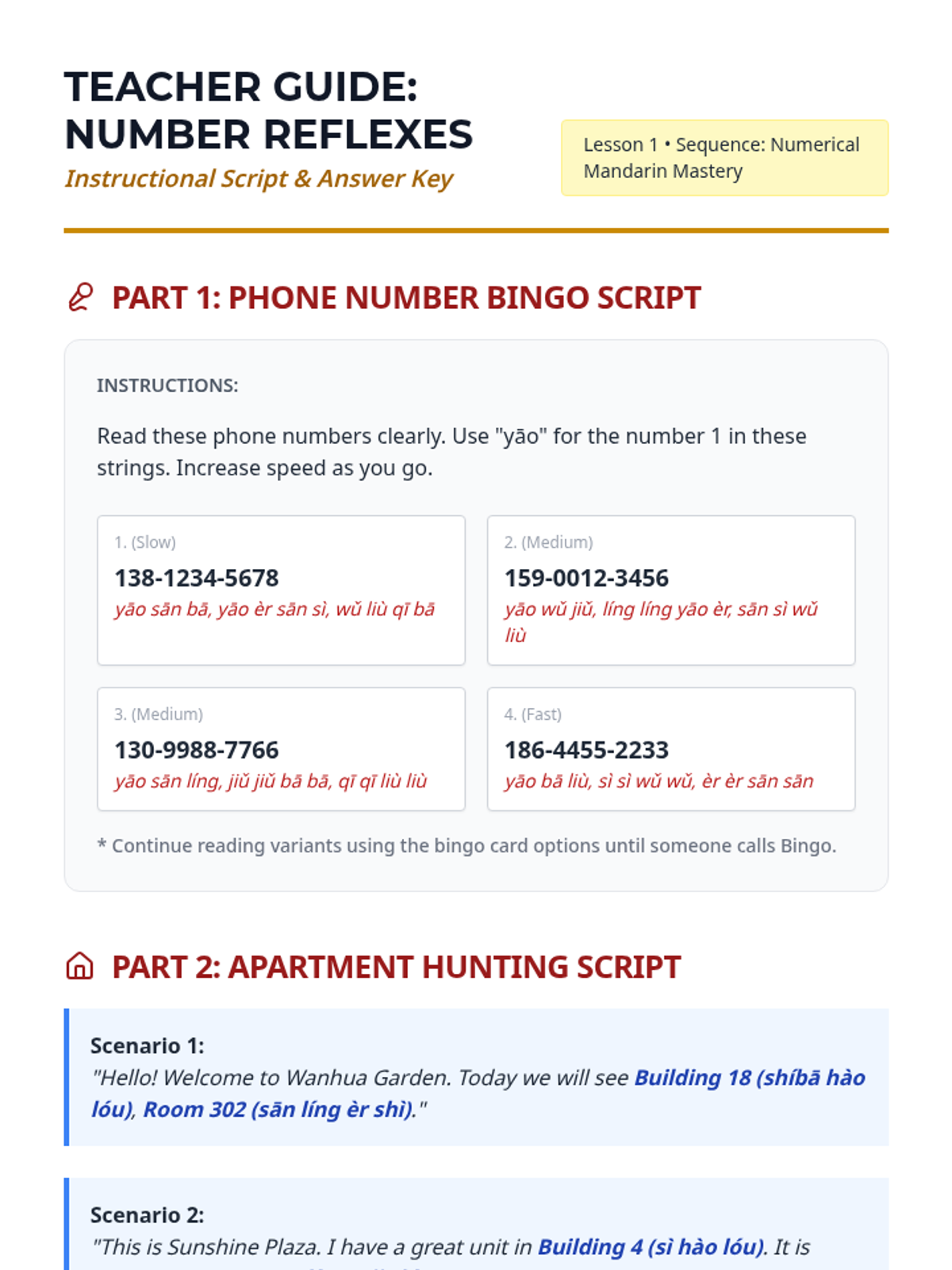 A comprehensive sequence for beginner Mandarin learners focusing on processing numerical data, dates, time, and currency through rapid-response listening activities and gamified simulations.