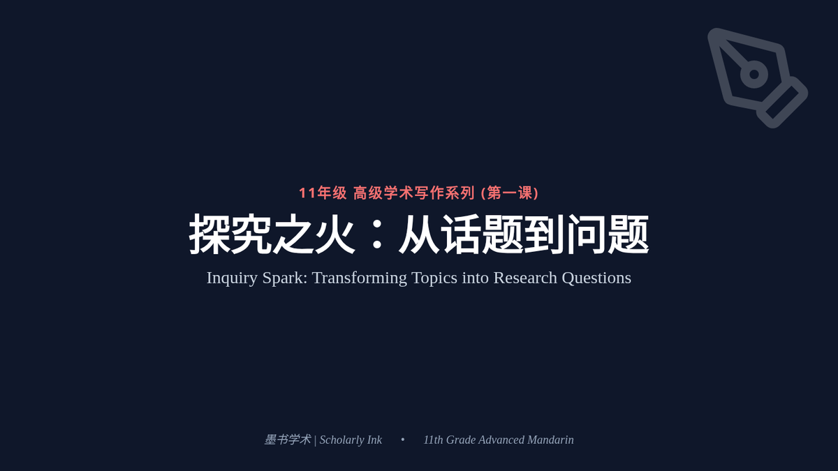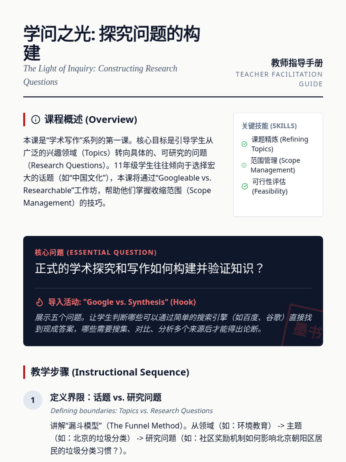 A college-readiness sequence for 11th Grade Advanced Mandarin students, focusing on the rigors of academic research, source synthesis, and formal composition in Chinese. Students progress from formulating inquiry-based questions to drafting structured research abstracts while mastering academic vocabulary and ethical citation.