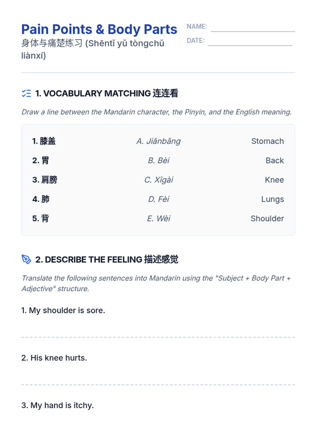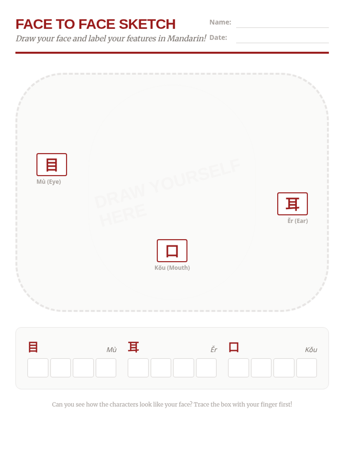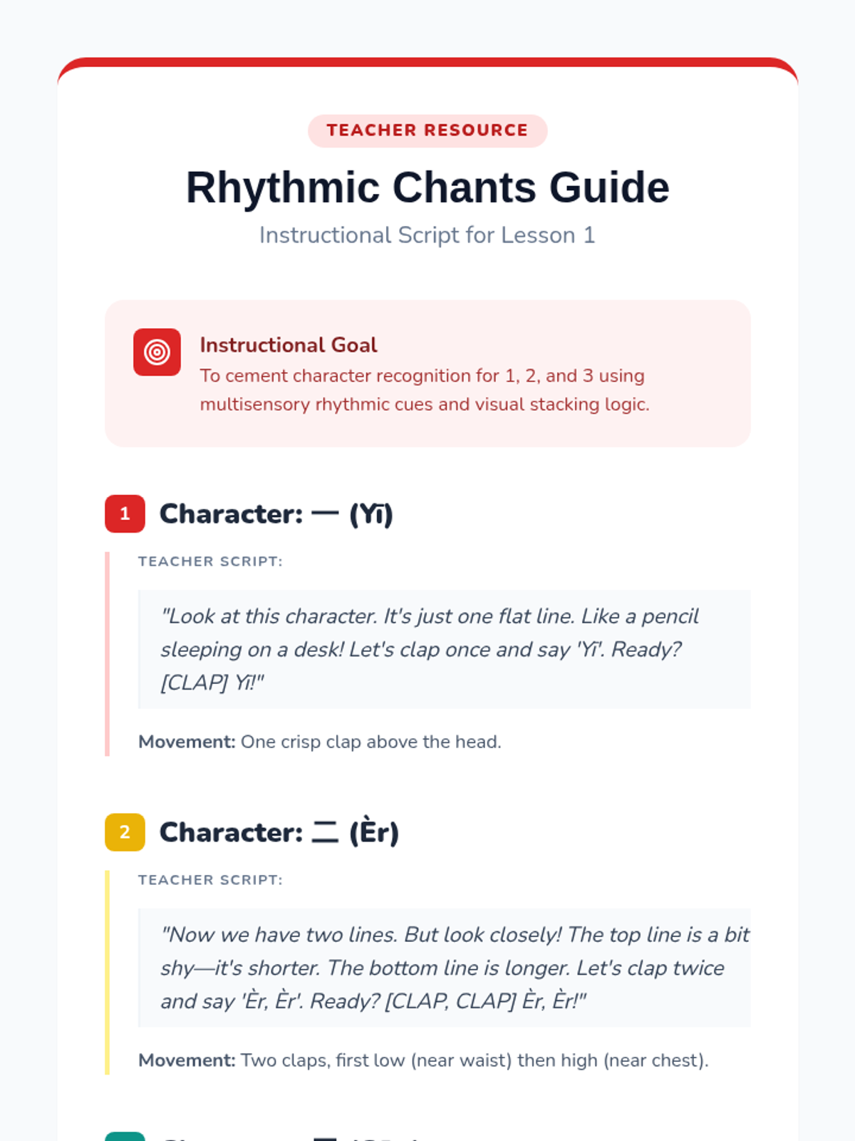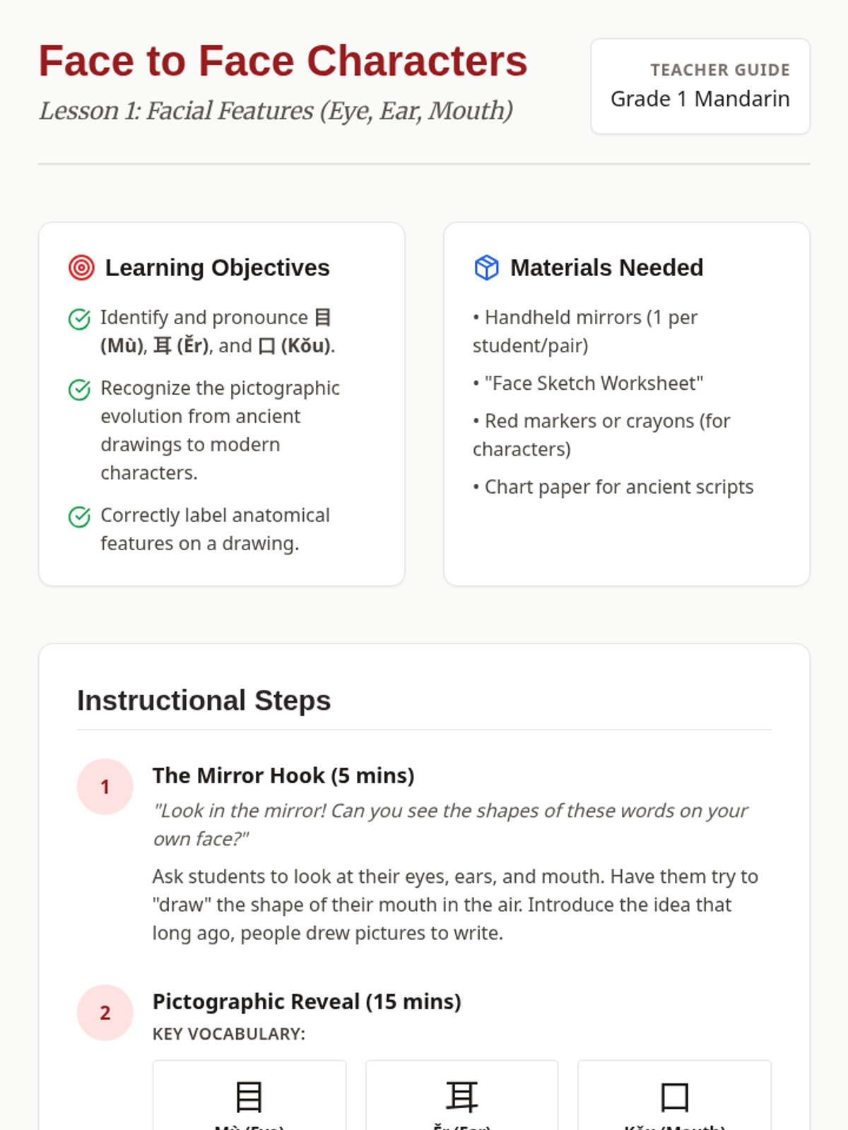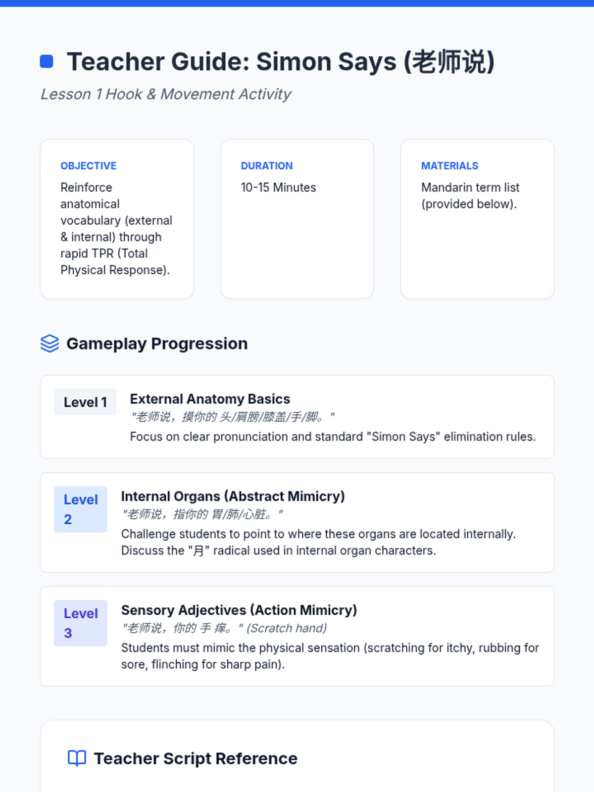 A physical-first Mandarin sequence for 1st graders focusing on body parts and action characters. Students use Total Physical Response (TPR) and pictographic analysis to connect written Hanzi to their own bodies and movements.