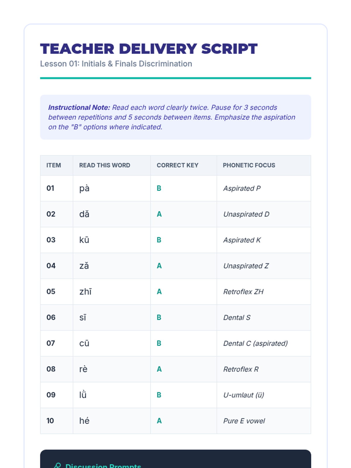 This sequence introduces 10th-grade students to the fundamentals of Mandarin Chinese phonetics, focusing on tone discrimination, initial/final differentiation, and transcription. Students progress from isolated tones to complex pairs and full Pinyin transcription.