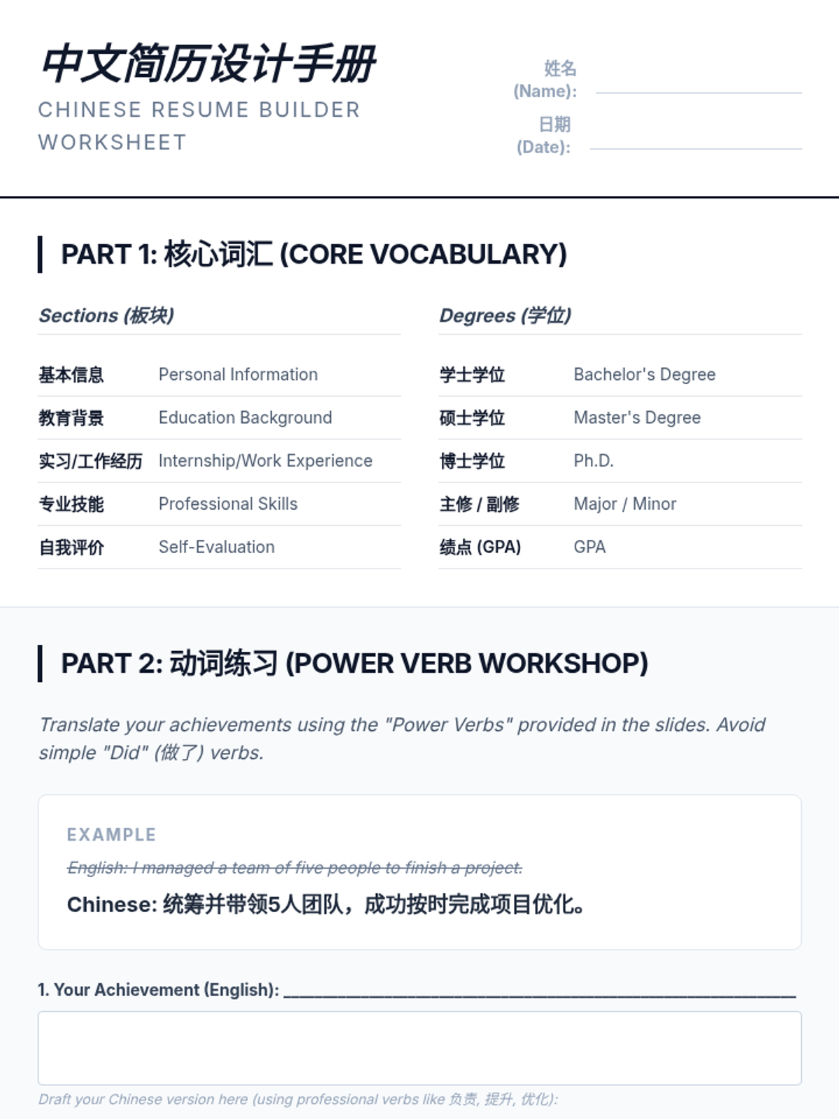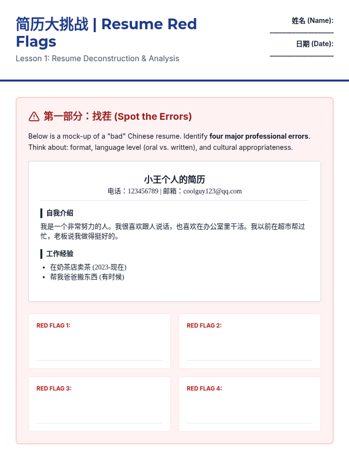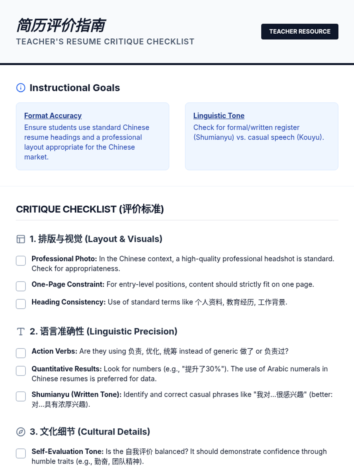 A comprehensive sequence for 12th-grade Advanced Mandarin students focusing on professional communication, resume drafting (Jianli), and job interview strategies in a Chinese cultural context. Students will master the balance between confidence and professional humility while developing tangible career assets.