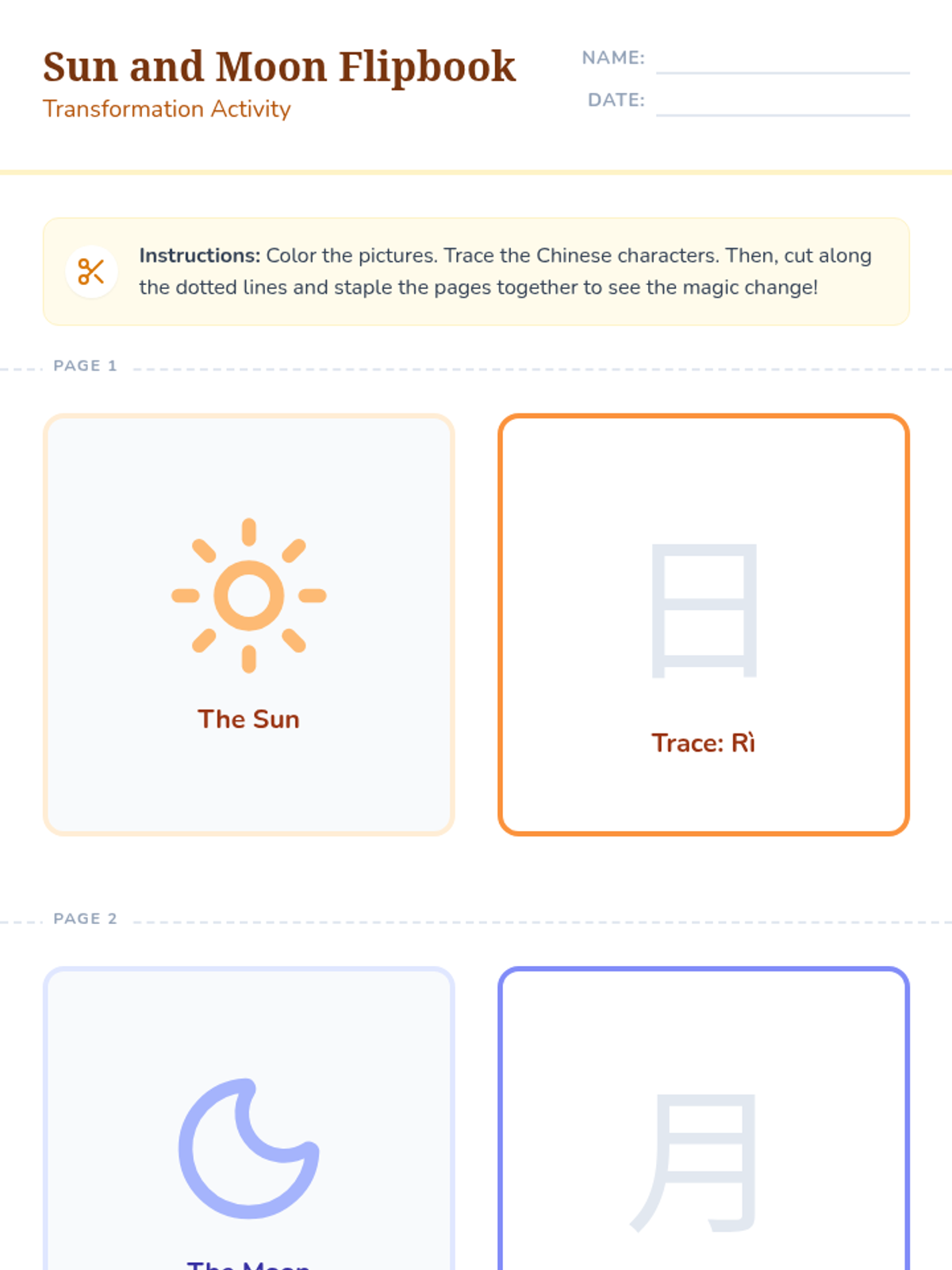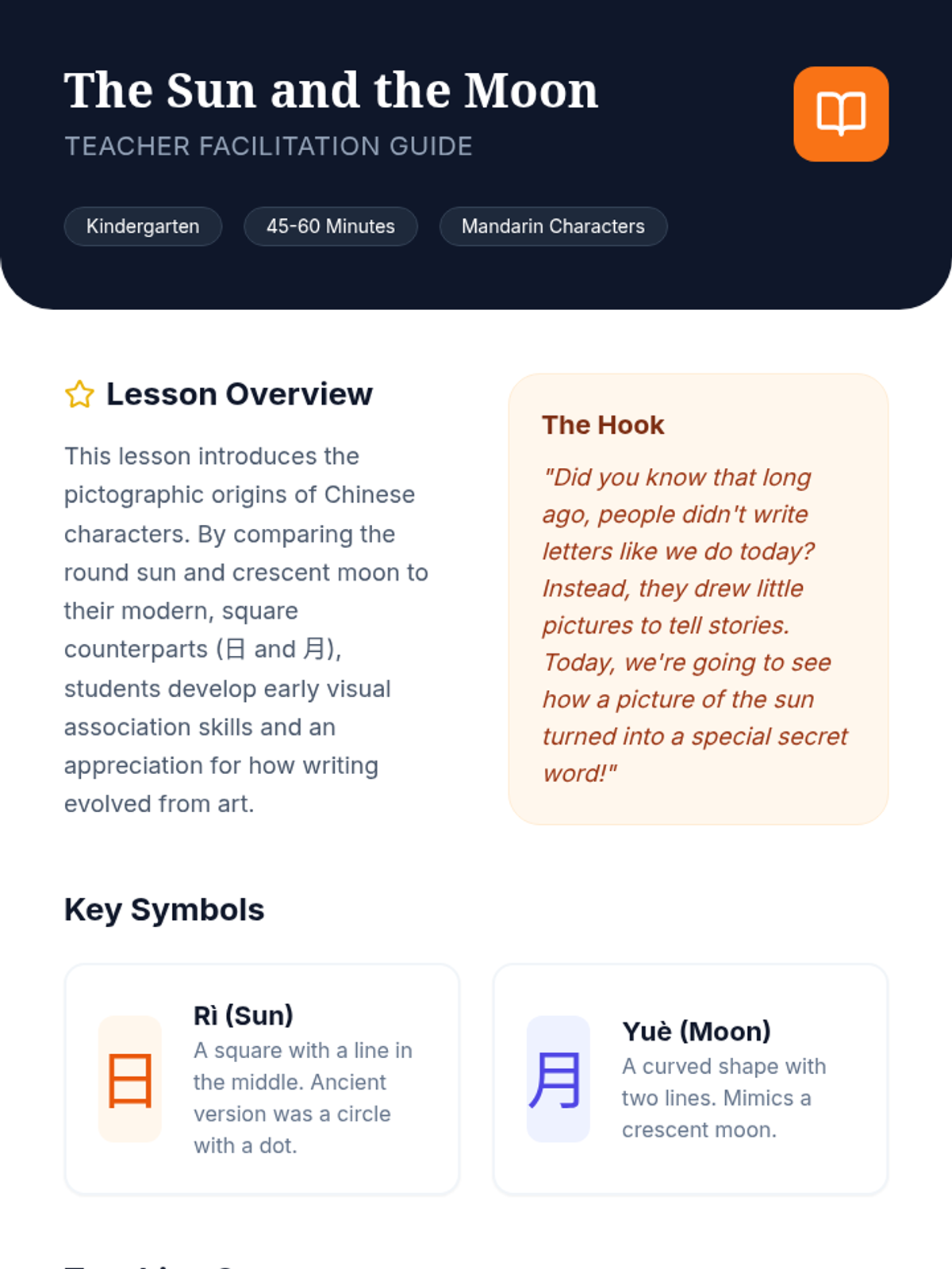 A Kindergarten sequence exploring the pictographic origins of Mandarin Chinese characters. Students learn to connect natural elements like the sun, moon, mountains, and water to their written symbols through art, movement, and observation.