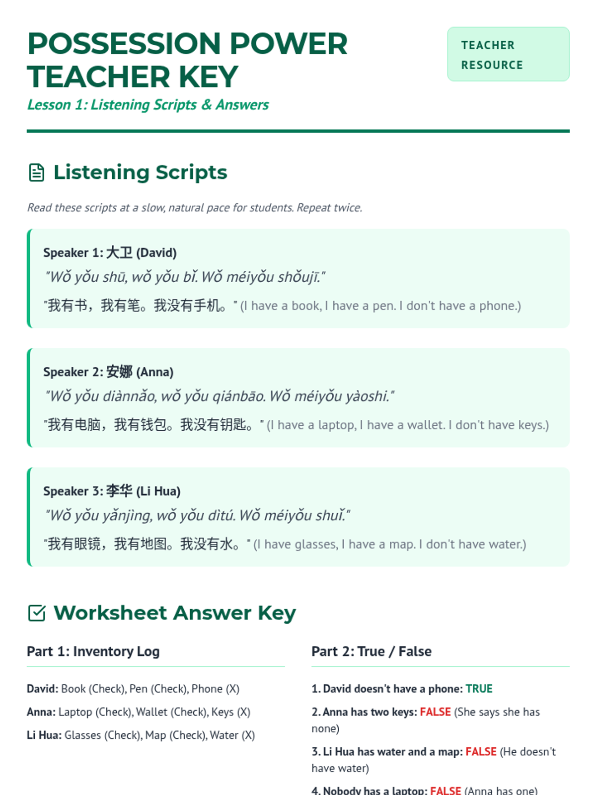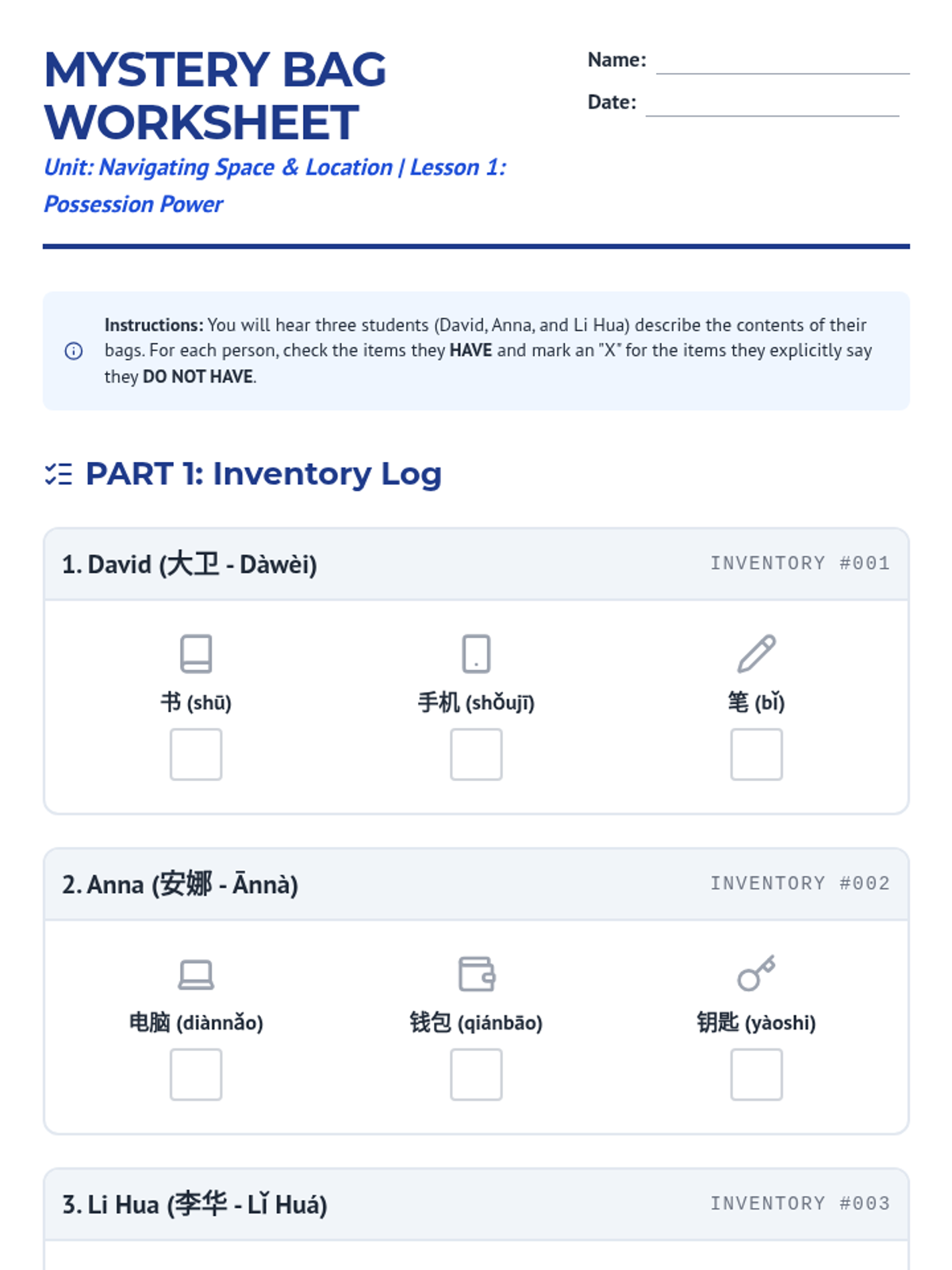 A comprehensive Mandarin listening sequence for undergraduate beginners, focusing on spatial awareness, existence, and navigation using 'zài' and 'yǒu'. Students develop mental mapping skills through audio-driven activities ranging from bag inventories to campus scavenger hunts.
