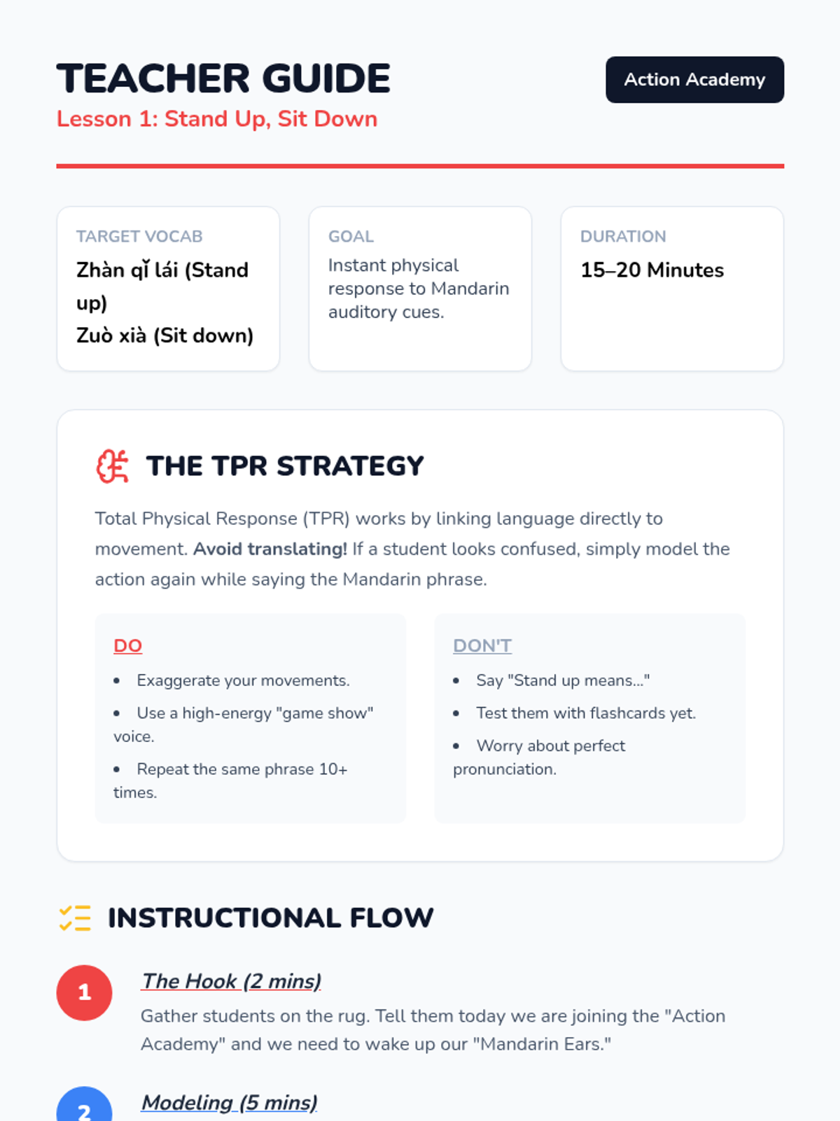 A high-energy Mandarin Chinese sequence for Pre-K students using the Total Physical Response (TPR) method. Students learn to respond to physical commands and action verbs through games and movement, building direct meaning without translation.