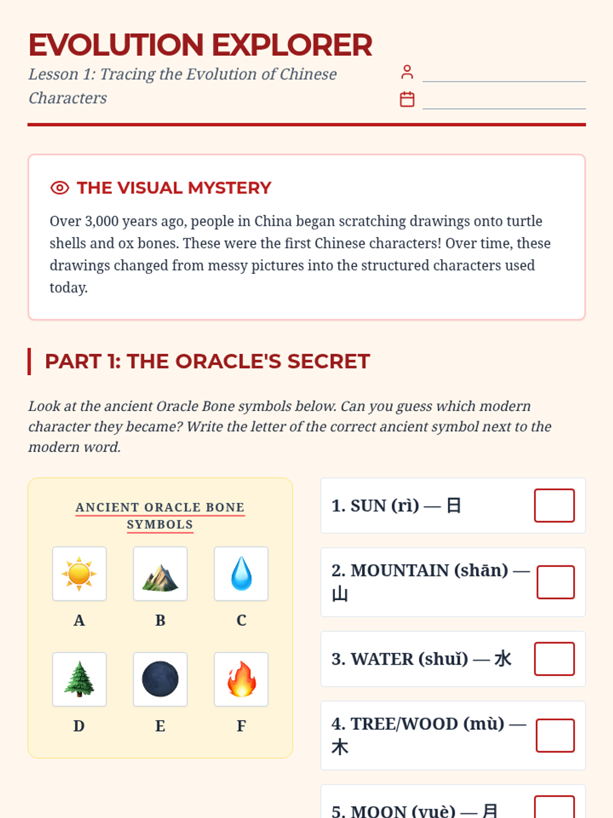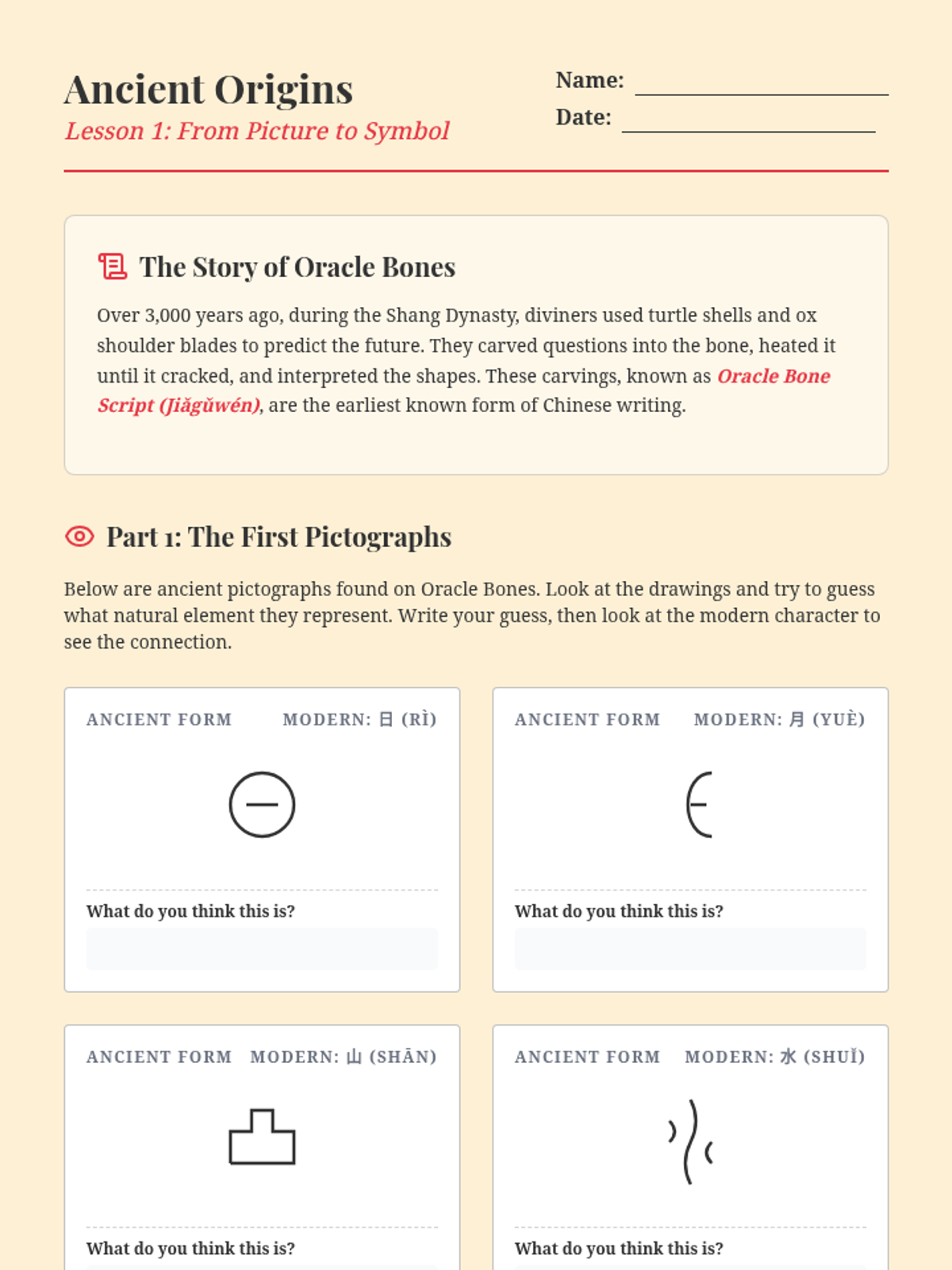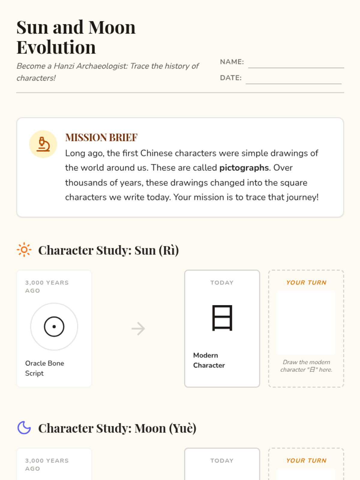 Students explore the historical evolution of Chinese characters from ancient pictures to modern forms. This inquiry-based sequence focuses on high-frequency nouns related to nature (sun, moon, water, mountain, fire) through the lens of visual archaeology.