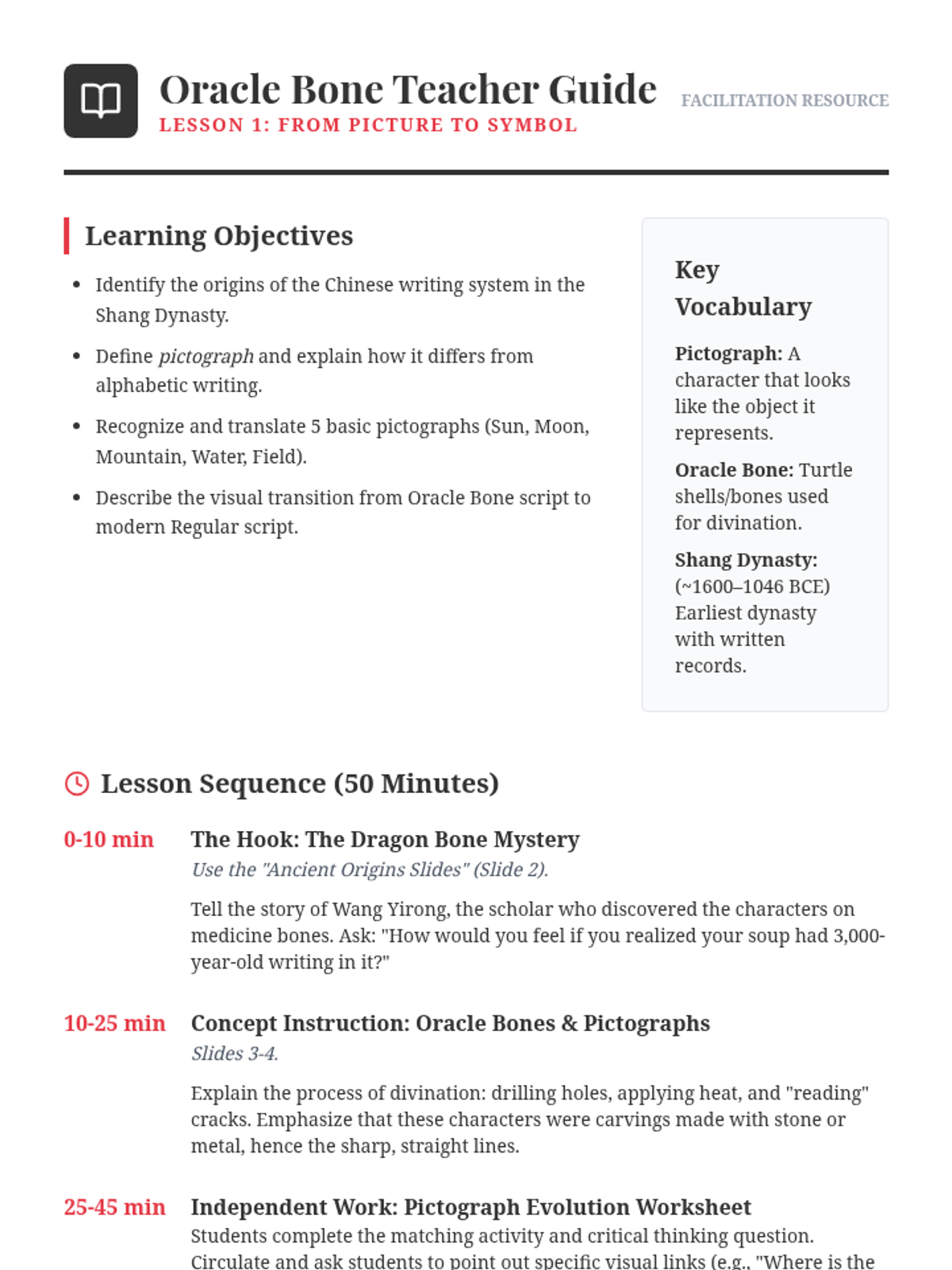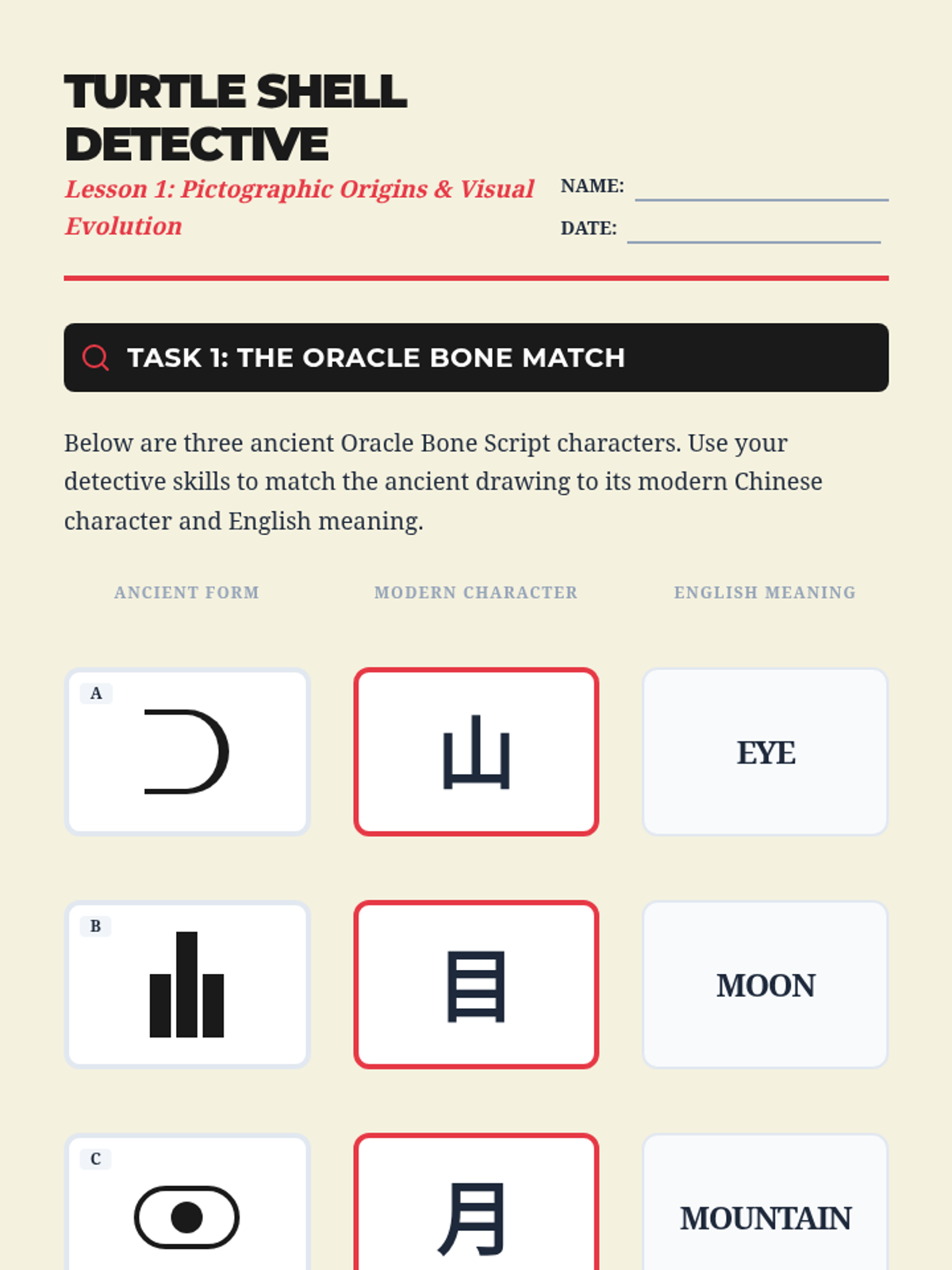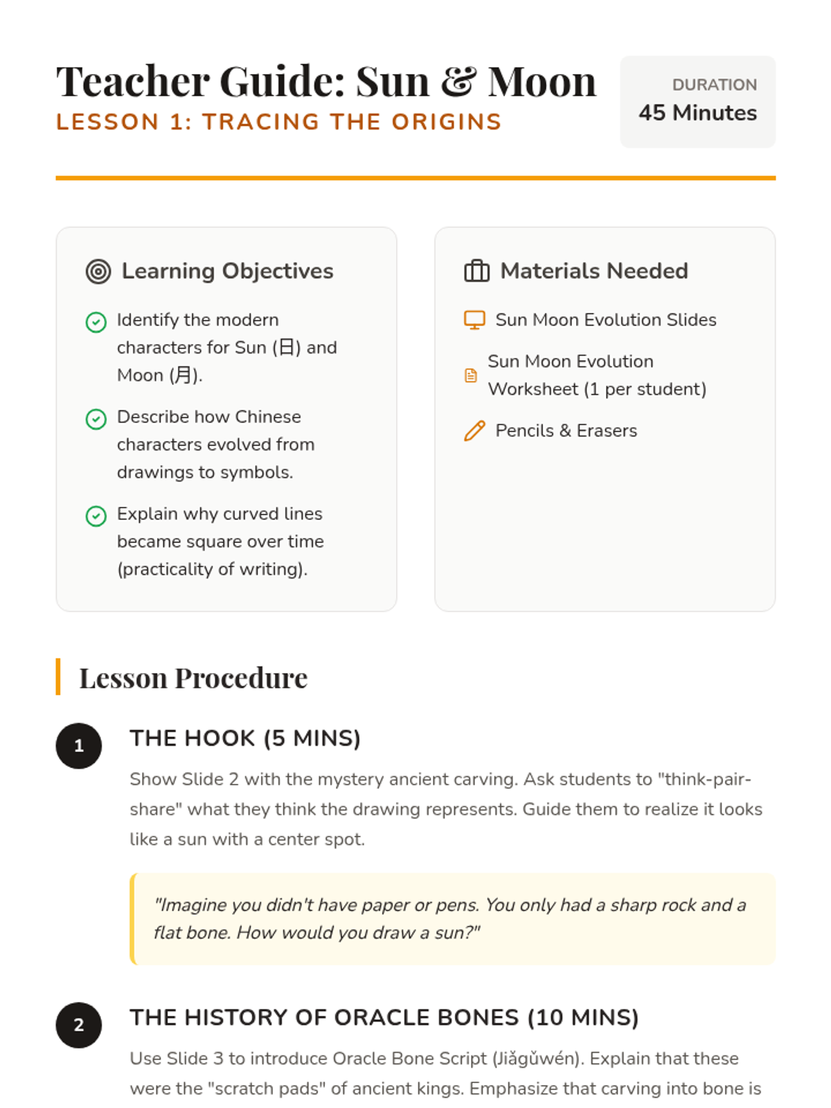 Students explore the historical evolution of Chinese characters from ancient pictures to modern forms. This inquiry-based sequence focuses on high-frequency nouns related to nature (sun, moon, water, mountain, fire) through the lens of visual archaeology.