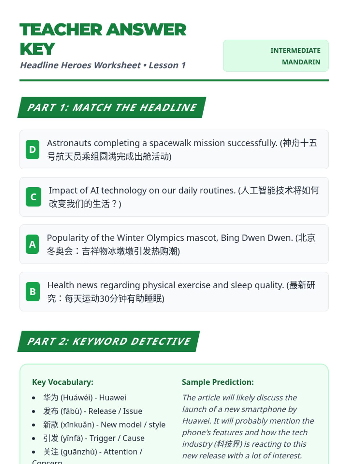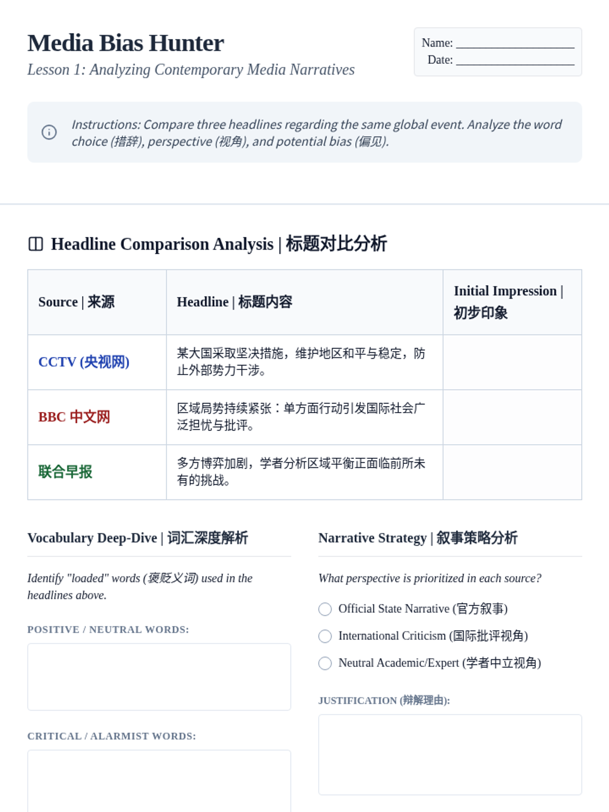 This sequence equips advanced Mandarin students with the linguistic tools to navigate modern Chinese media, focusing on the specific vocabulary, syntax, and cultural nuances found in headlines, political reports, and economic news. Students progress from decoding cryptic headlines to producing their own professional-style news broadcasts.