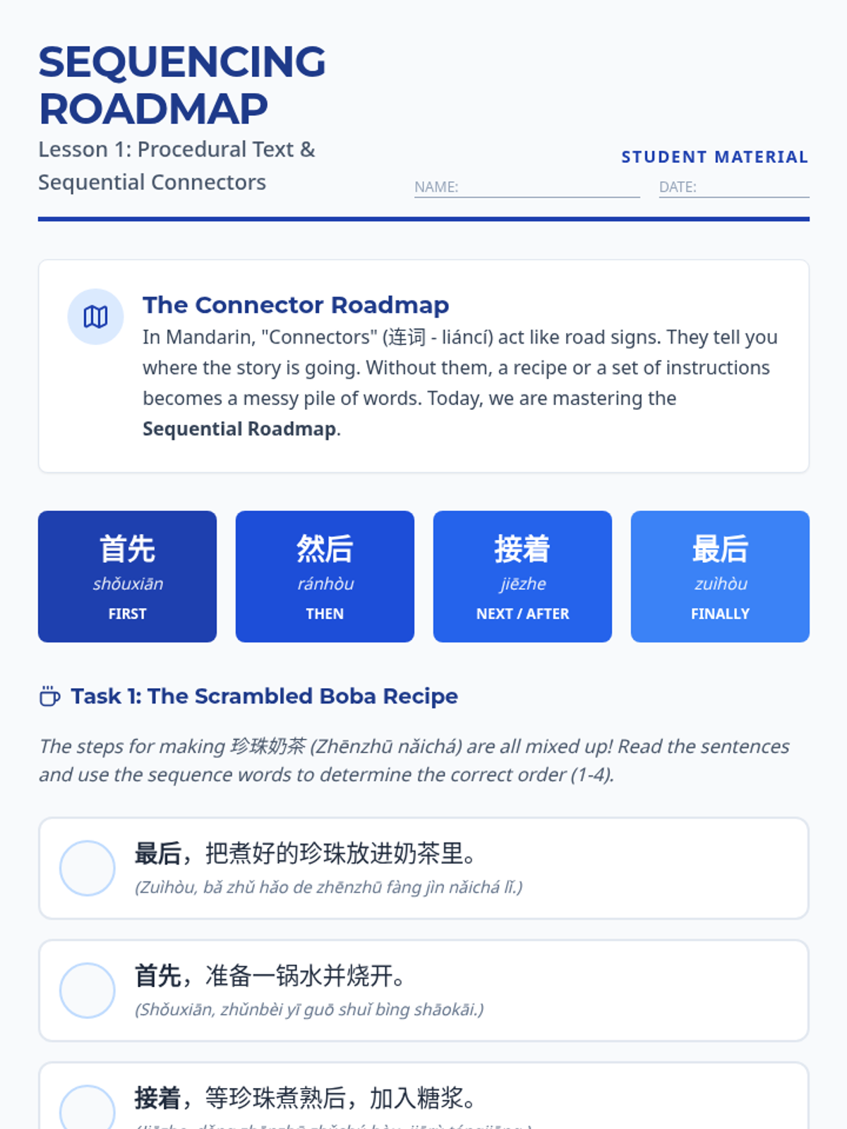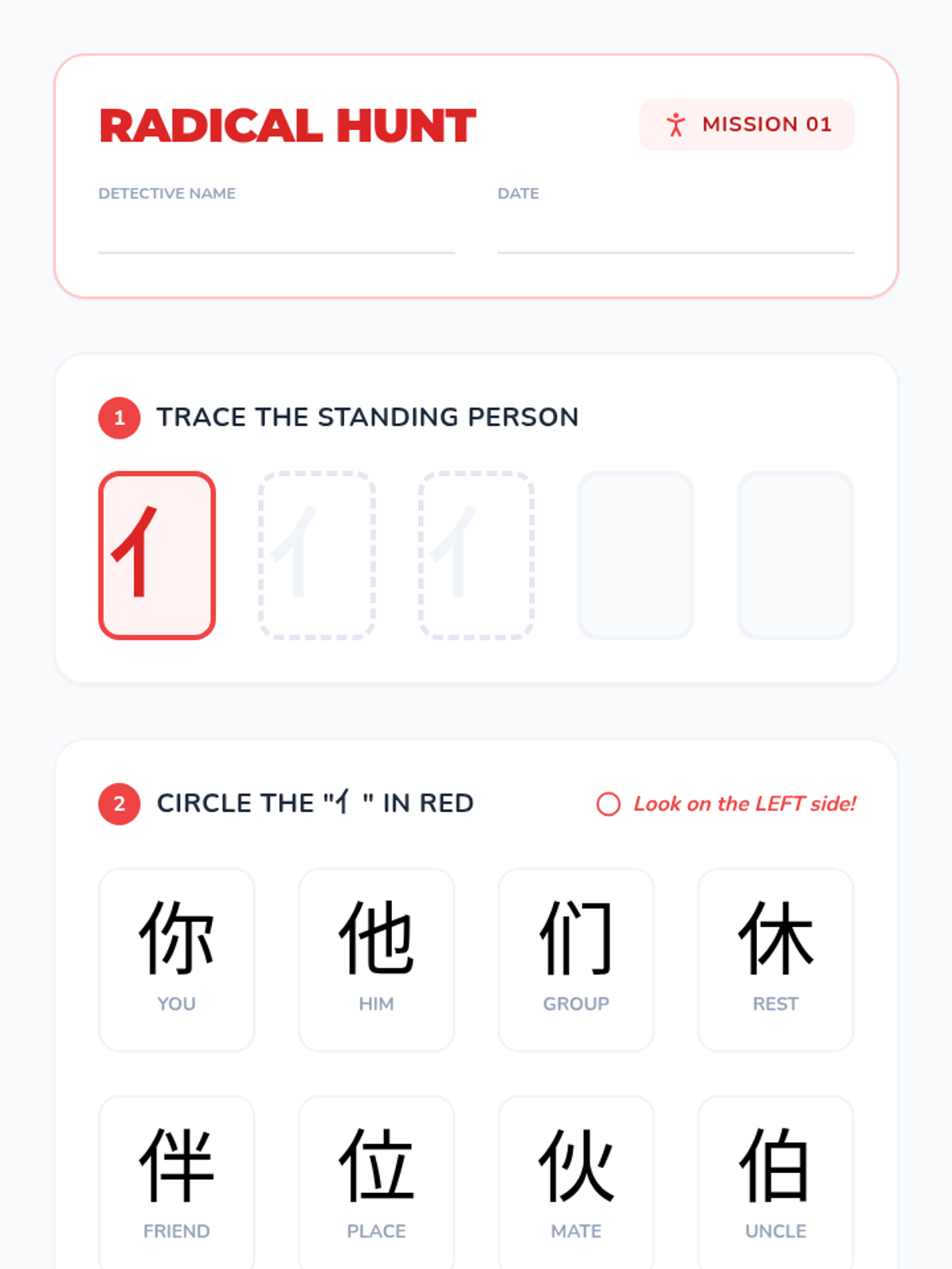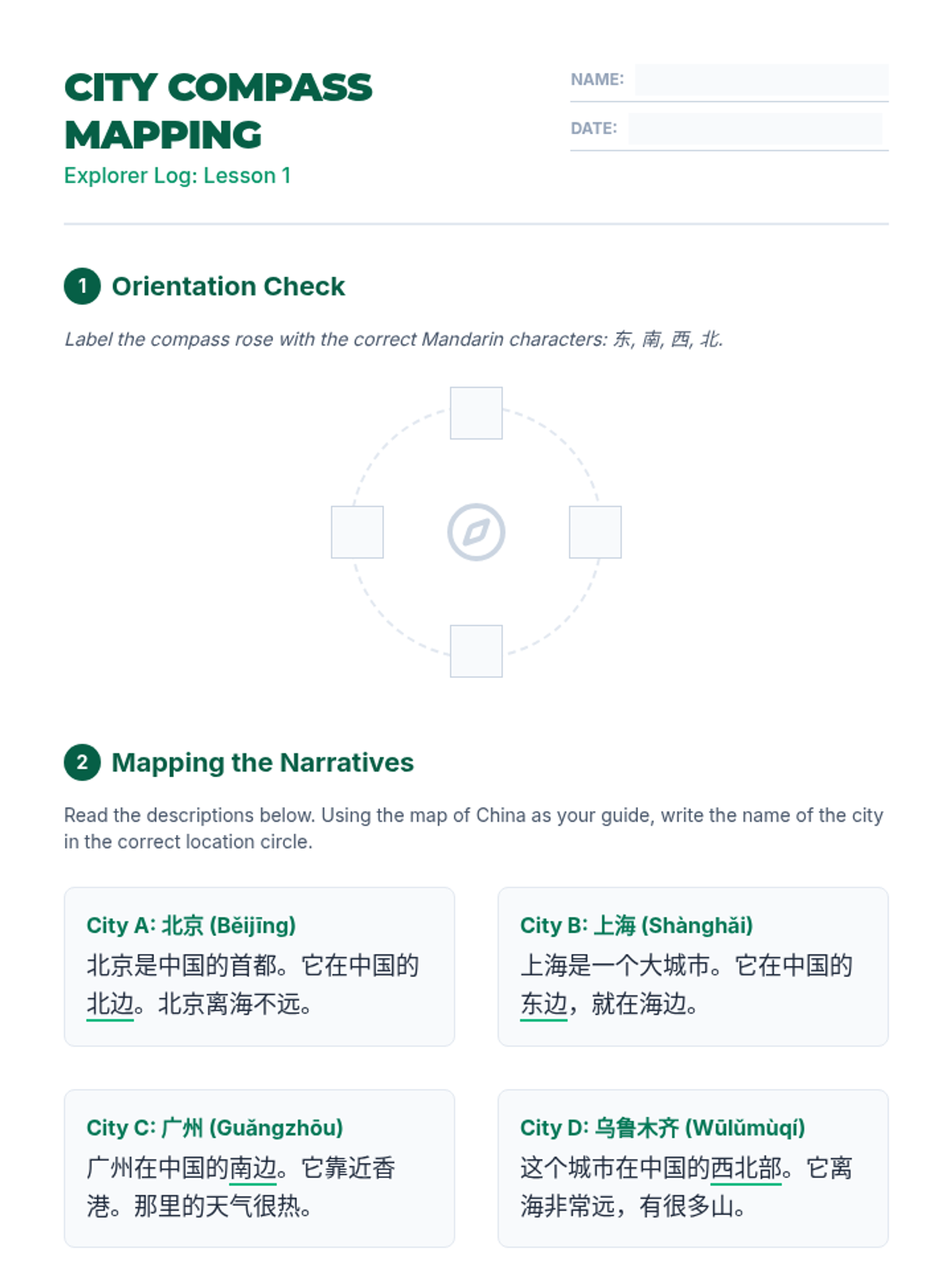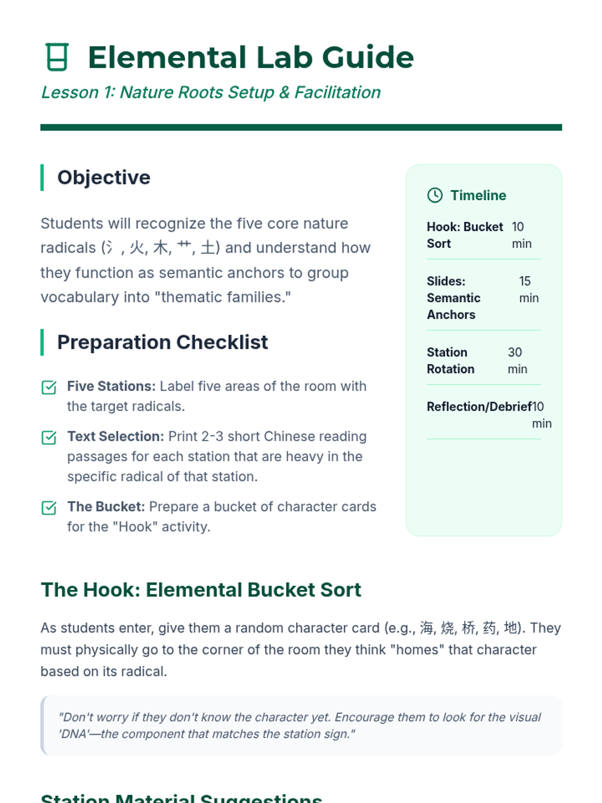 This intermediate Mandarin sequence transforms students into 'Character Codebreakers.' By analyzing the high-frequency radicals that form the building blocks of Chinese characters, students learn to infer meaning in new vocabulary related to nature, emotion, action, and abstract concepts, culminating in a dictionary scavenger hunt.