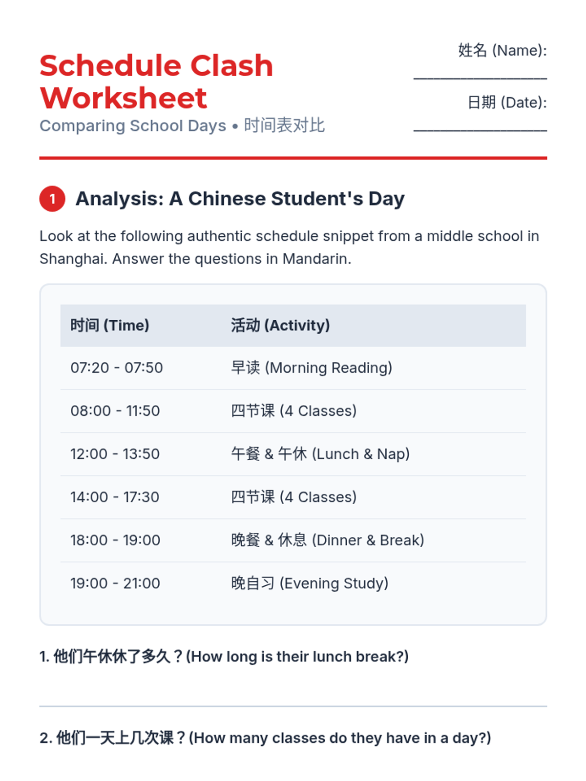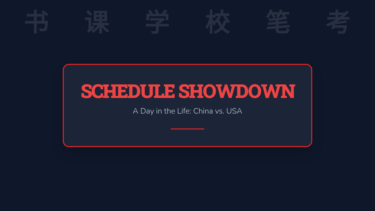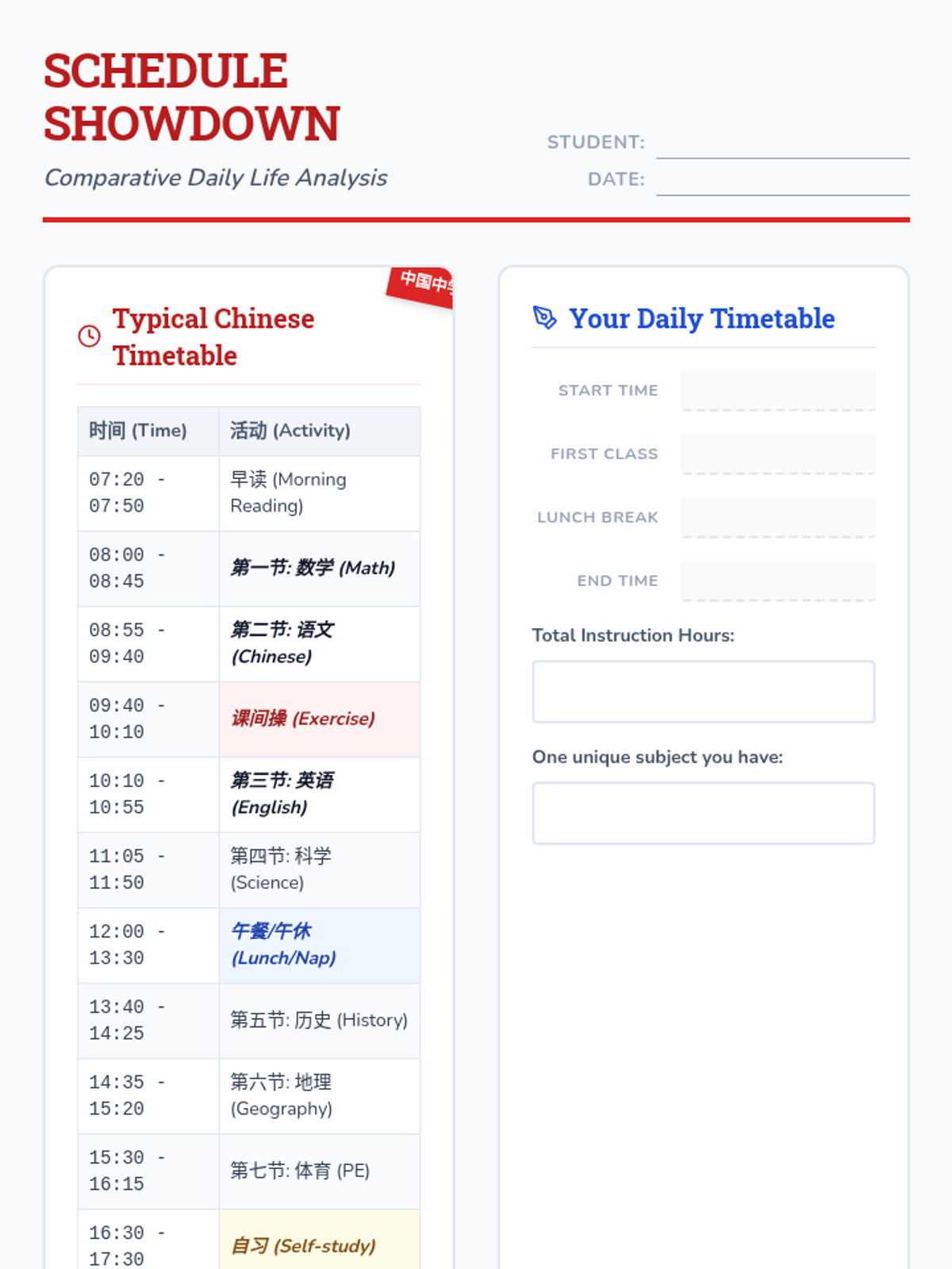 An intermediate Mandarin Chinese sequence exploring the cultural differences between Chinese and Western educational systems. Students analyze school schedules, academic subjects, extracurricular activities, and the emotional impact of high-stakes testing, culminating in a structured debate on global education models.