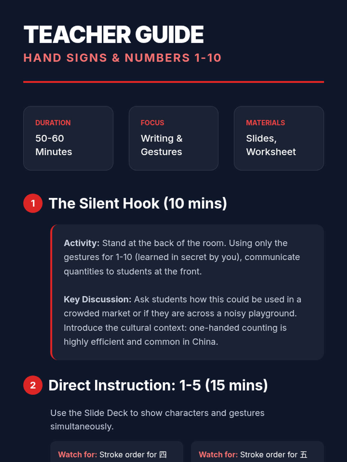 A vibrant 5-lesson sequence teaching 1st-grade students Mandarin numerals 1-10 through rhythmic movement, tactile playdough modeling, traditional hand signs, and a culminating marketplace simulation.
