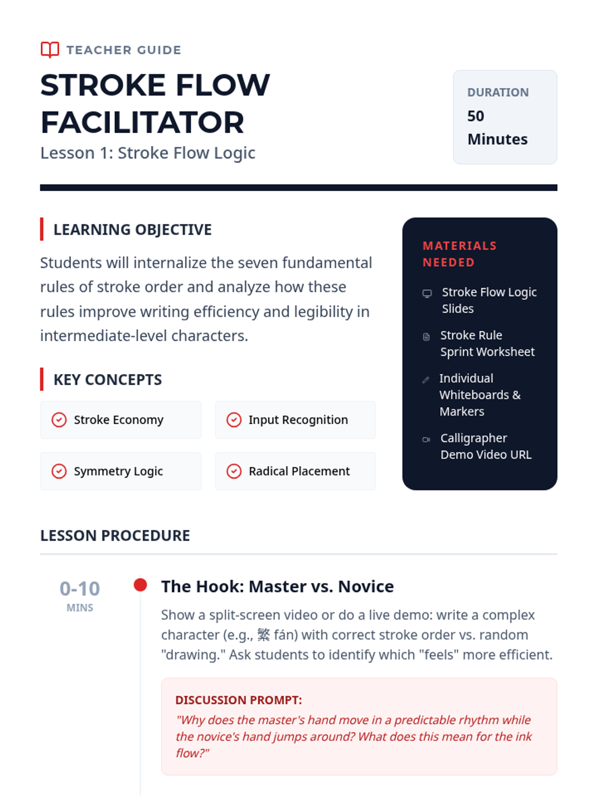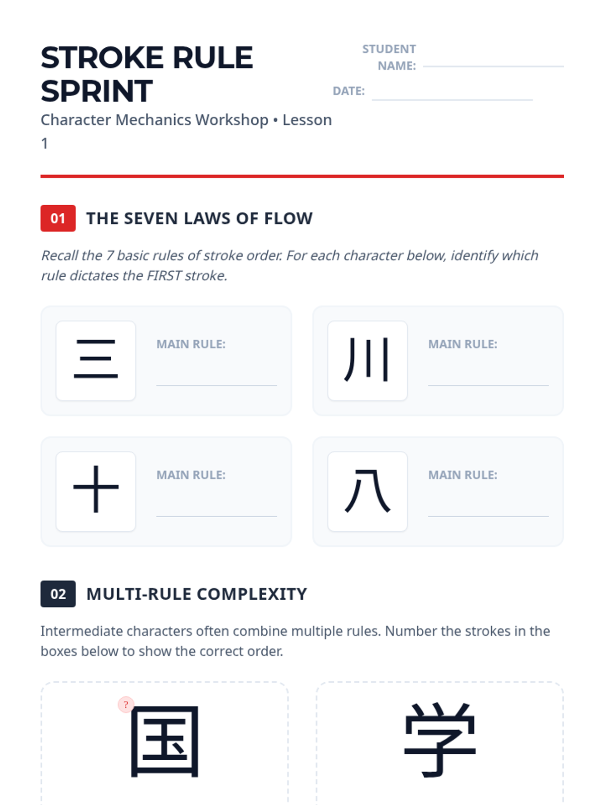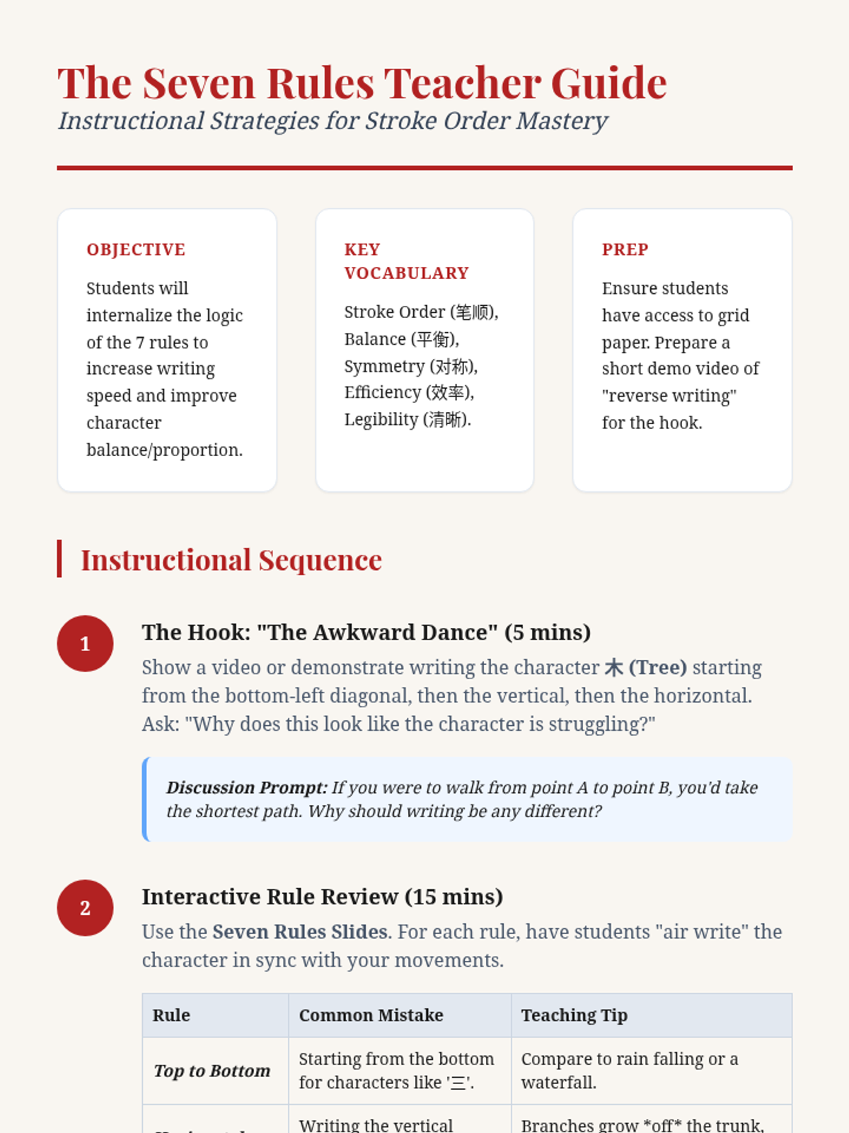 A workshop-style sequence for 6th-grade students focusing on the mechanics, aesthetics, and efficiency of writing intermediate Mandarin characters. Students move from basic stroke memorization to mastering complex stroke order rules, character balance (rang), and fluid writing speed.