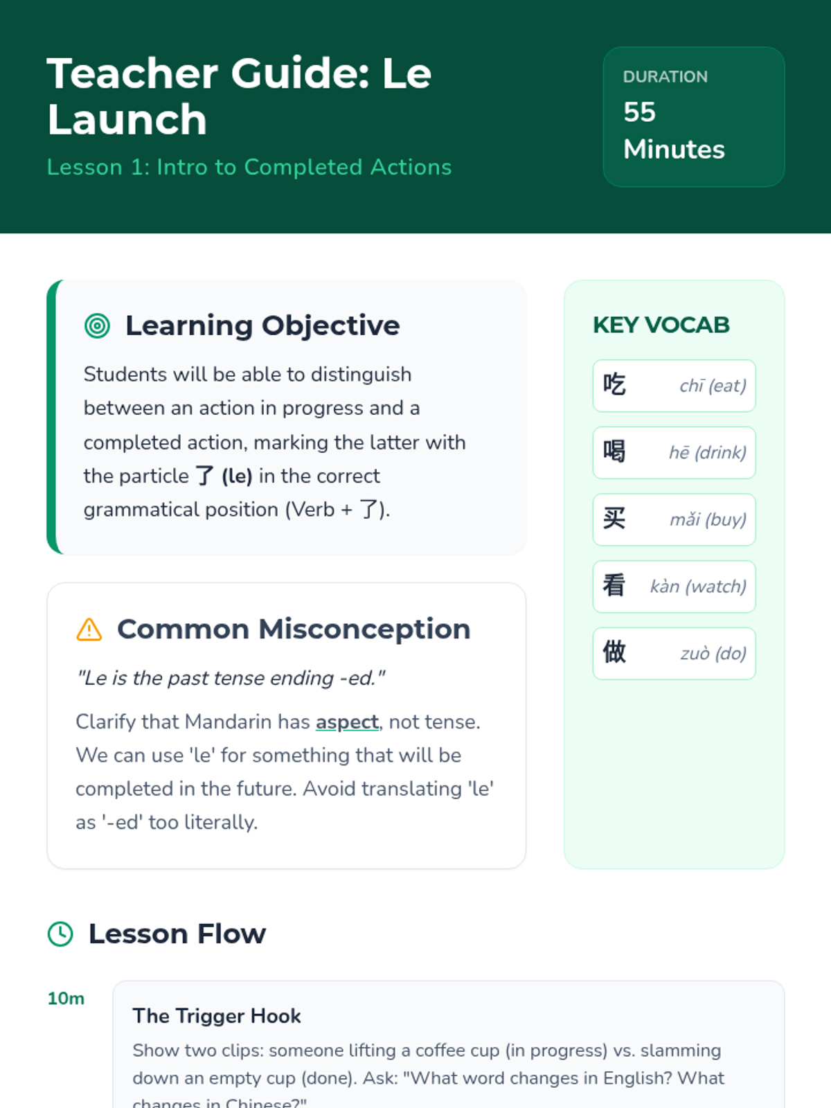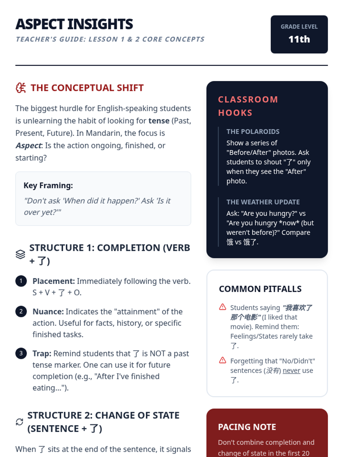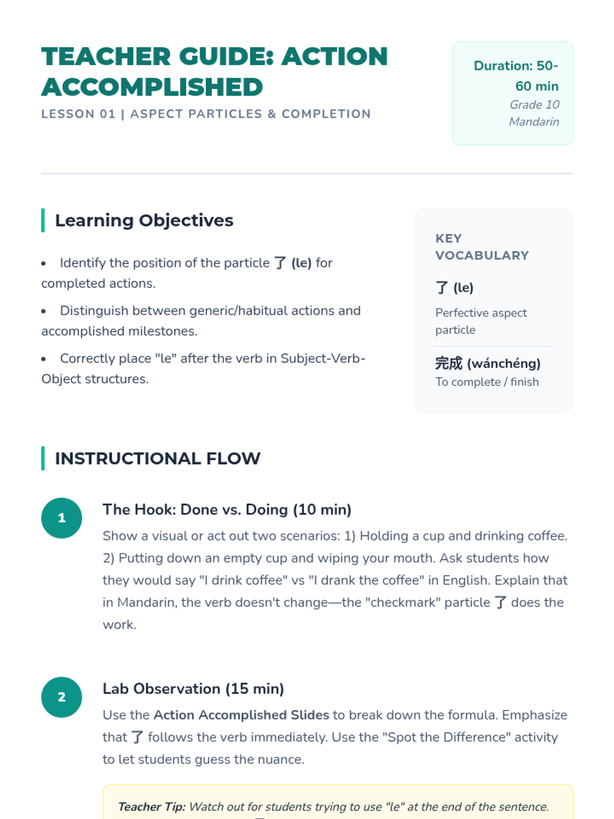 A comprehensive unit for 9th-grade Mandarin students on expressing completed actions and changes of state using the 'le' particle and 'meiyou' negation. Students move beyond English tense thinking to master Chinese aspect markers.