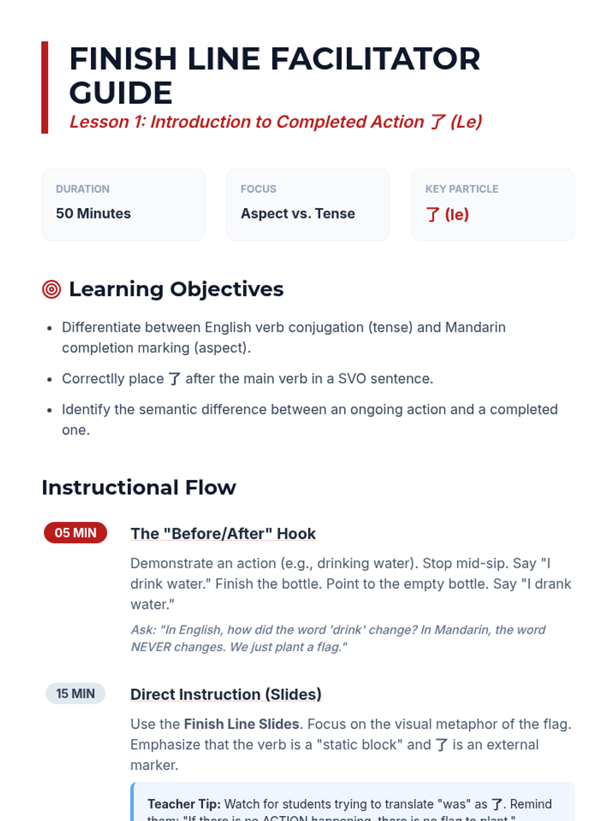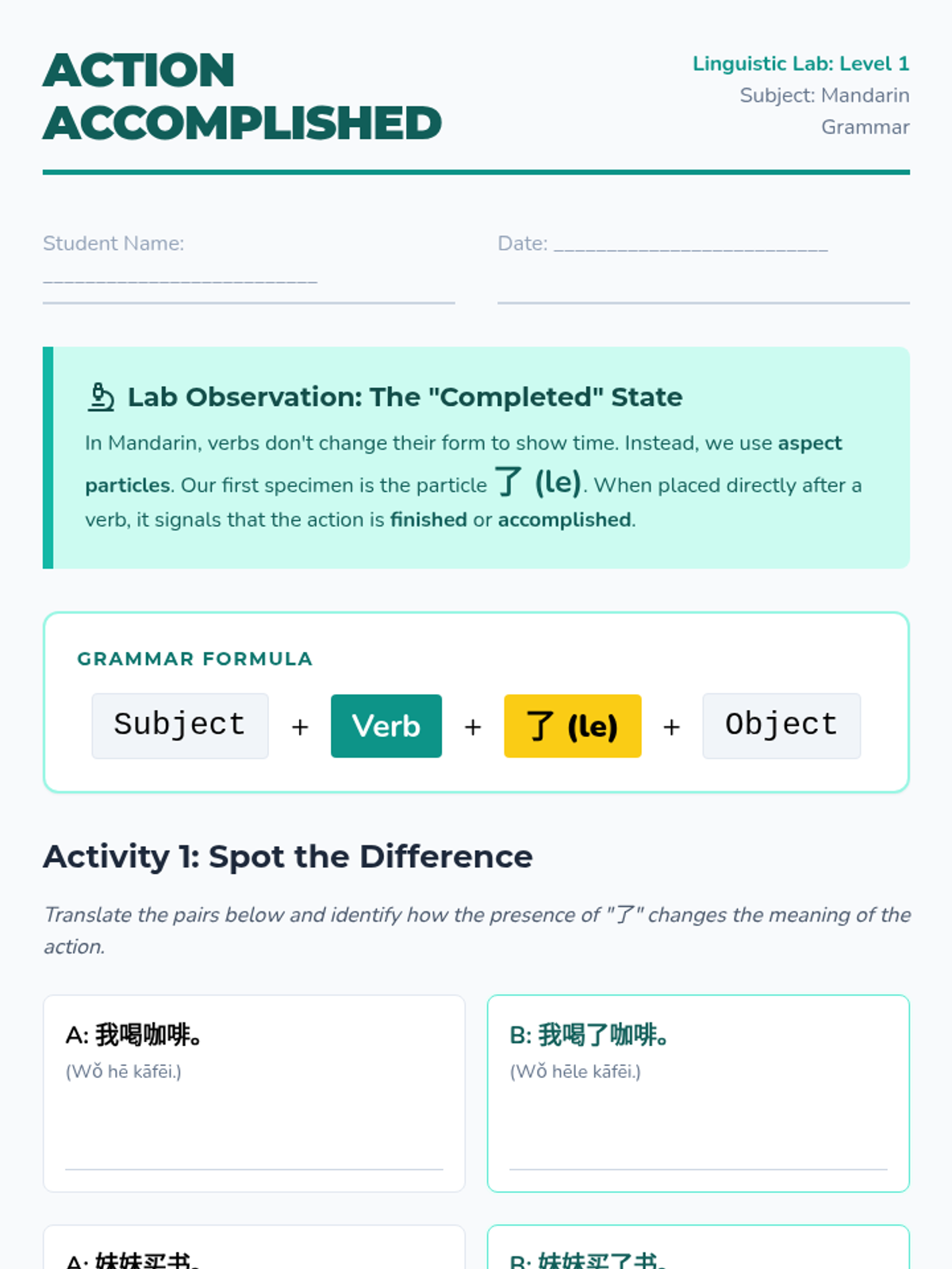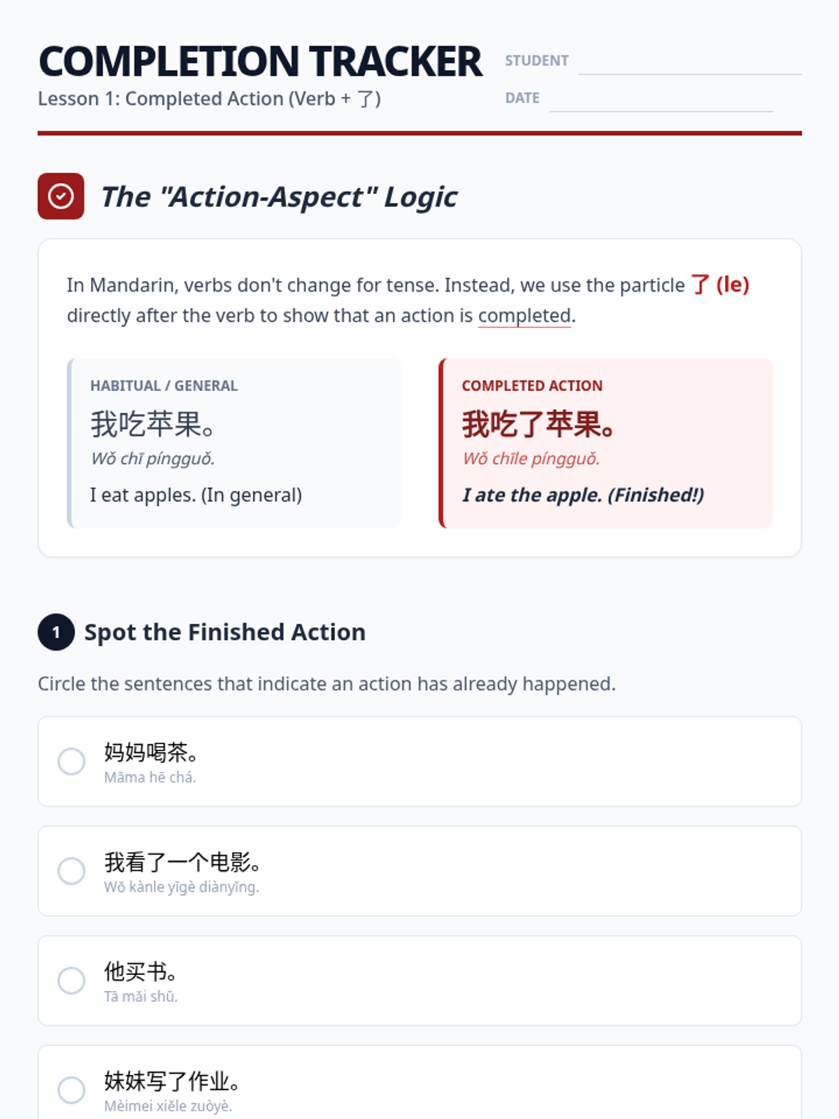A comprehensive unit for 9th-grade Mandarin students on expressing completed actions and changes of state using the 'le' particle and 'meiyou' negation. Students move beyond English tense thinking to master Chinese aspect markers.