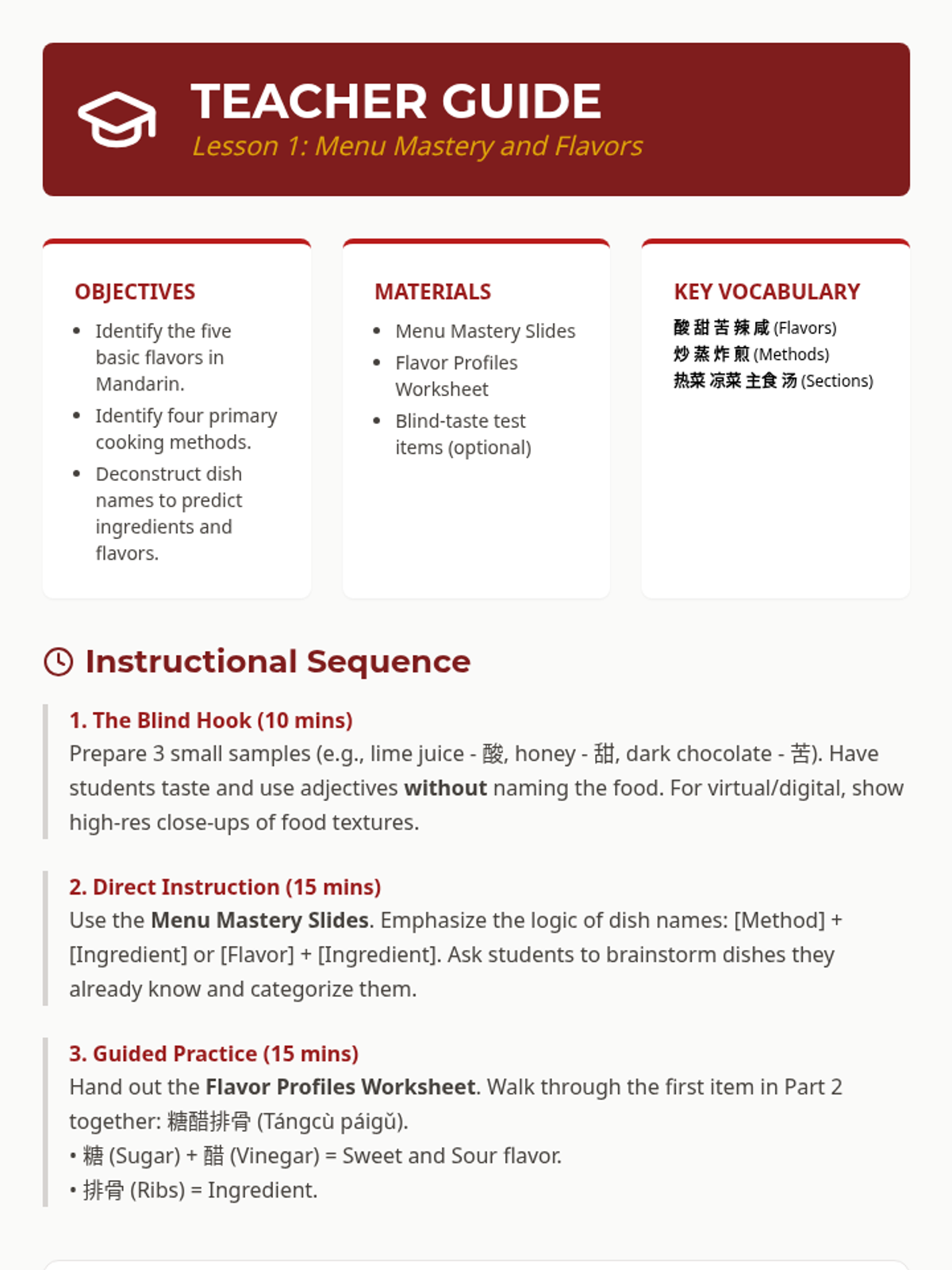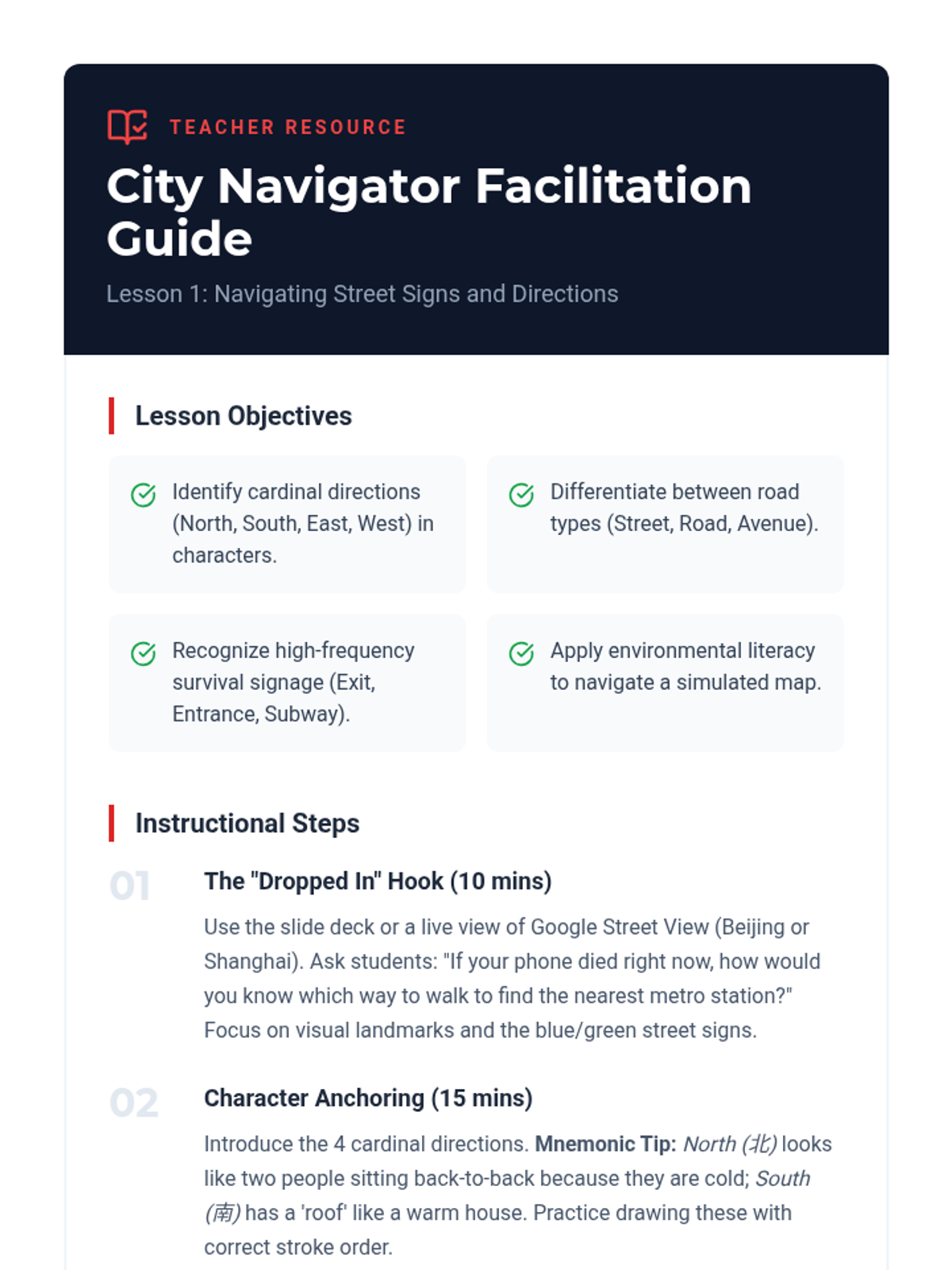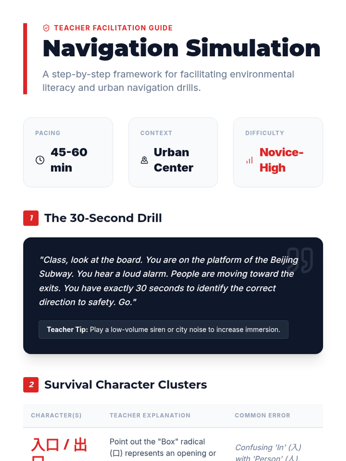 This simulation-heavy sequence applies intermediate Mandarin character knowledge to real-world survival scenarios like menus, street signs, and digital messages. Students focus on scanning for keywords and using context clues to navigate a Chinese-speaking environment.