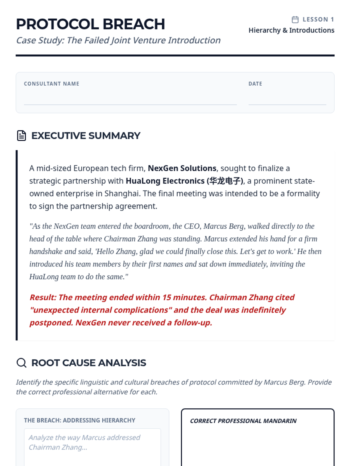 A high-level Mandarin Chinese course for graduate students focusing on the linguistic and cultural nuances of business negotiations, emphasizing 'face' (mianzi) and hierarchical communication.