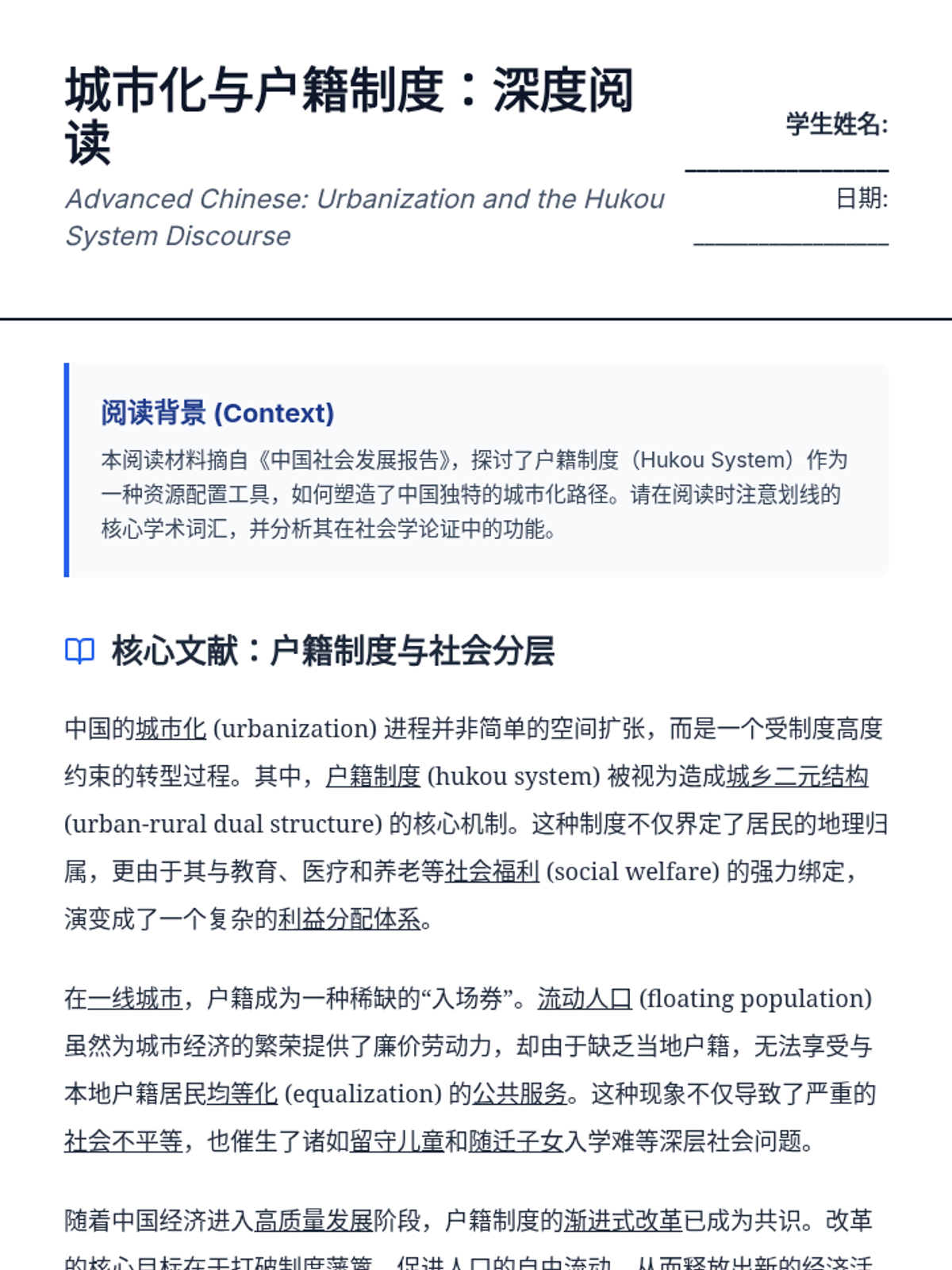 A comprehensive sequence for advanced Mandarin learners focusing on the vocabulary and structures of social sciences. Students move from morphemic analysis to authentic document parsing and diplomatic simulation.