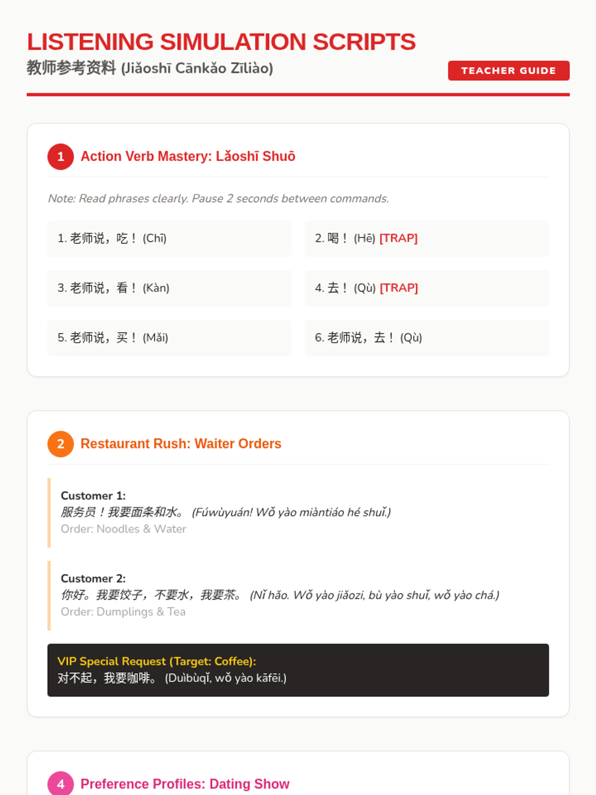 A beginner-level Mandarin sequence focused on functional listening skills for real-world scenarios. Students move from basic action verbs to navigating restaurants, directions, and markets through immersive simulations.