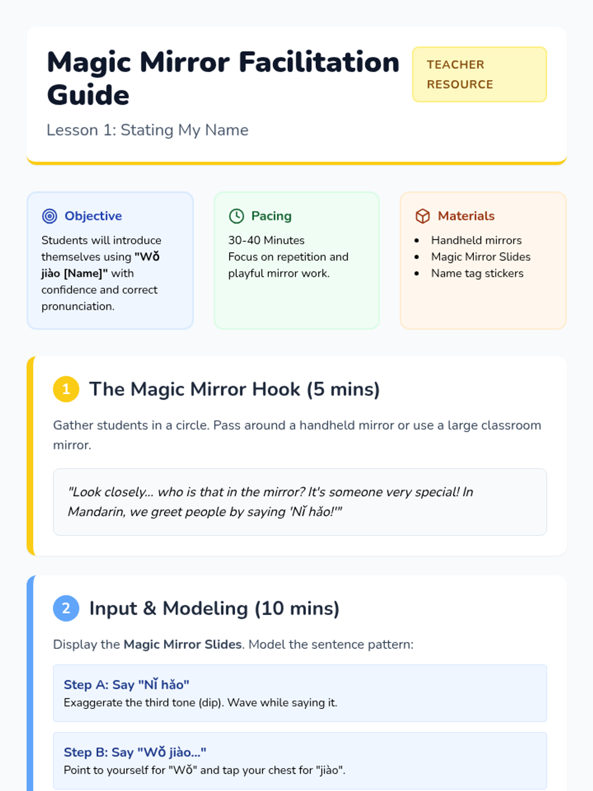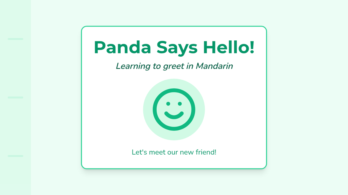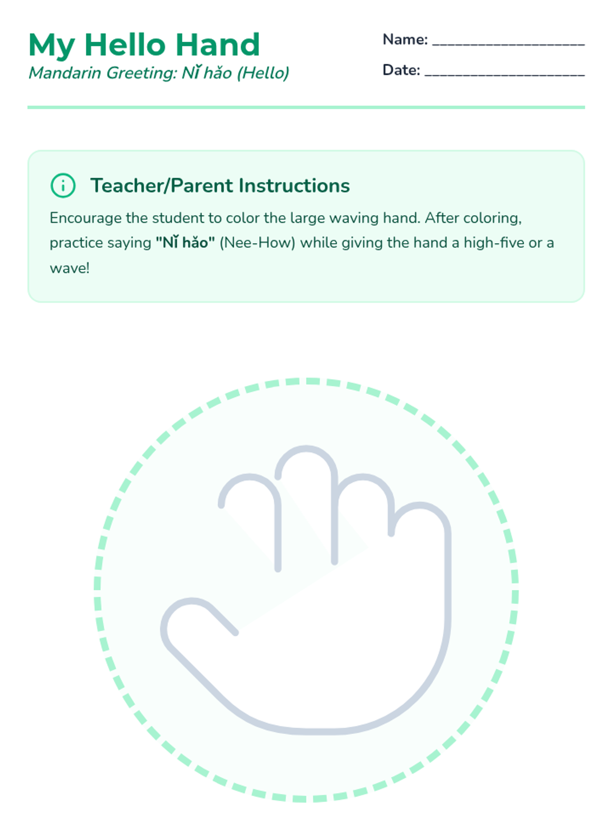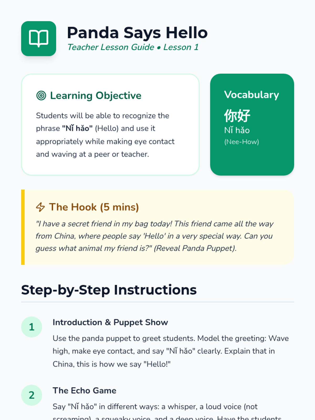 A Pre-K sequence focused on teaching basic Mandarin greetings and social etiquette through play, puppets, and a final tea party synthesis. Students learn phrases for hello, goodbye, thank you, and sorry in a culturally immersive environment.
