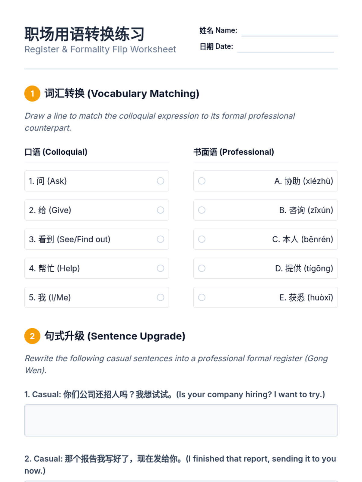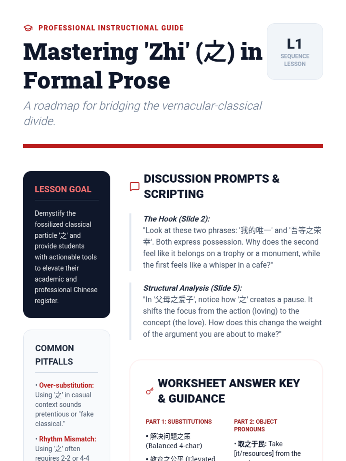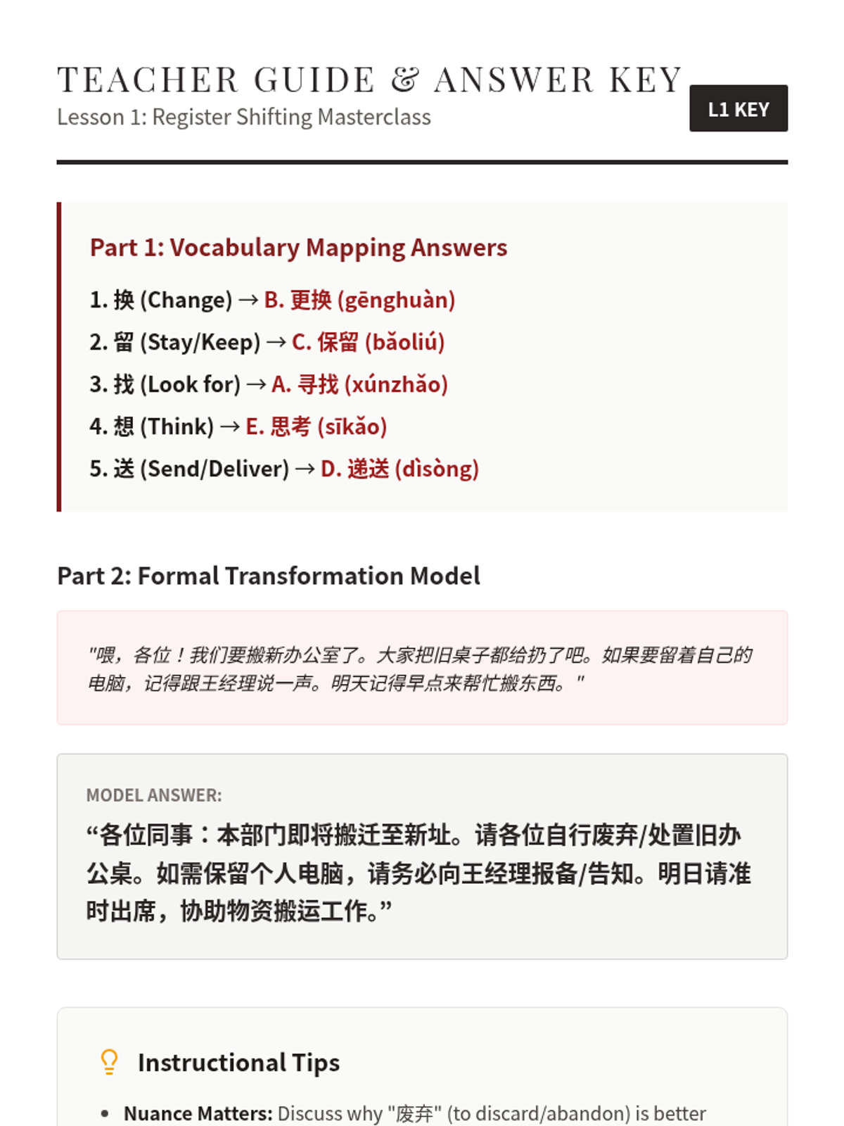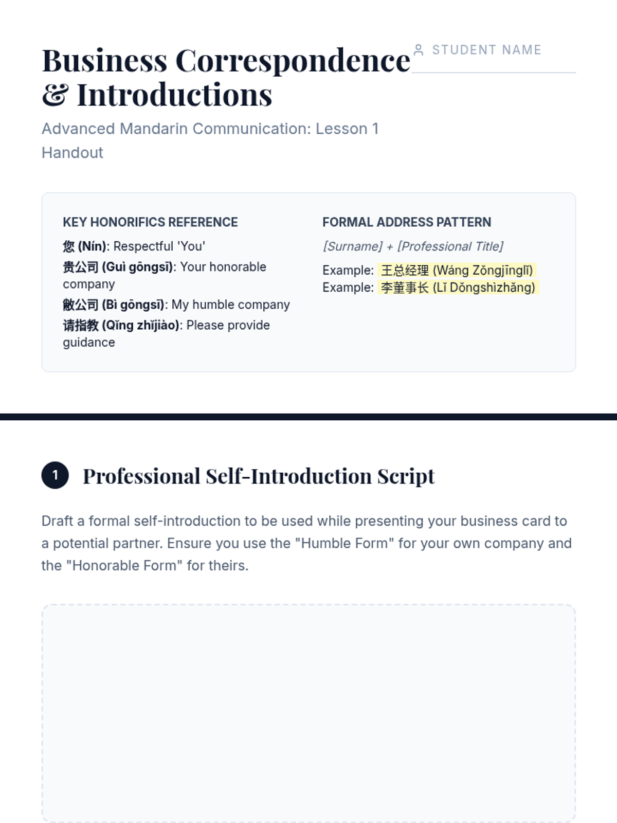 This sequence prepares advanced 12th Grade Mandarin students for professional environments by mastering formal written Chinese (Gong Wen). Students explore register, honorifics, and indirect communication strategies across various business scenarios.