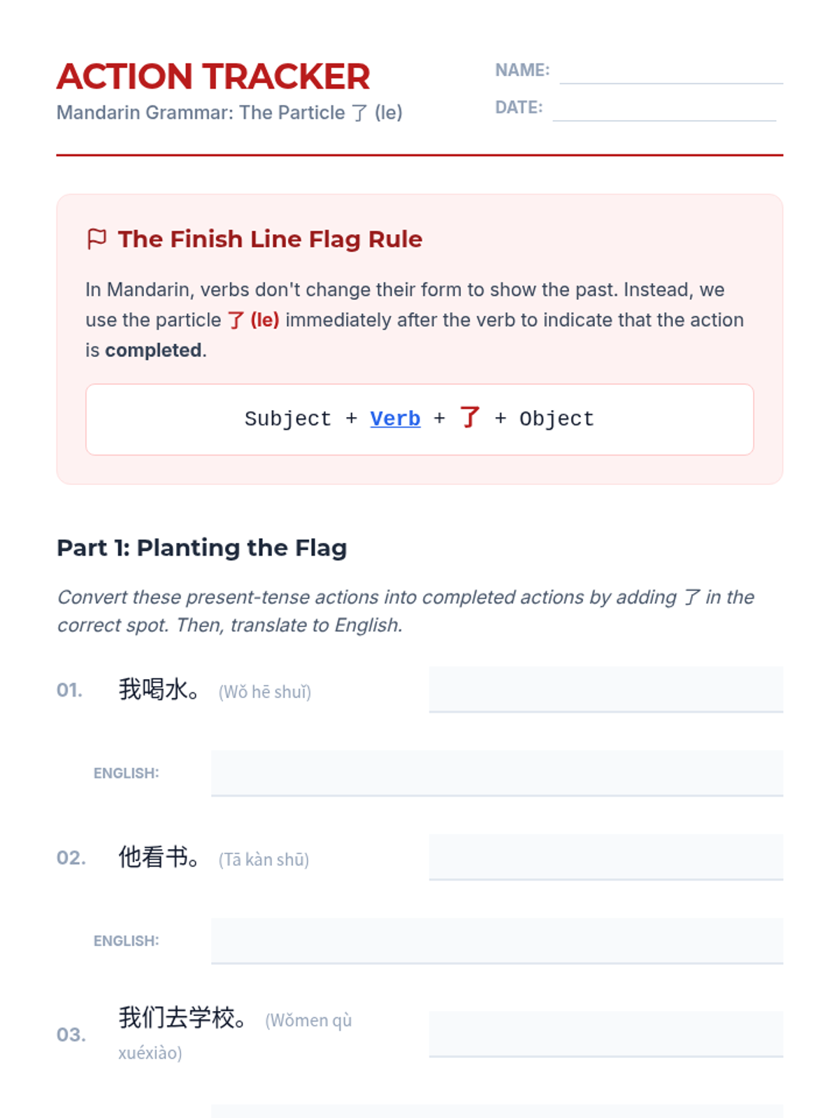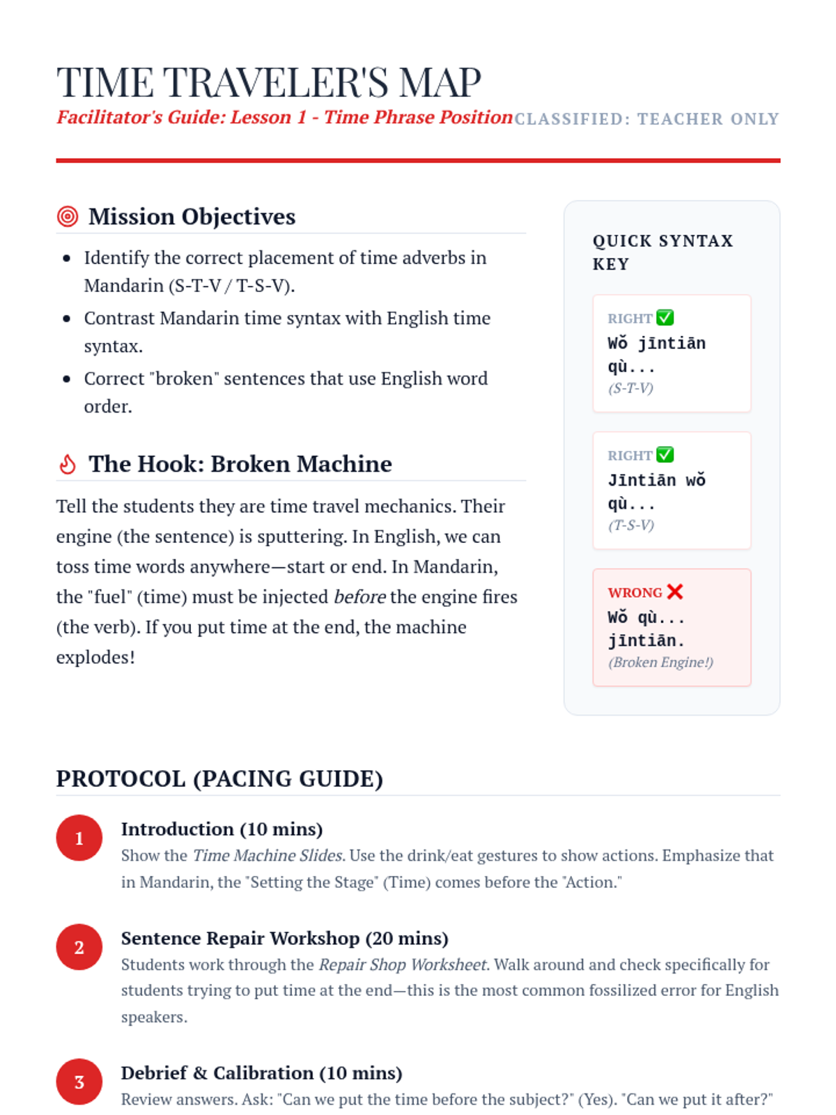 A comprehensive unit for 6th Grade Mandarin students exploring the syntax of time expressions and the aspect particle 'le'. Students transition from simple sentence structures to narrative storytelling, mastering the Subject-Time-Verb order and marking completed actions.