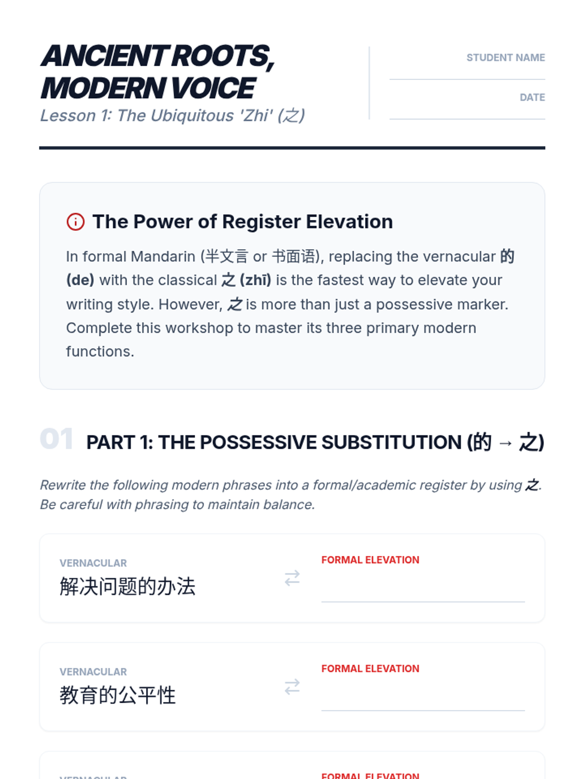 This sequence explores how Classical Chinese (Wenyanwen) grammar and particles survive in modern formal writing. Students learn to bridge the gap between vernacular and academic registers by mastering 'fossilized' classical structures commonly found in editorials, legal documents, and literature.