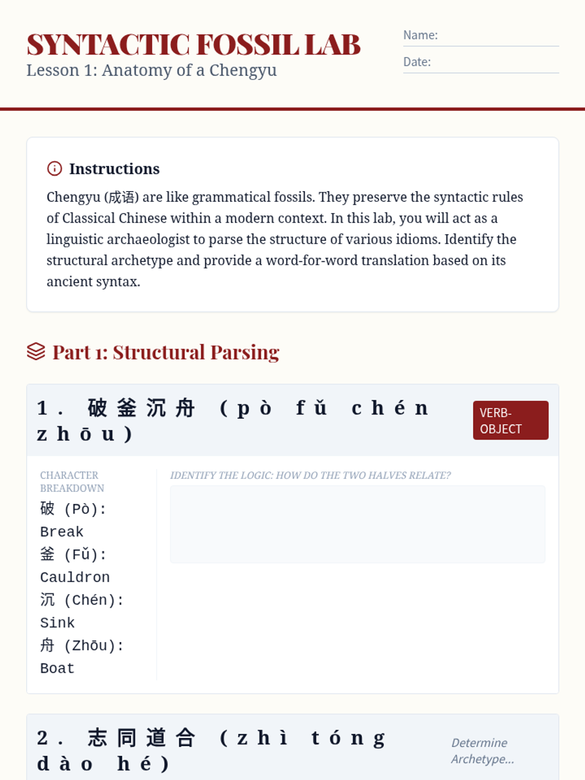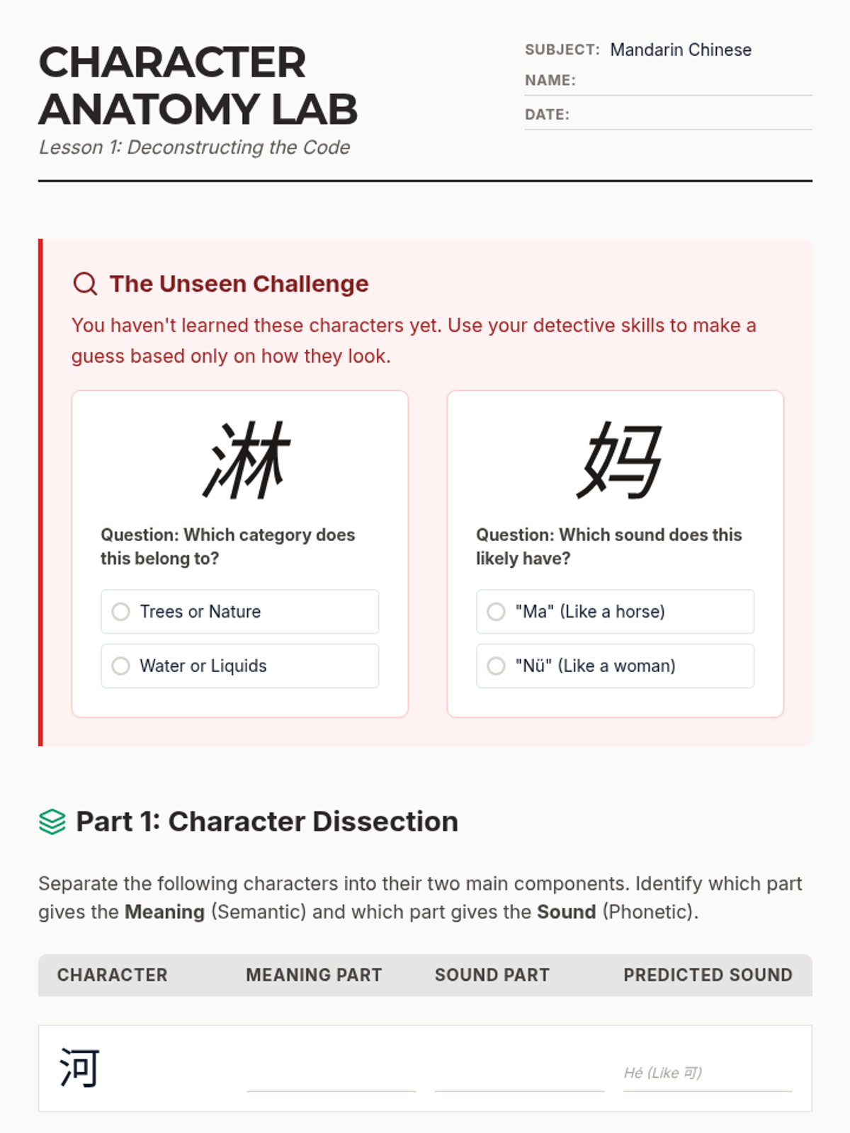An inquiry-based exploration of Mandarin Chinese semantic-phonetic character structure, empowering 6th-grade students to decode unfamiliar characters using structural logic.