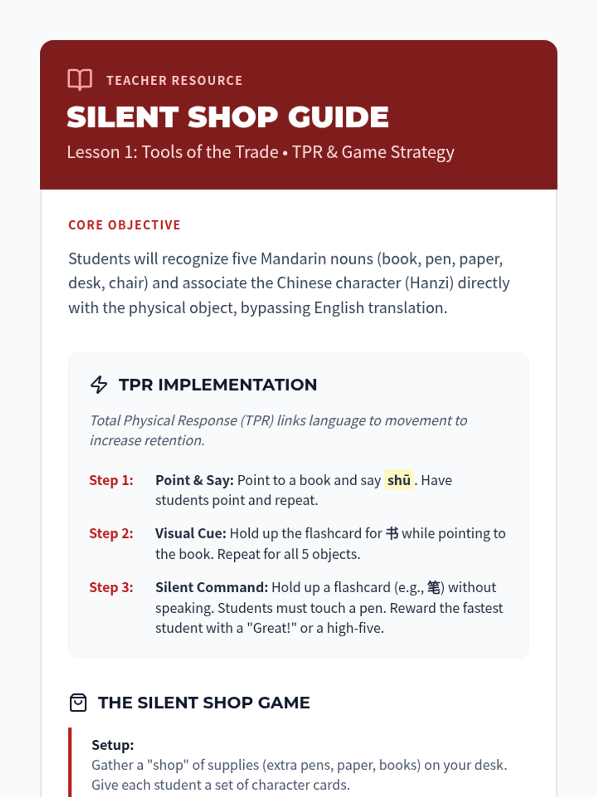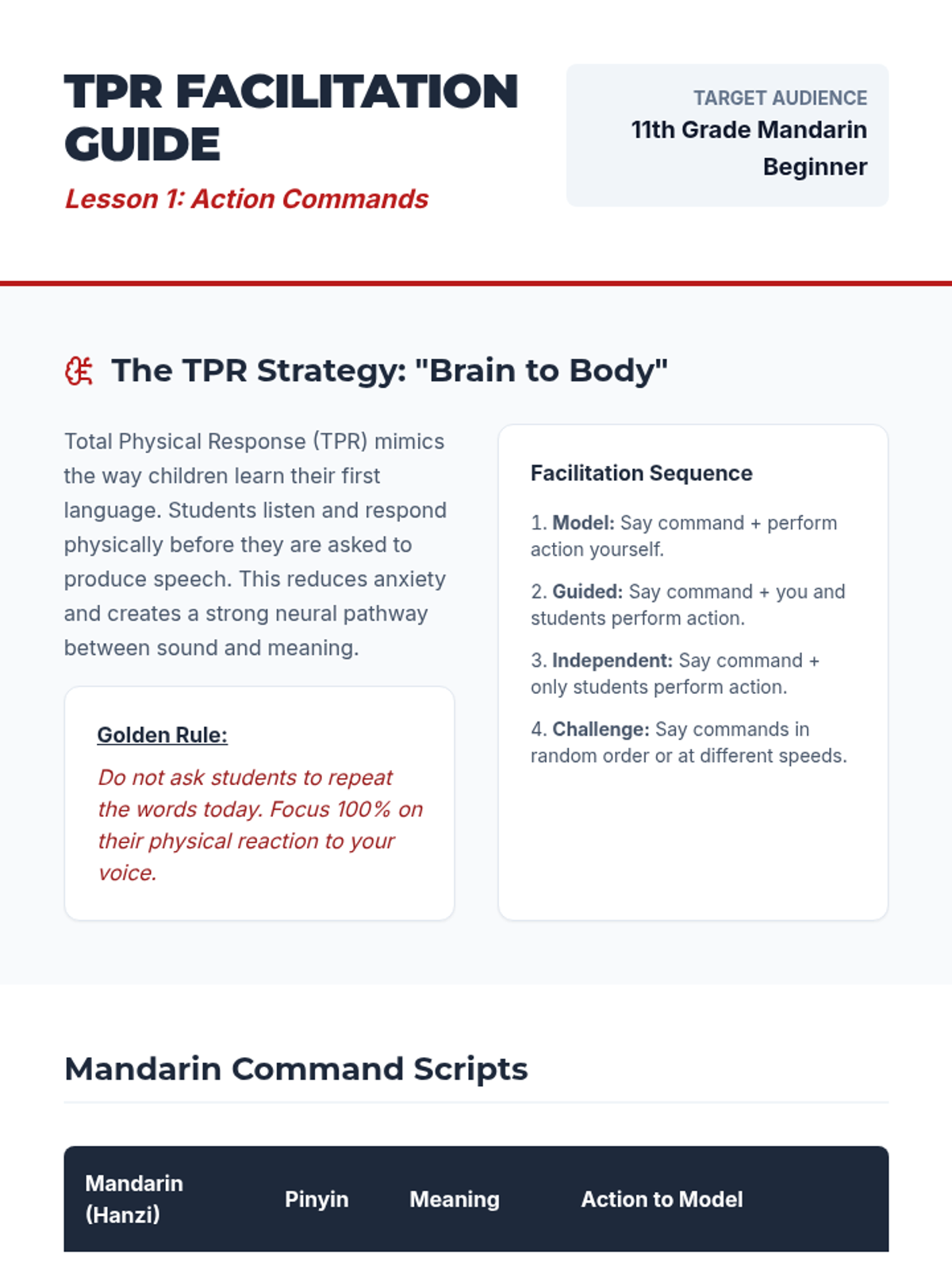 A TPR-based introductory course for 10th-grade Mandarin students focusing on immediate physical response to classroom imperatives and spatial directions. Students build direct comprehension between auditory Mandarin cues and physical actions, bypassing the need for translation.