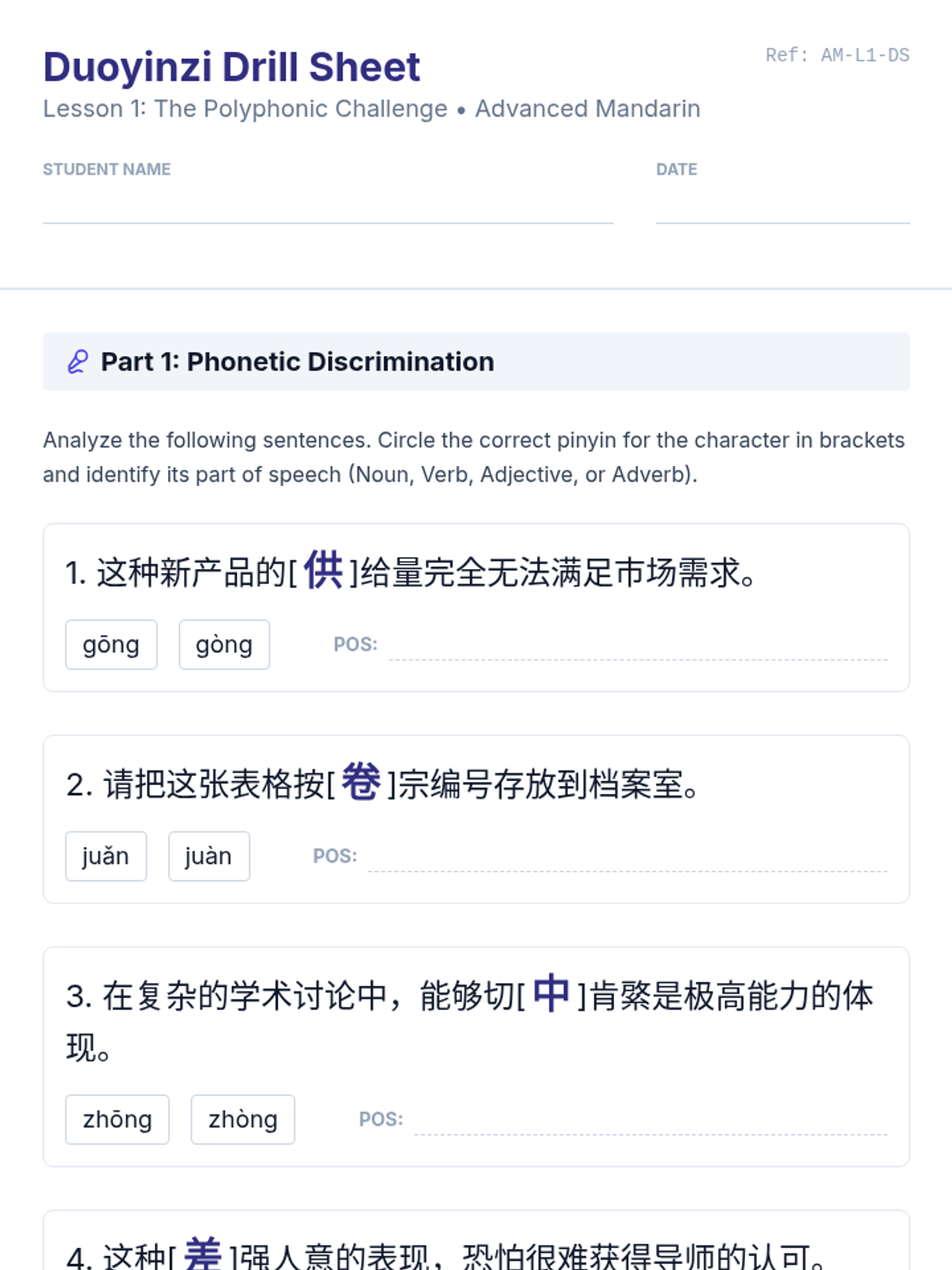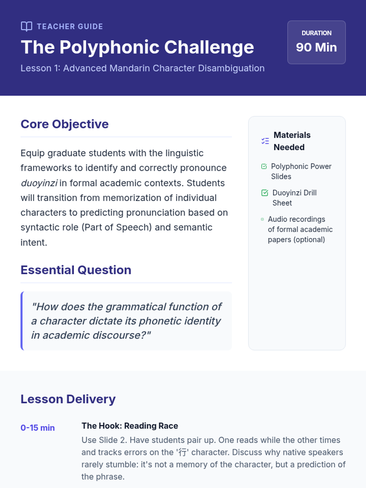 A graduate-level exploration of polysemous and polyphonic Mandarin characters, focusing on how context drives semantic and phonetic shifts in academic and literary discourse.
