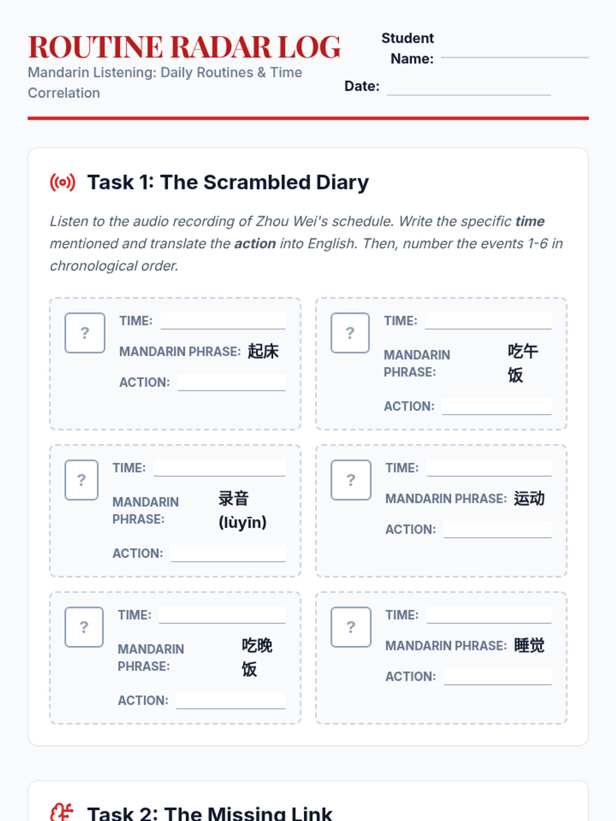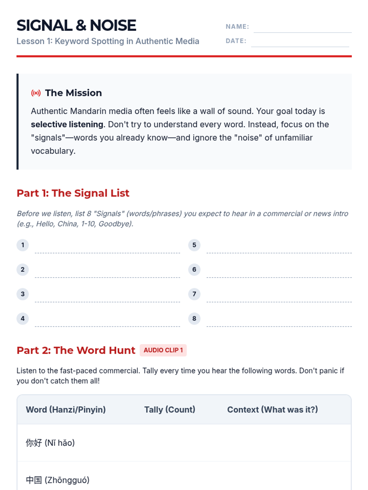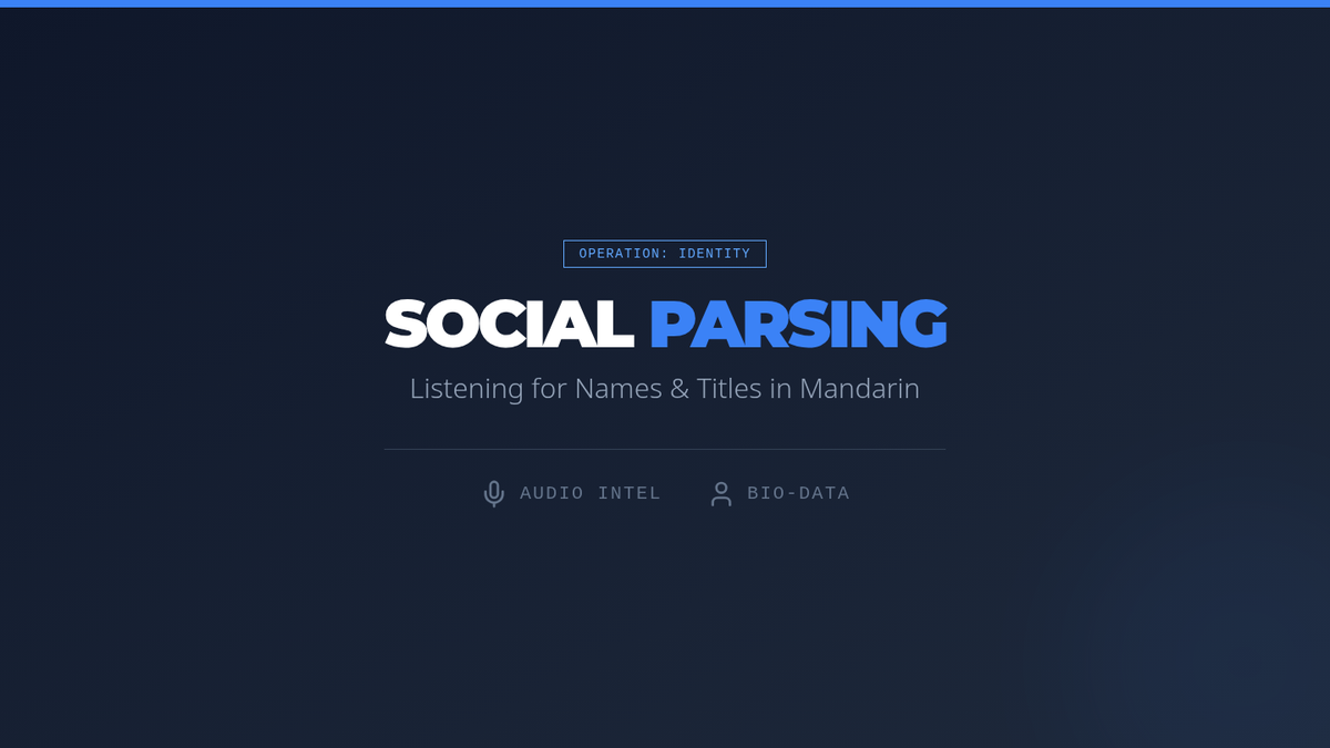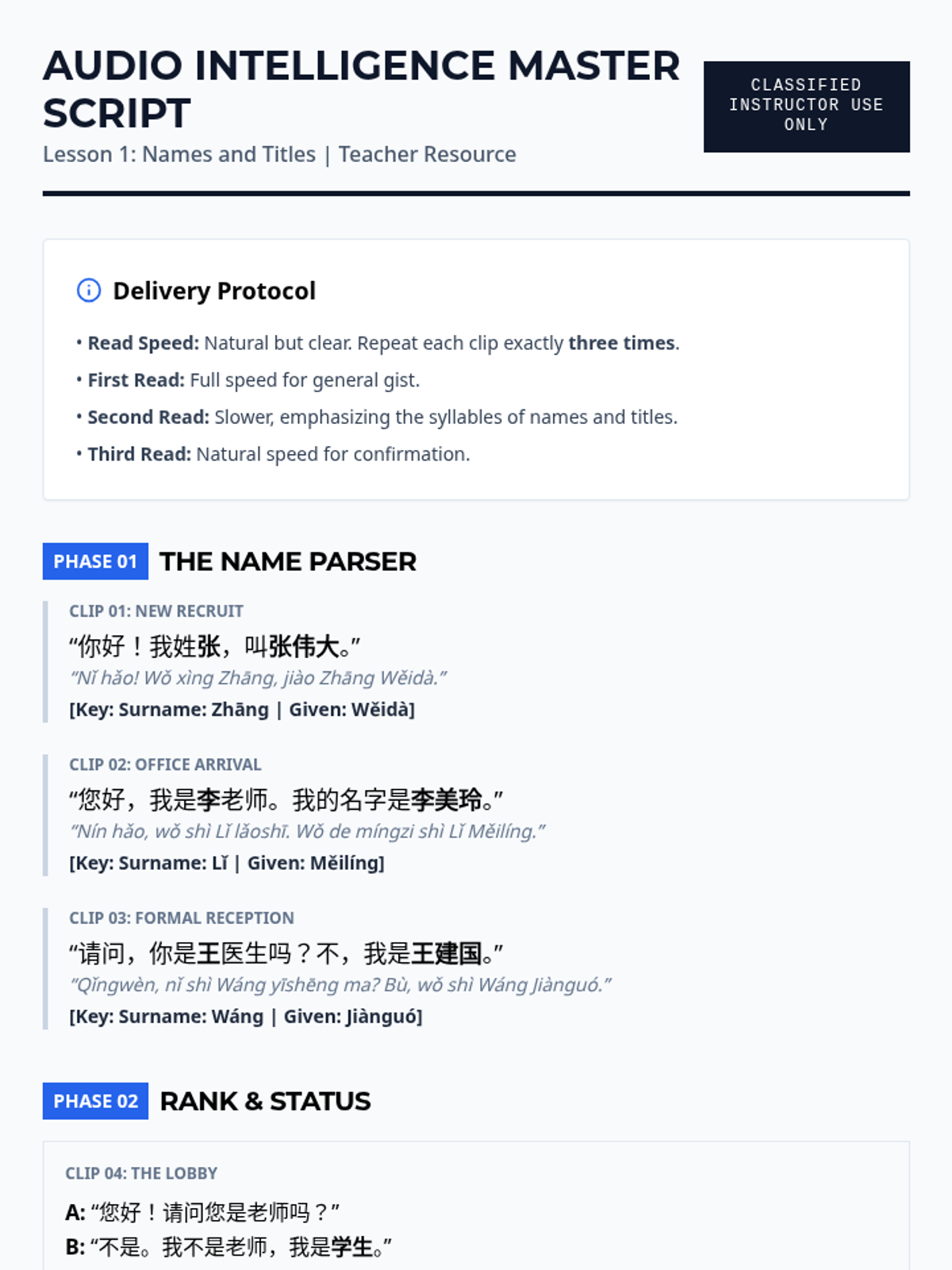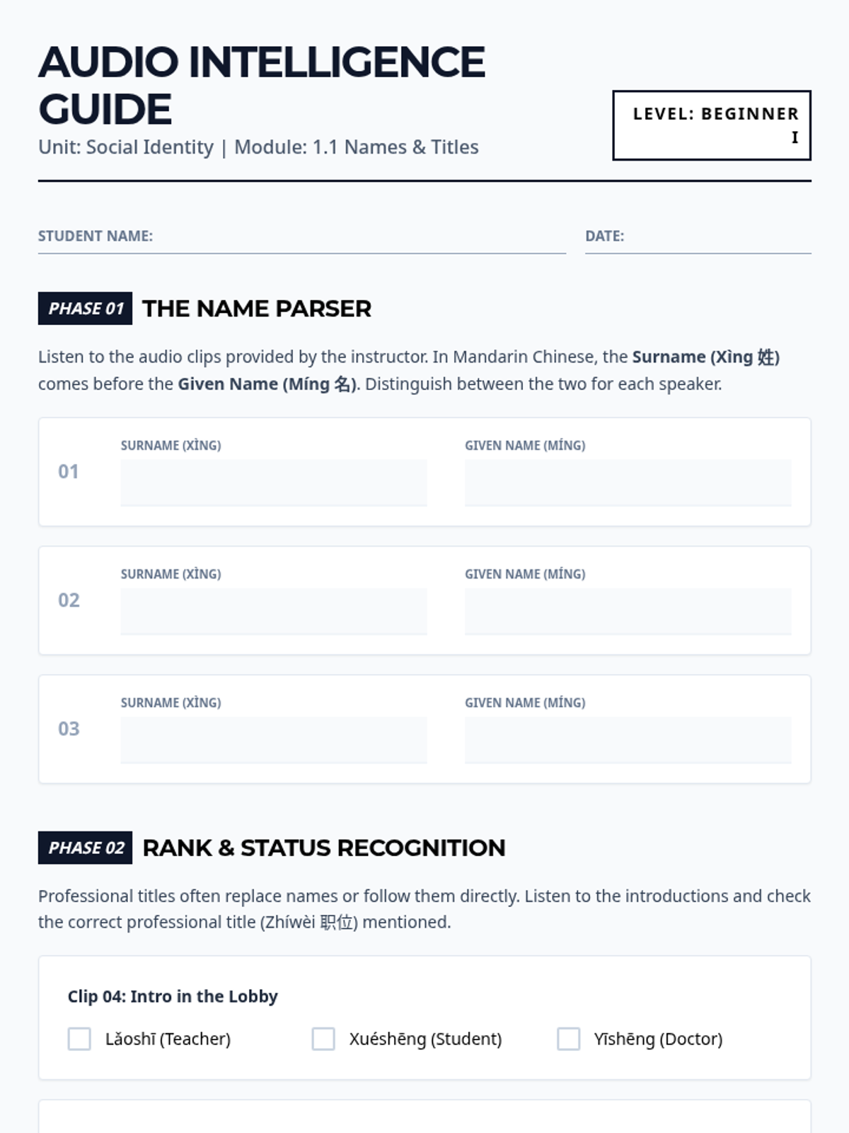 This sequence guides undergraduate students through the nuances of Mandarin Chinese listening, focusing on social identity, introductions, and kinship. Students move from basic name and title recognition to complex multi-person scenario comprehension using an intelligence-gathering aesthetic.