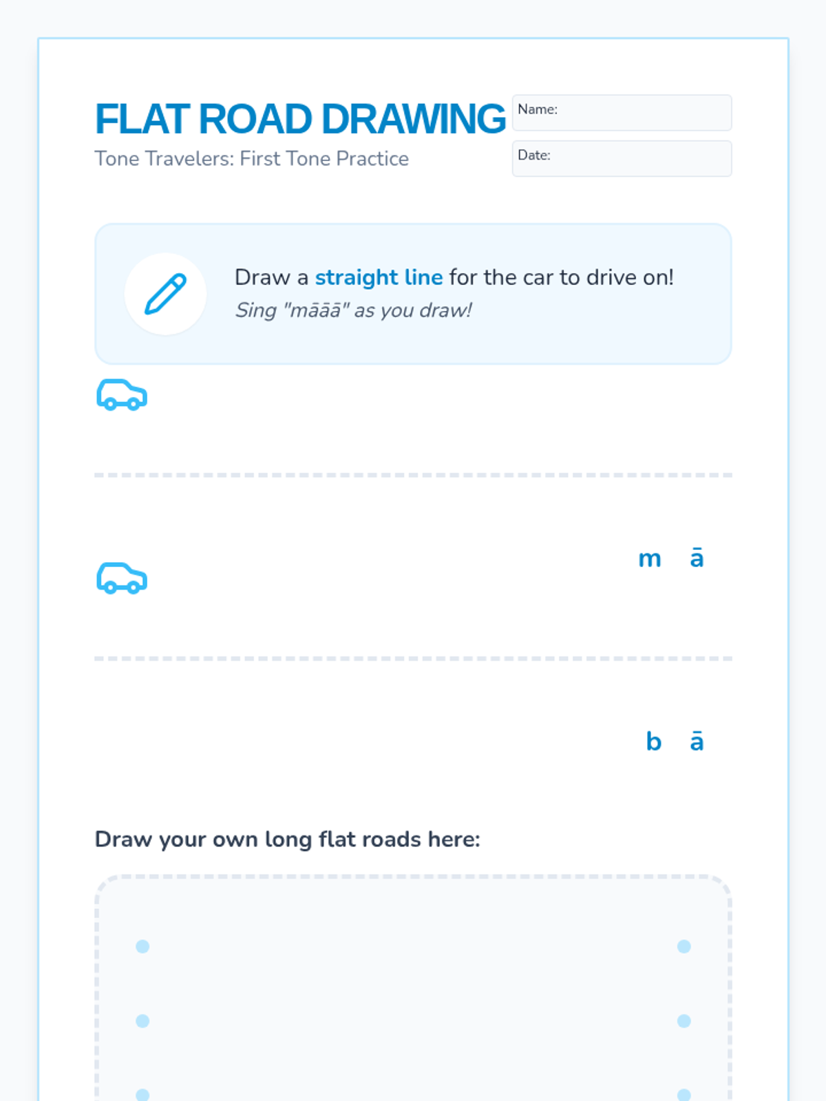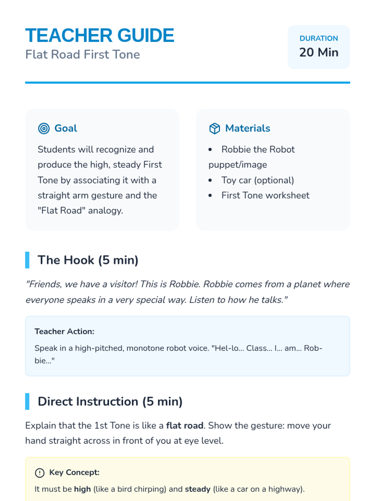 A physical and auditory introduction to the four Mandarin tones for Pre-K learners, using movement, animal analogies, and games to make pitch concrete.