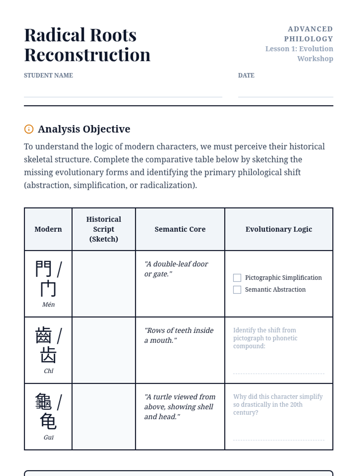 A graduate-level sequence exploring the philological evolution of Chinese characters, from Oracle Bone script to modern academic vocabulary, focusing on etymological logic to deepen semantic understanding.