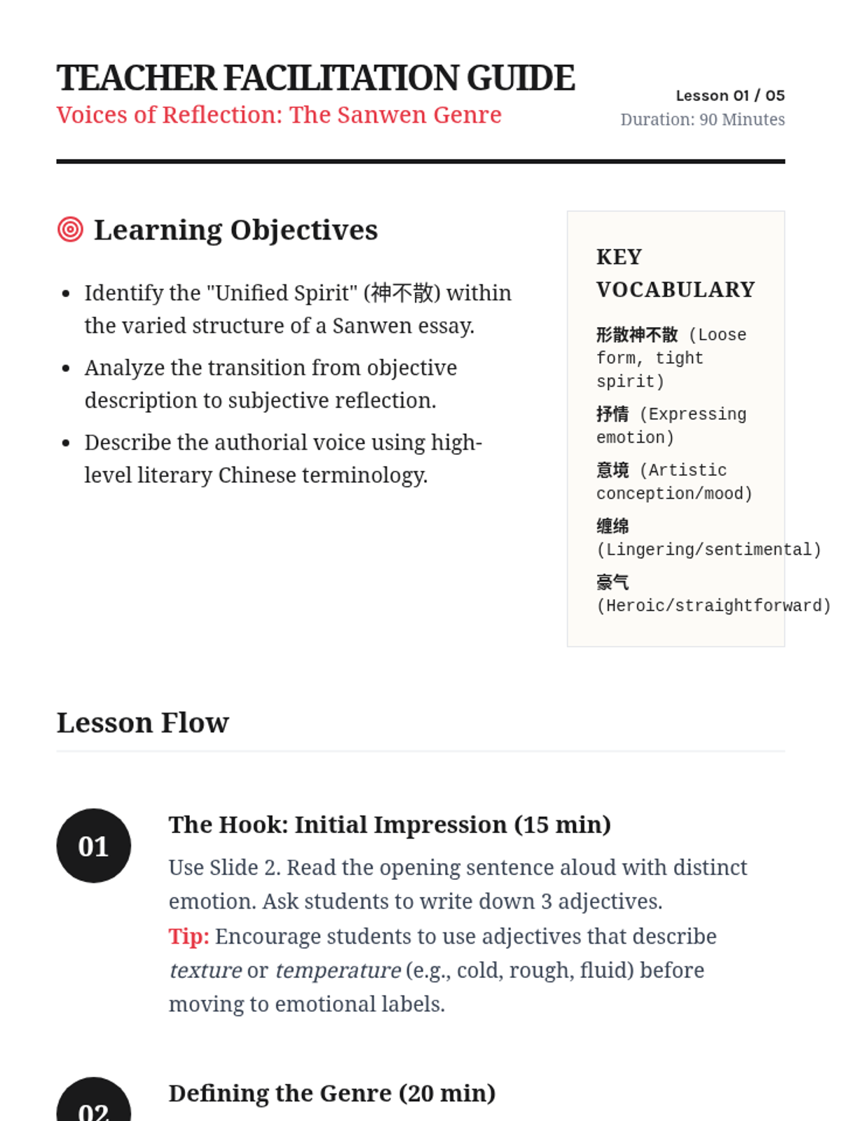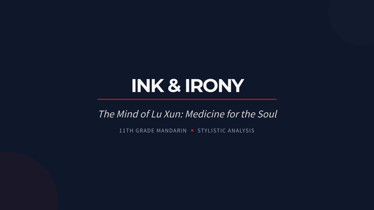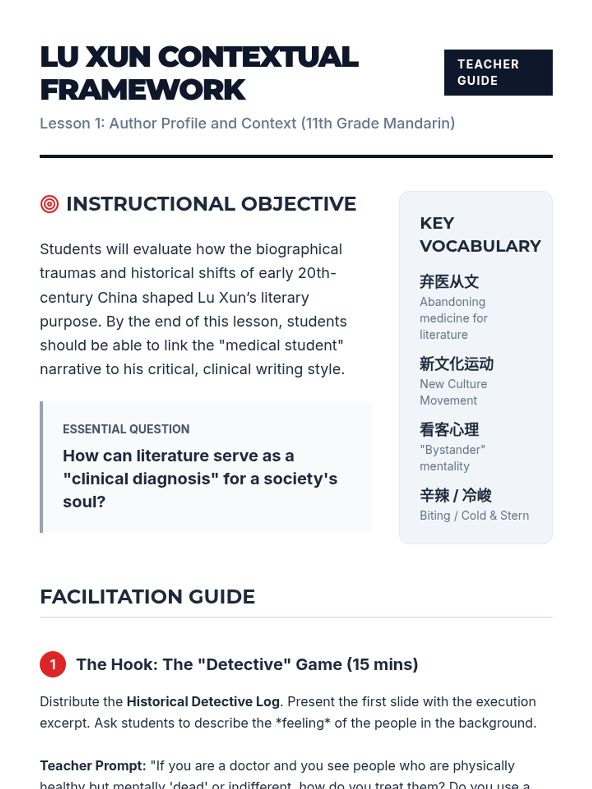 A project-based sequence for 11th Grade Mandarin students exploring stylistic analysis and creative adaptation through the works of Lu Xun. Students analyze historical context, dissect stylistic choices, and practice creative imitation to master the author's unique voice.