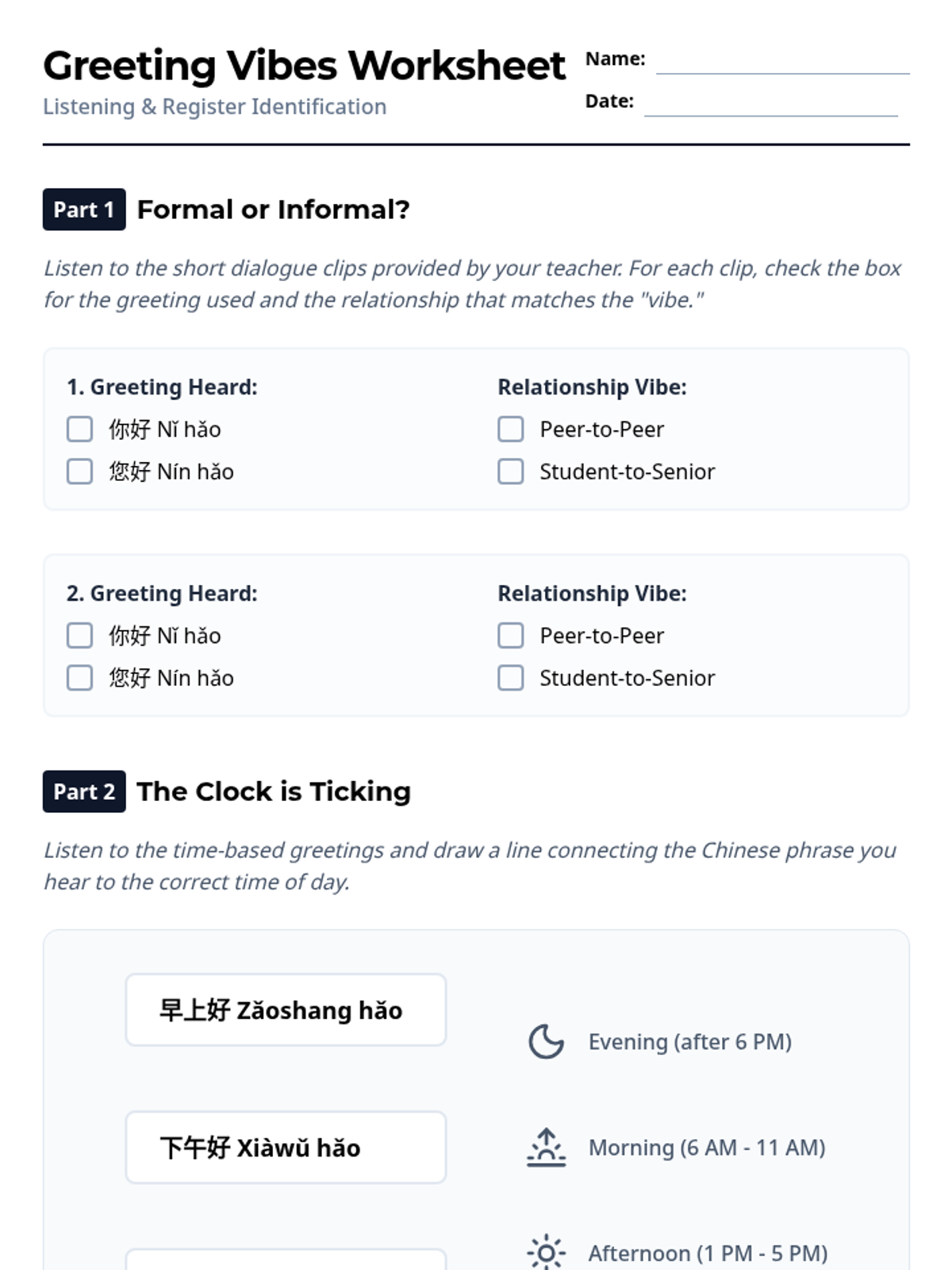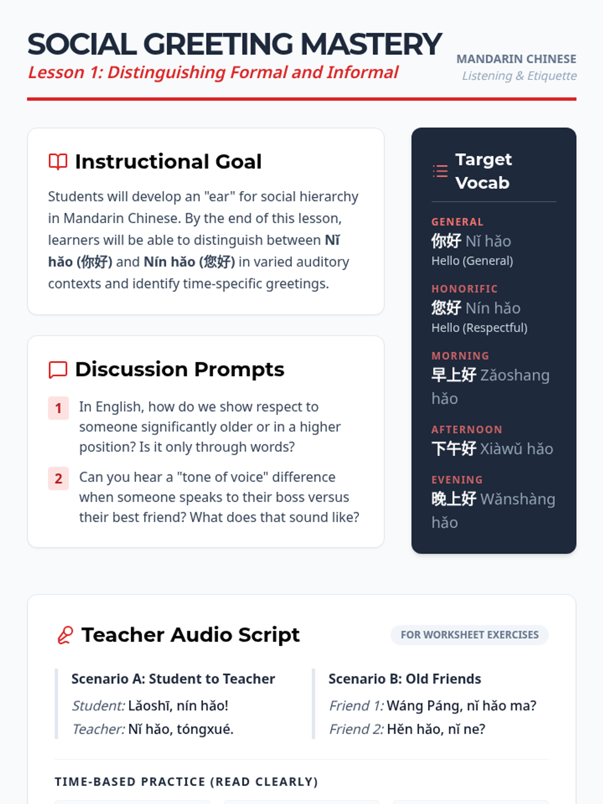 A beginner Mandarin Chinese listening sequence for 11th grade students focusing on the nuances of social greetings, names, nationalities, and professions. Students will develop the ability to distinguish formal and informal registers and extract biographical data from spoken introductions.