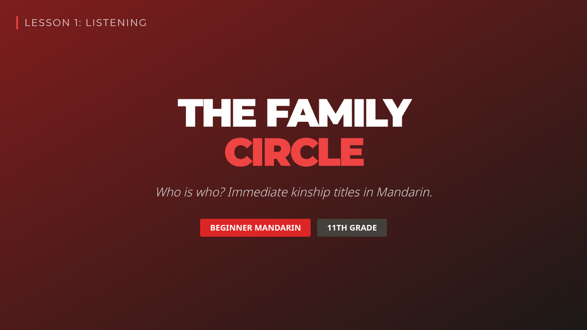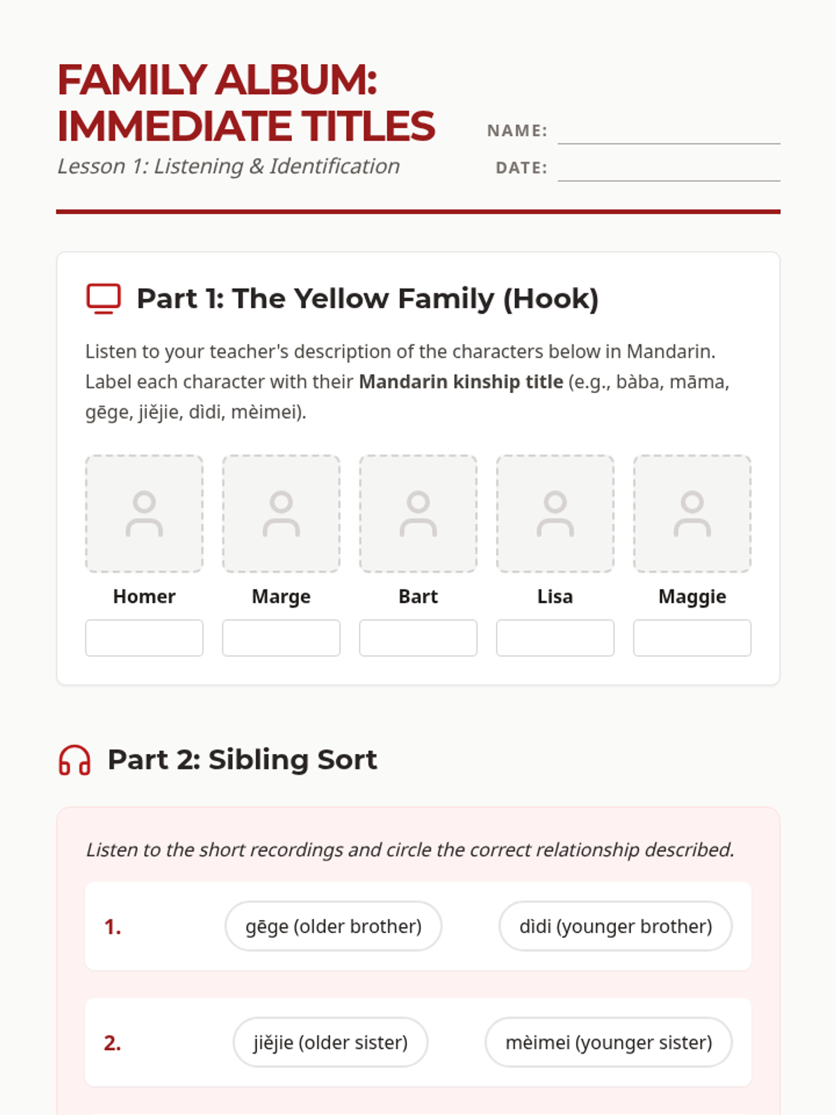 A comprehensive unit for 11th Grade Mandarin learners focusing on kinship terminology and descriptive adjectives. Students progress from basic family titles to complex relationship mapping and character analysis through immersive listening activities.
