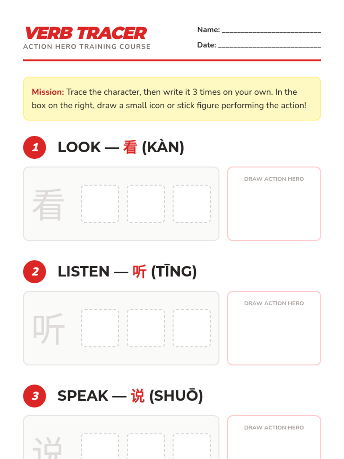 A beginner Mandarin Chinese sequence for 4th graders focusing on connecting written characters to physical actions and body parts through Total Physical Response (TPR). Students will progress from individual nouns and verbs to constructing simple Subject-Verb sentences.