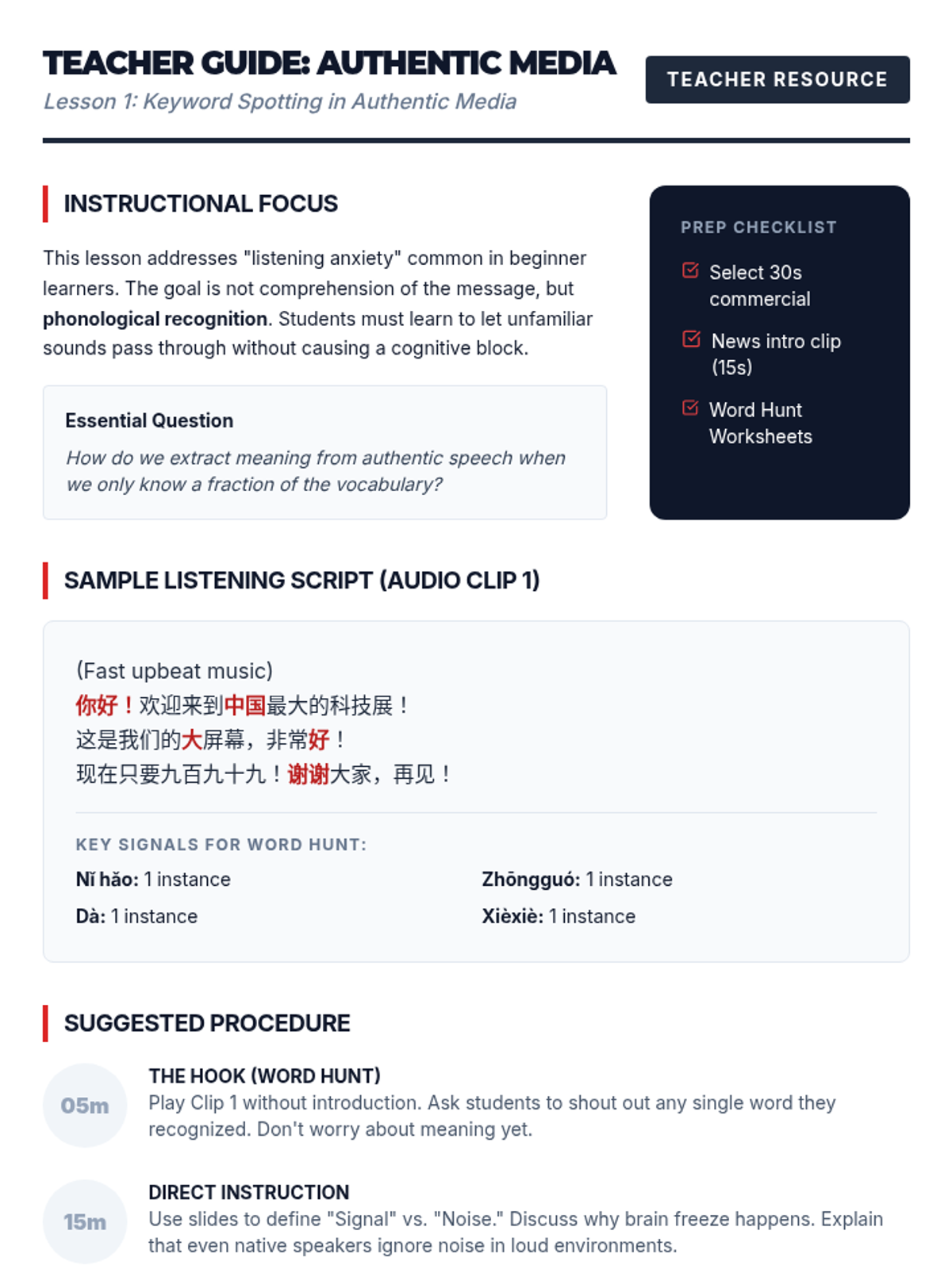 This sequence guides beginner Mandarin learners through 'bottom-up' listening strategies using authentic media. Students will learn to filter out 'noise' to identify keywords in weather reports, pop songs, and food vlogs, building their tolerance for ambiguity and real-world comprehension skills.