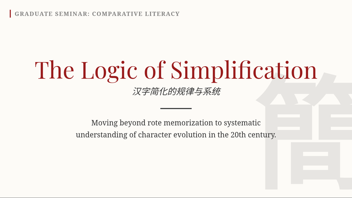 An advanced graduate-level course exploring the systematic relationship between Simplified and Traditional Chinese characters. Students master conversion logic, radical shifts, and regional lexical differences to achieve high-level literacy across the Sinosphere.