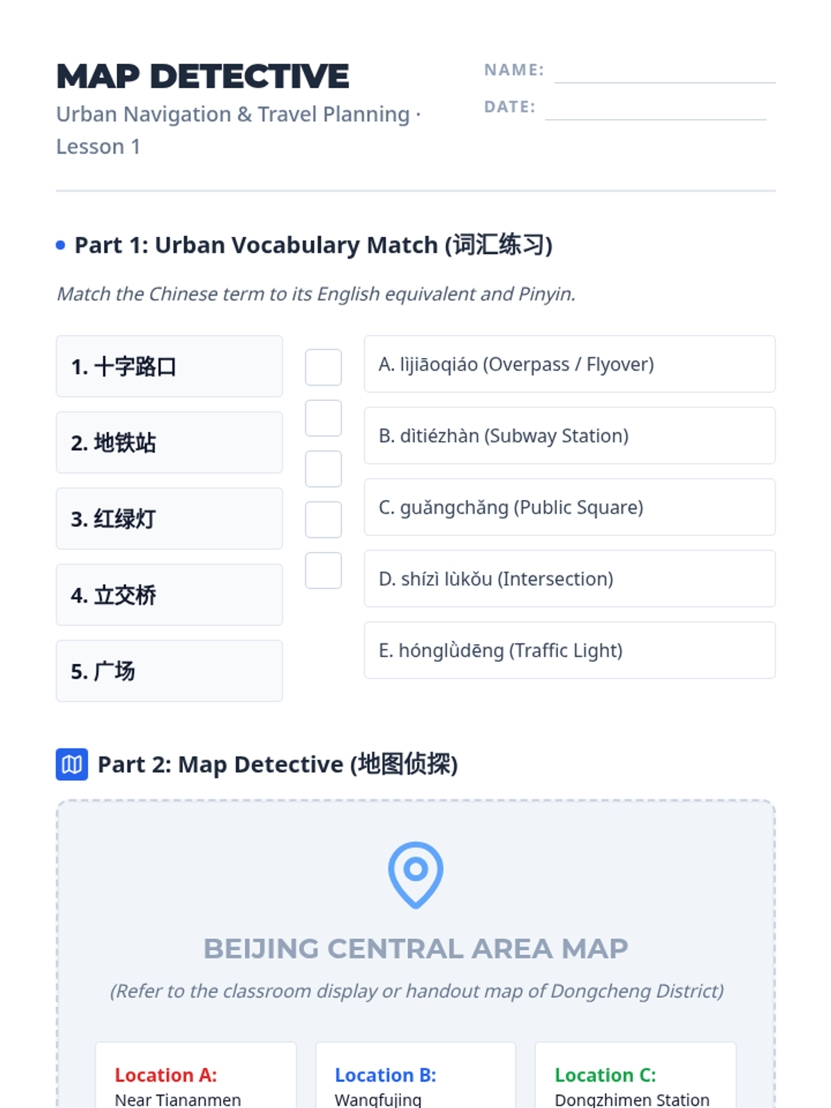 This sequence builds navigational confidence for independent travel in Mandarin-speaking cities, focusing on urban infrastructure, directional complements, and public transportation. Students will progress from identifying landmarks to presenting a complete multi-stop travel itinerary.