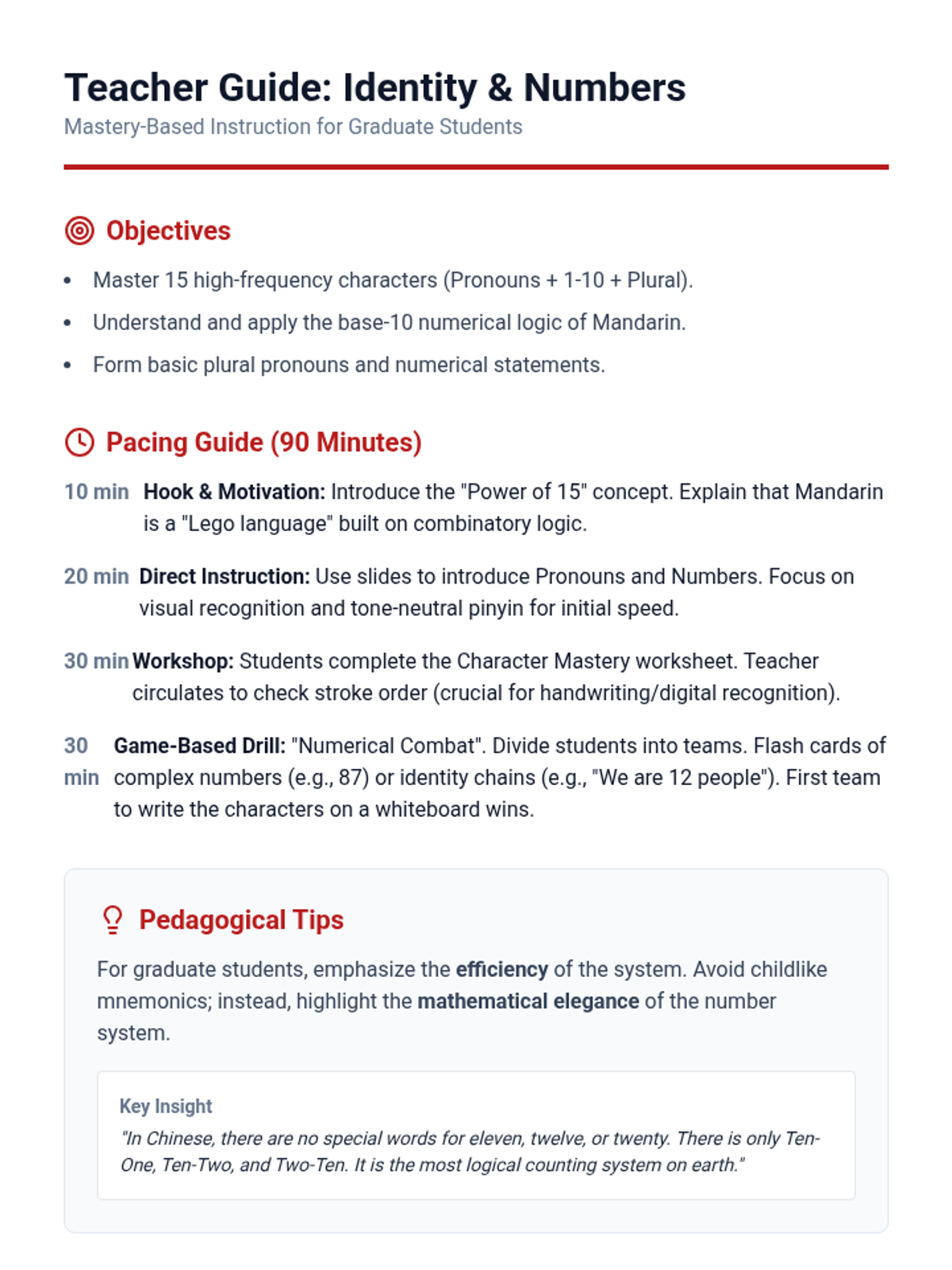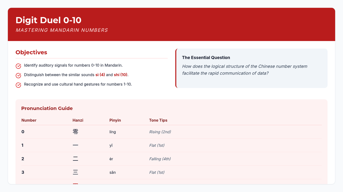 This sequence focuses on the cognitive processing of numerical data in Mandarin Chinese, moving from basic digits to complex phone numbers, calendar dates, clock times, and marketplace currency. Students will develop rapid auditory recognition through gamified scenarios like emergency dispatch, time travel, and transit scheduling.