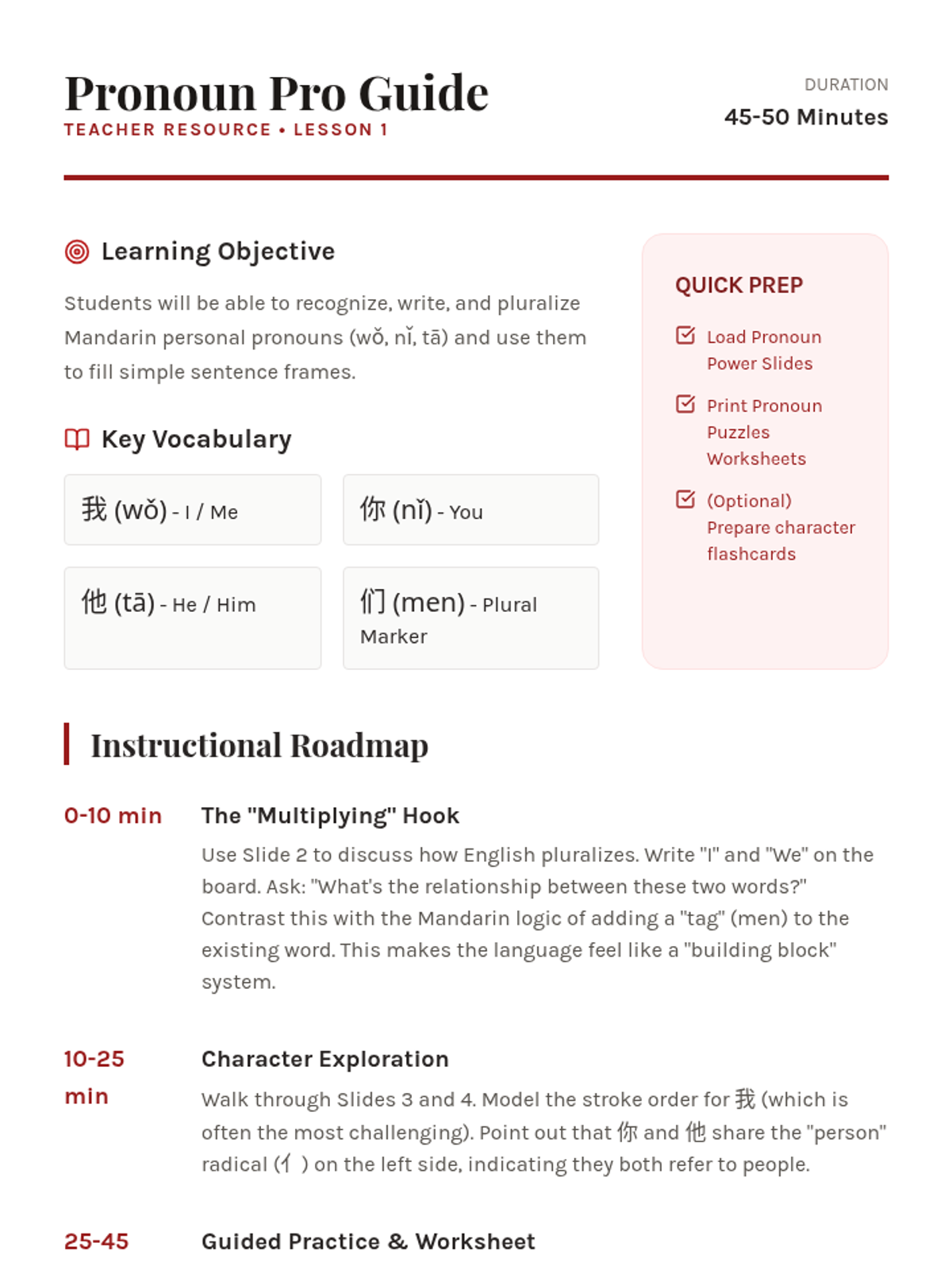 A 5-lesson sequence for 6th Grade Mandarin Chinese focusing on pronouns, basic sentence structures (SVO), and personal introductions using high-frequency characters. Students progress from individual characters to full sentence construction and identity expression.