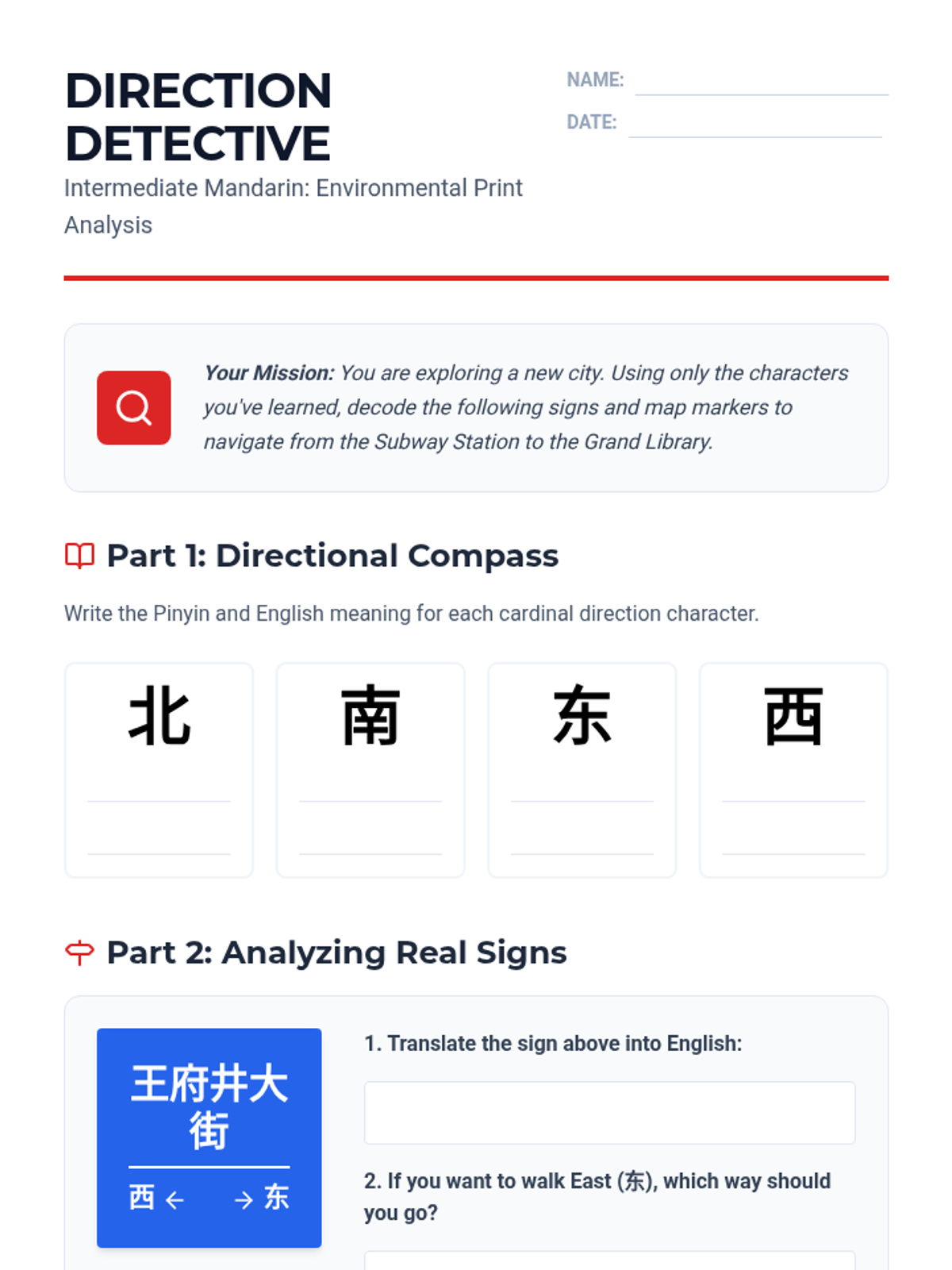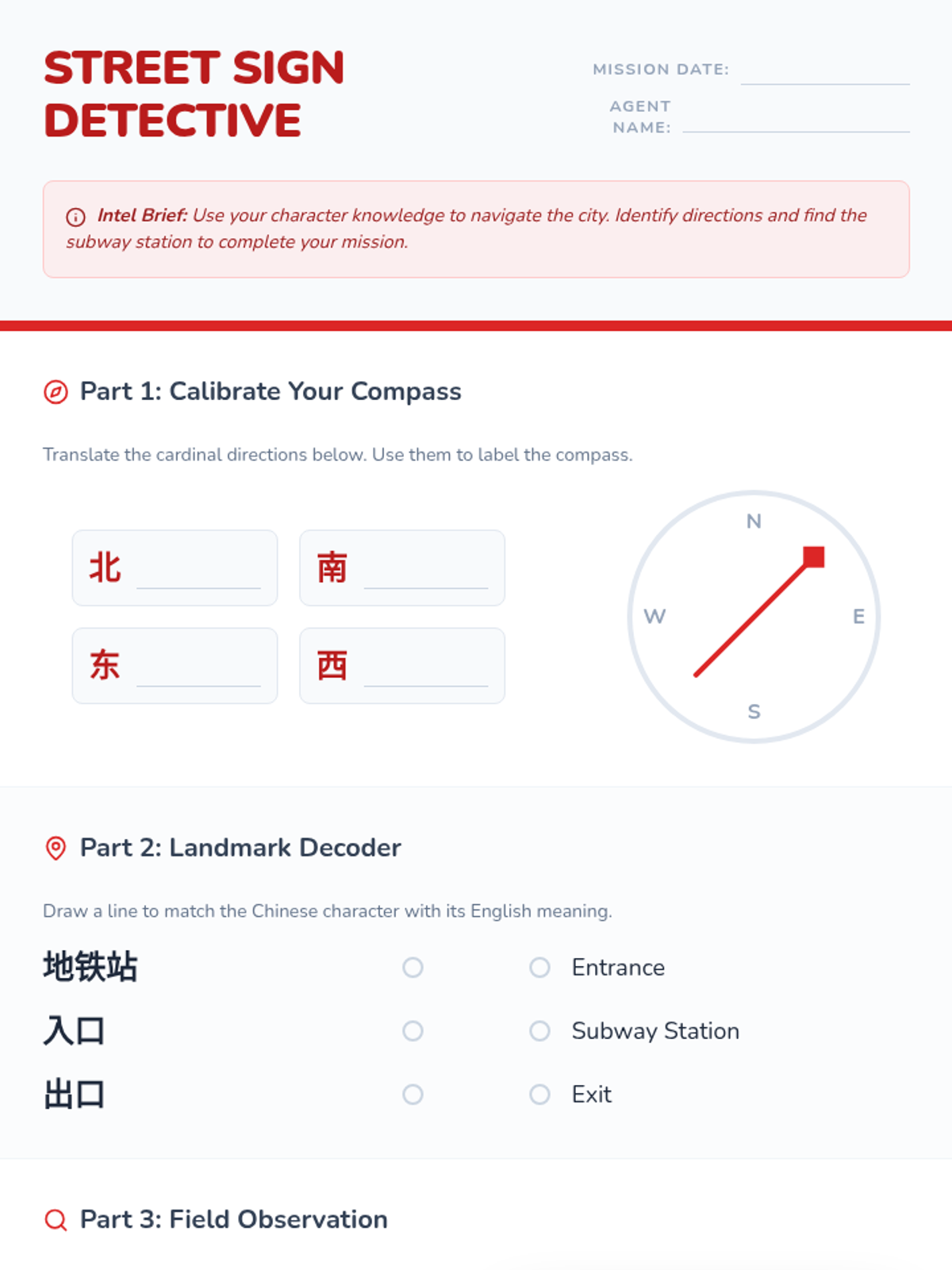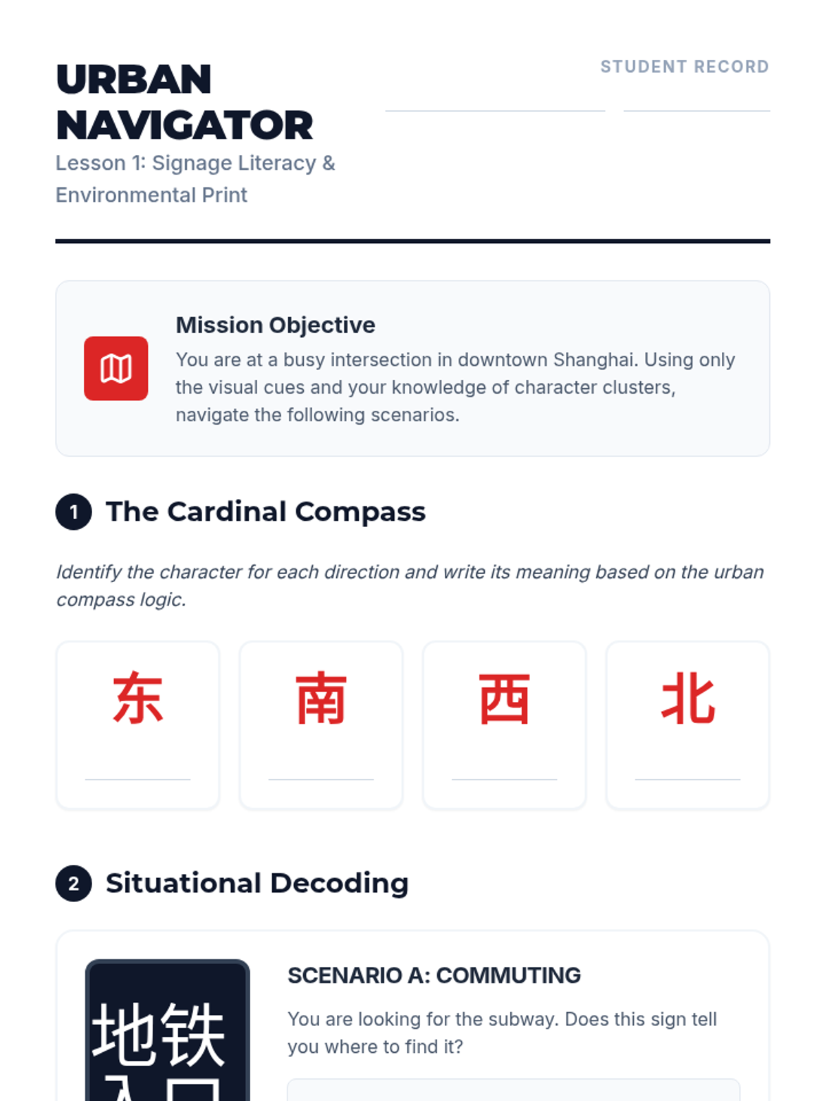 A project-based sequence for 7th-grade students focusing on interpreting authentic Mandarin Chinese texts, including street signs, menus, stylized fonts, and digital interfaces. Students apply character recognition skills to real-world survival scenarios and create a final travel guide.