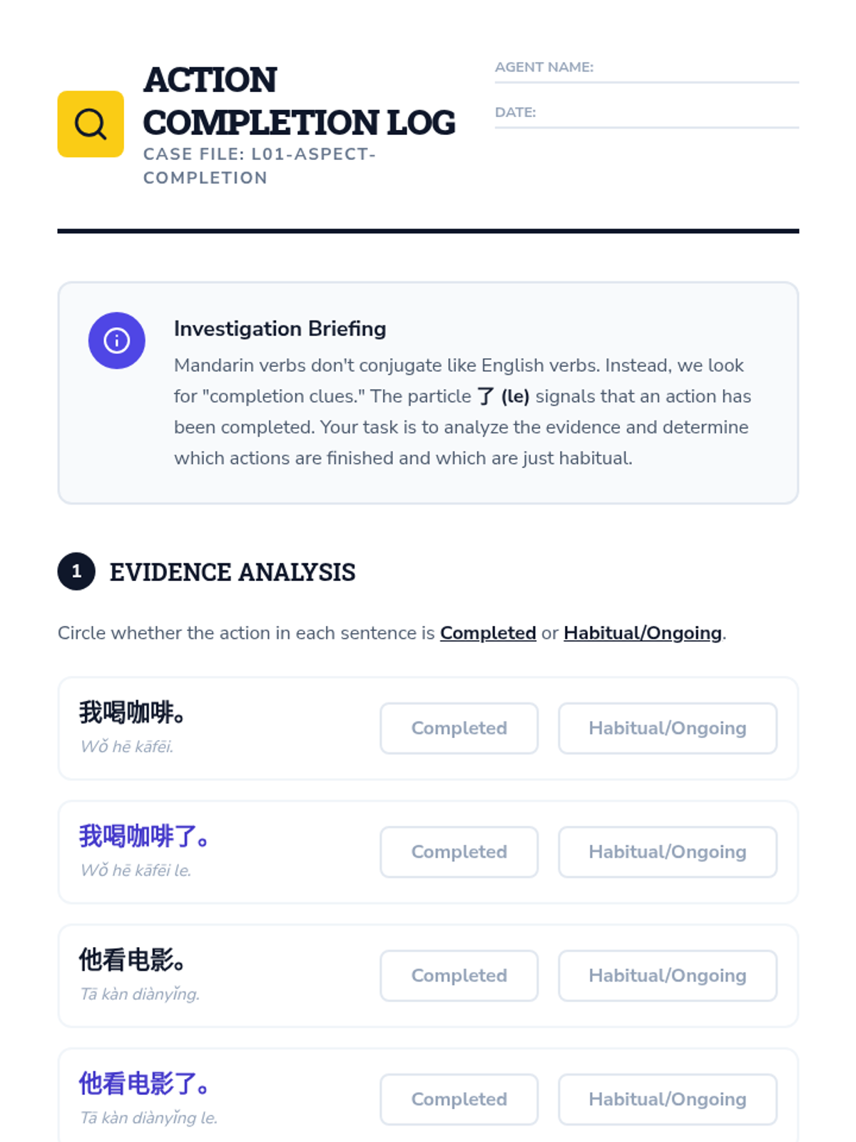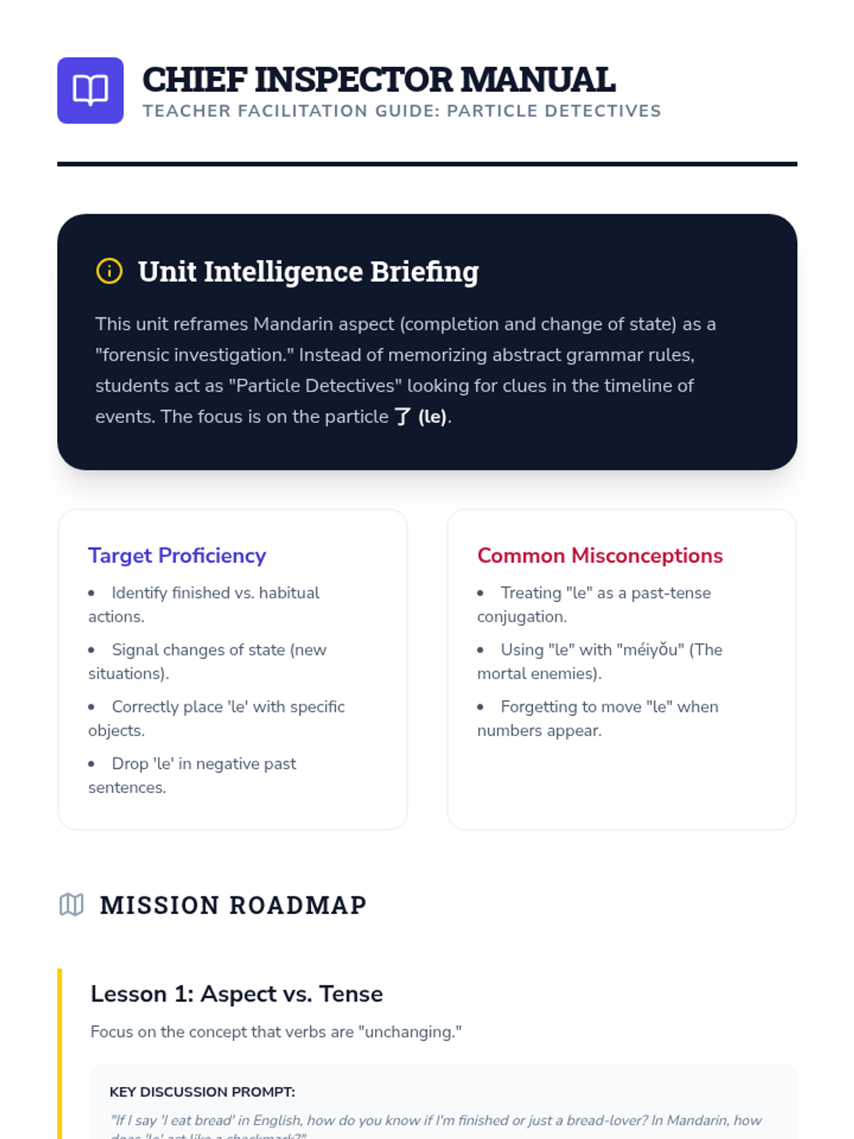 A comprehensive sequence for 7th-grade students on the Mandarin Chinese particle 'le', focusing on aspect, change of state, syntax with objects, and negation through a detective-themed narrative.