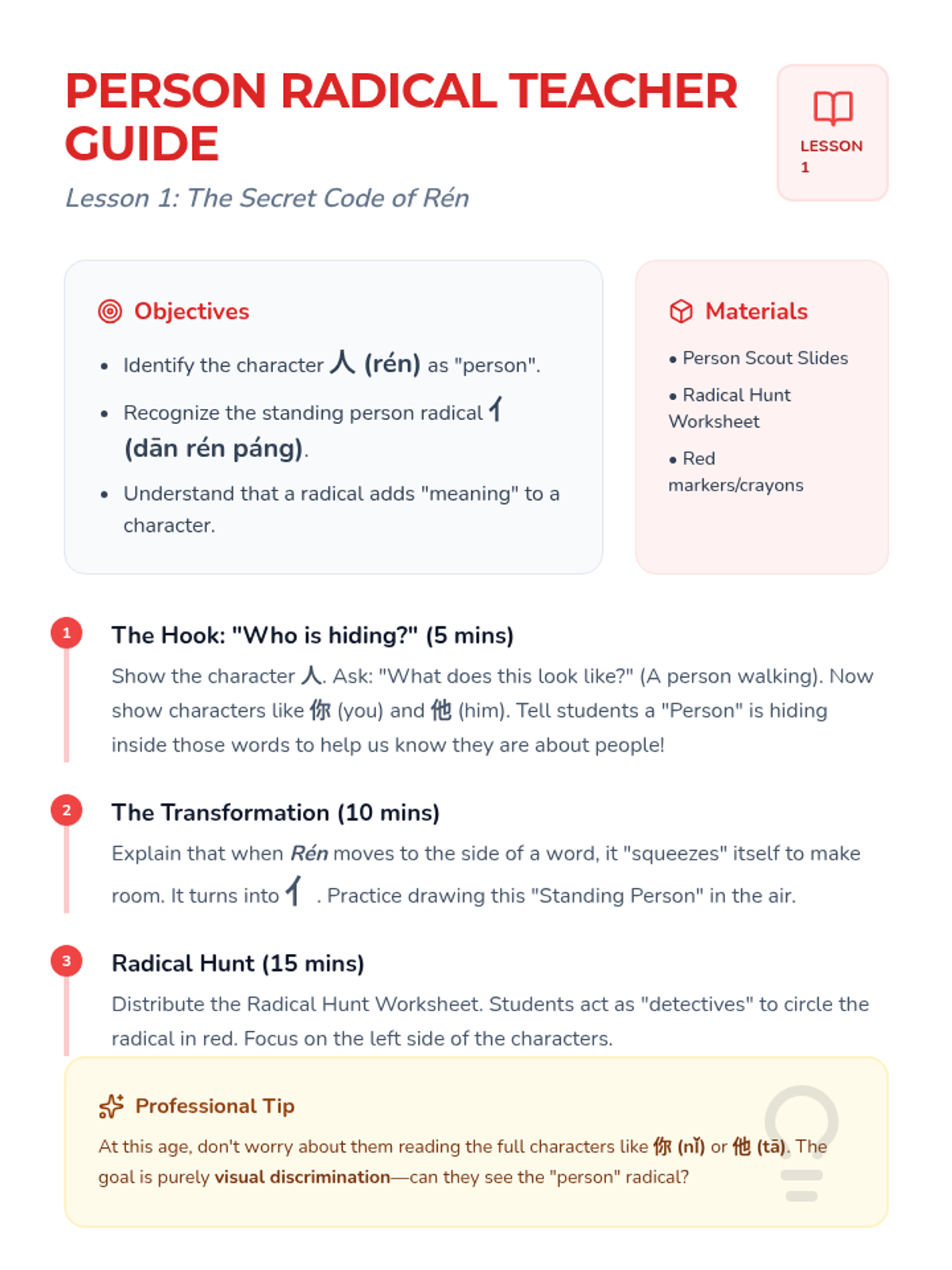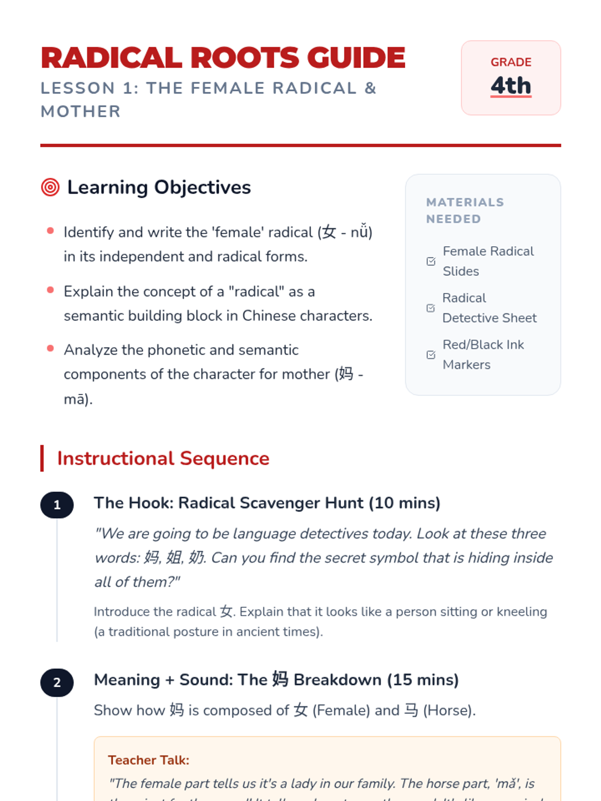 This sequence introduces 1st-grade students to Mandarin Chinese radicals through the lens of family hierarchy. Students learn how the 'Person' and 'Female' radicals act as building blocks for characters representing family members, culminating in a creative family tree project.