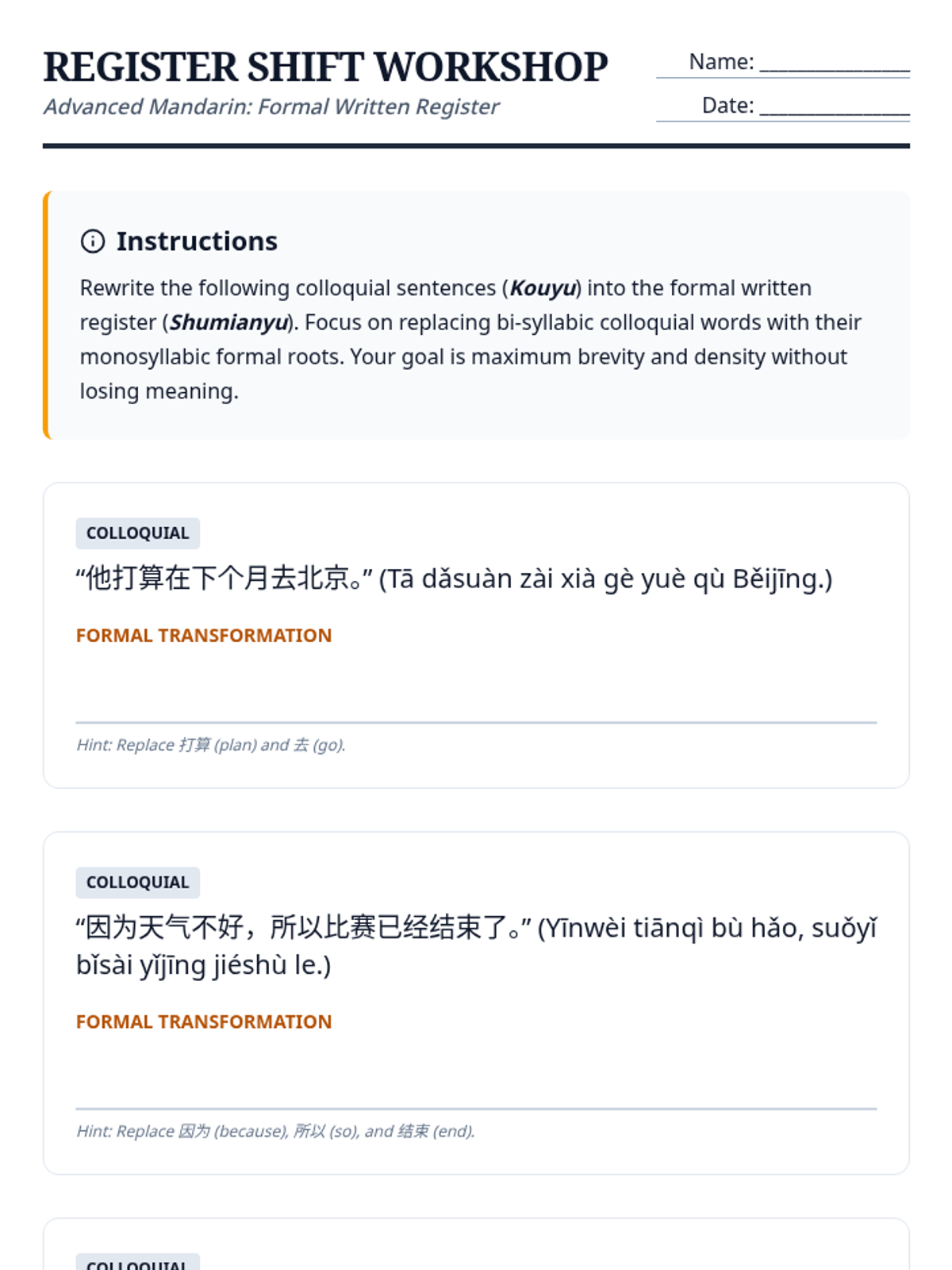 A comprehensive unit for advanced Mandarin learners focusing on the transition from colloquial speech to formal academic and bureaucratic written Chinese (Shumianyu). Students will master formal vocabulary, complex syntax, and stylistic registers.