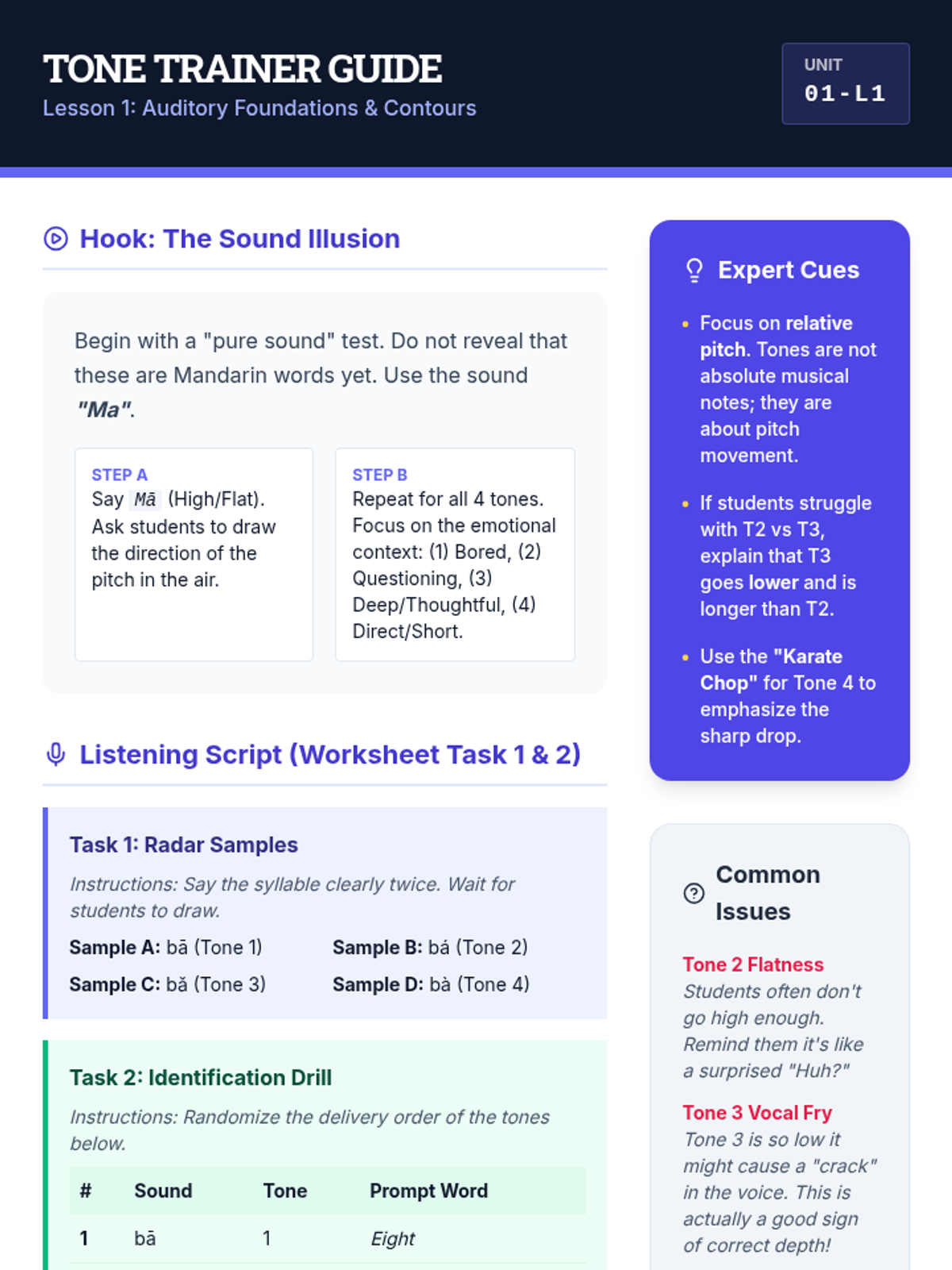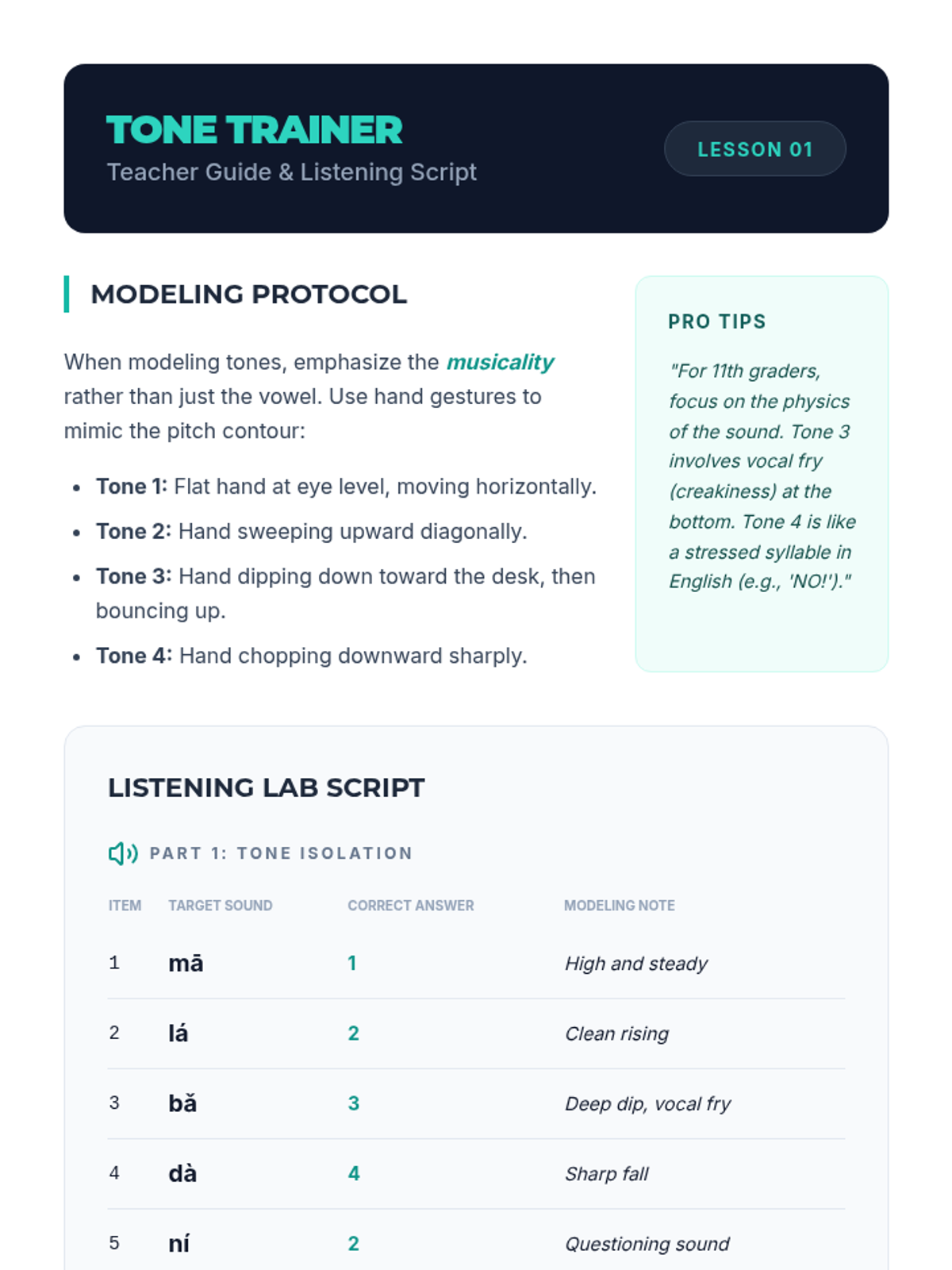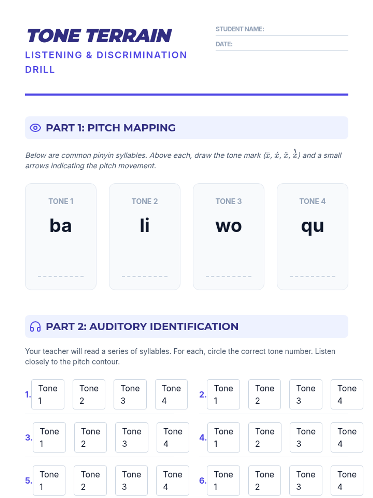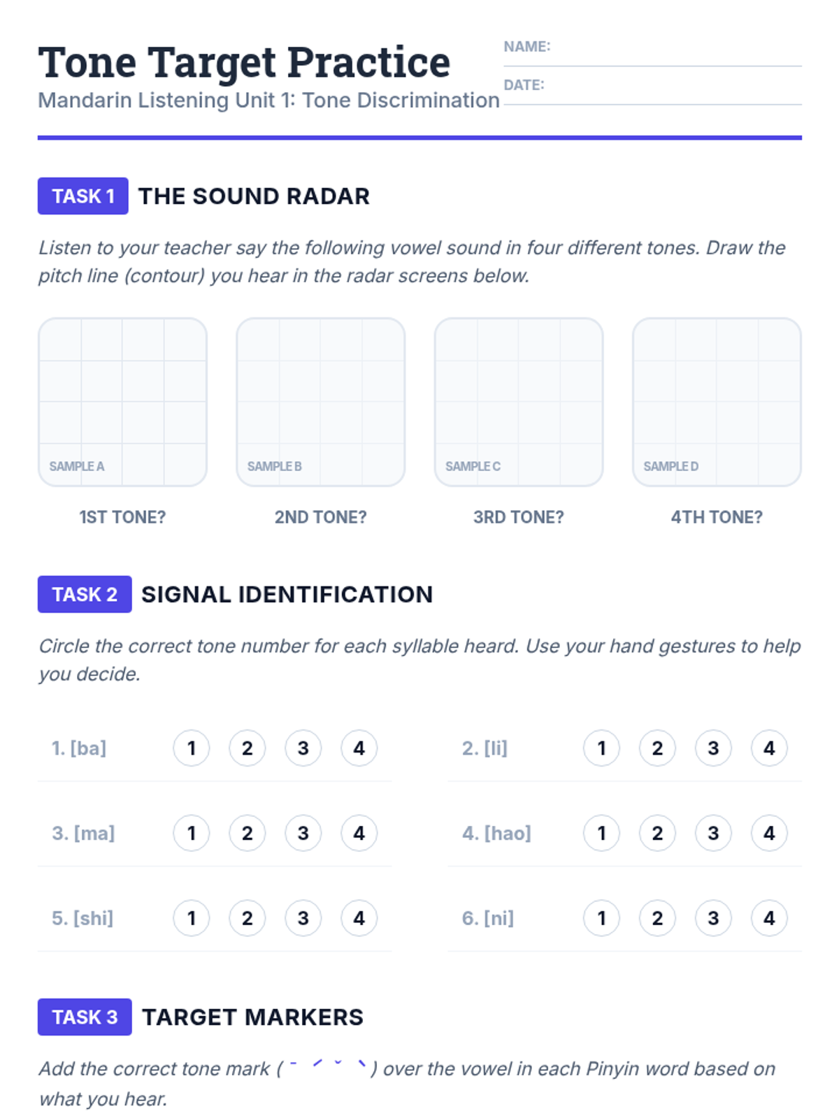 This foundational sequence for 11th-grade Mandarin students focuses on auditory discrimination, tonal accuracy, and Pinyin phonetics. Students move from basic tone recognition to complex sandhi rules and contextual comprehension, emphasizing the critical link between sound and meaning.