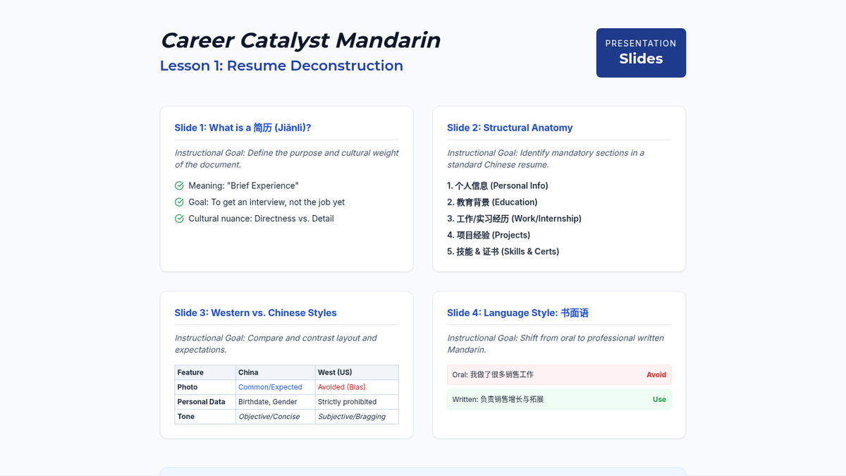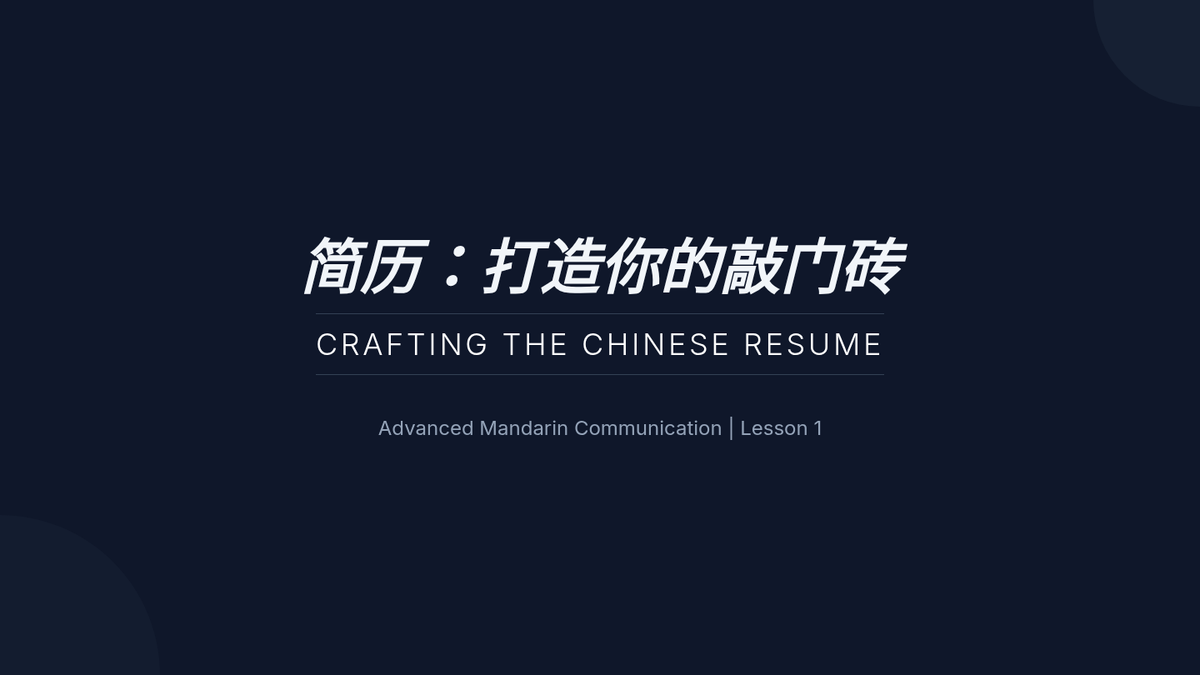A comprehensive unit for advanced Mandarin students to master the professional skills needed for the Chinese job market, covering resume writing, self-introductions, and cultural interview etiquette.