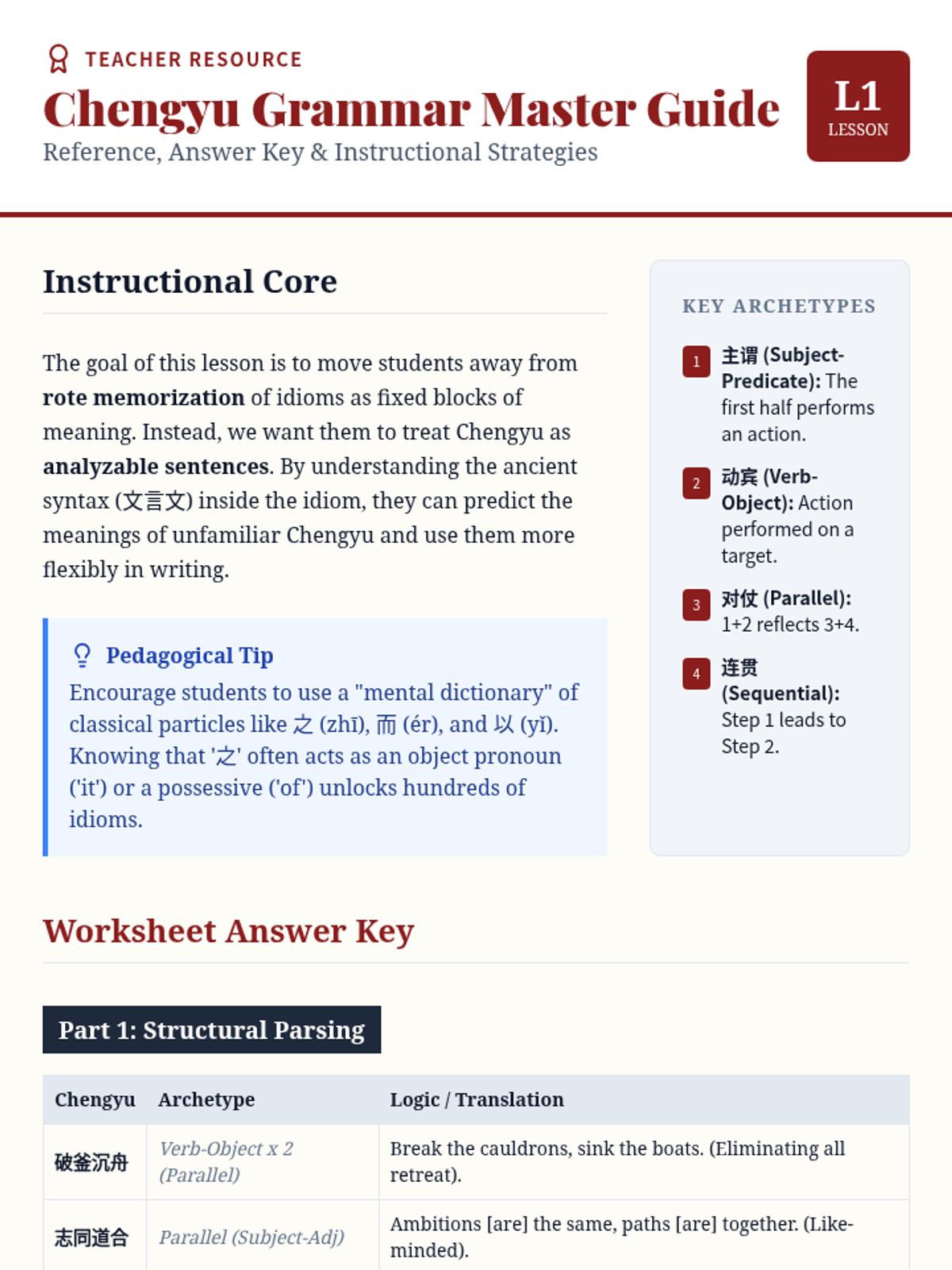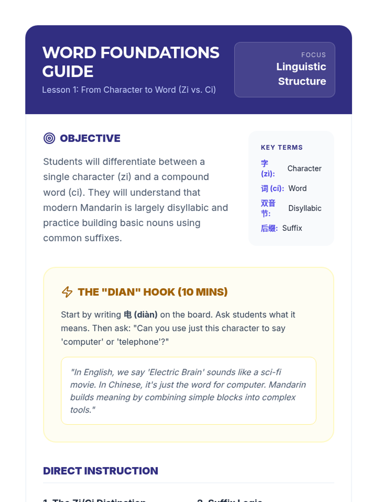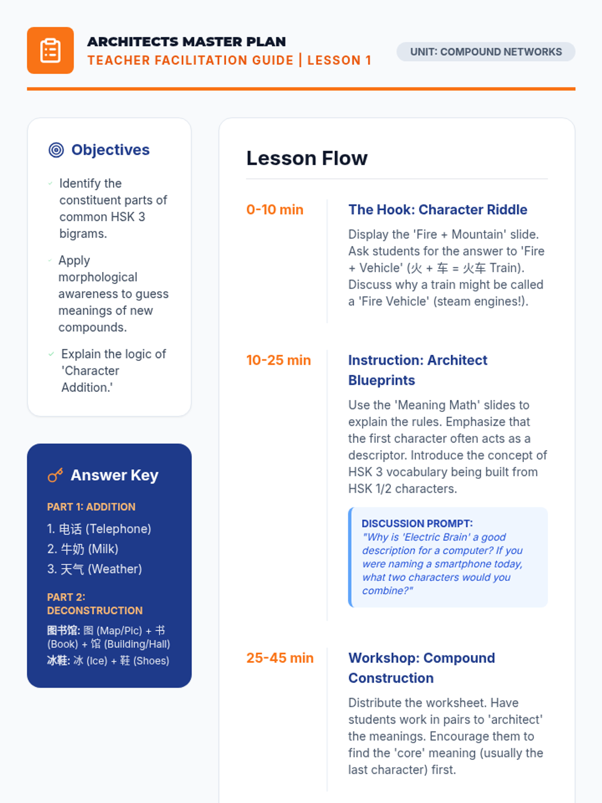 A 5-lesson sequence for 7th-grade Mandarin students focusing on the logic of compound words, from simple bigrams to complex idioms (chengyu). Students act as 'Character Architects,' deconstructing and rebuilding vocabulary to master intermediate HSK 3 concepts.