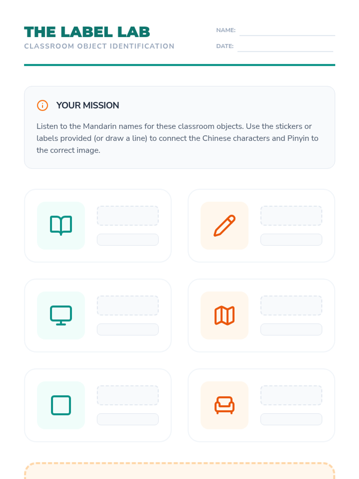 A project-based sequence for 7th graders to master basic Mandarin characters through their school environment. Students progress from naming individual objects to designing and labeling a complete classroom layout.
